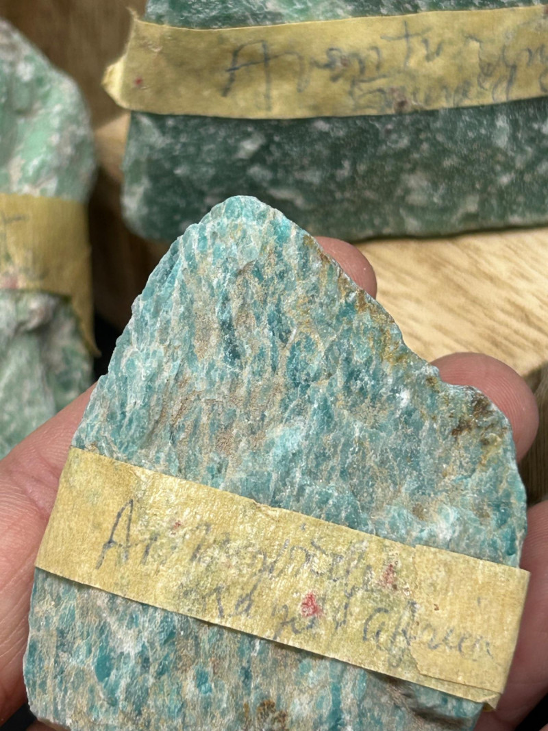 Forms in silica‑rich hydrothermal systems; the red inclusions are hematite or jasper. Amazonite is a green to blue‑green variety of microcline feldspar.