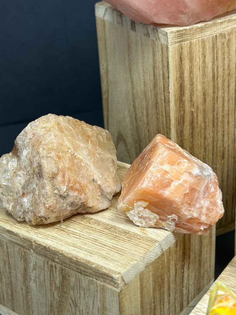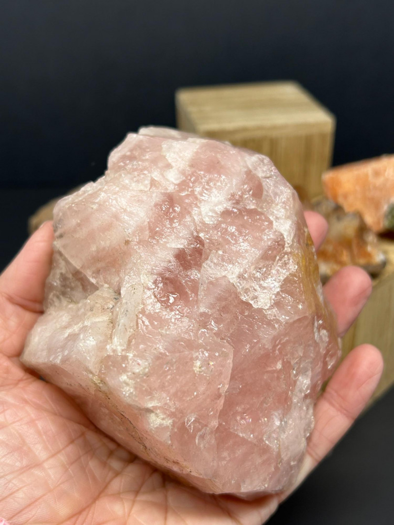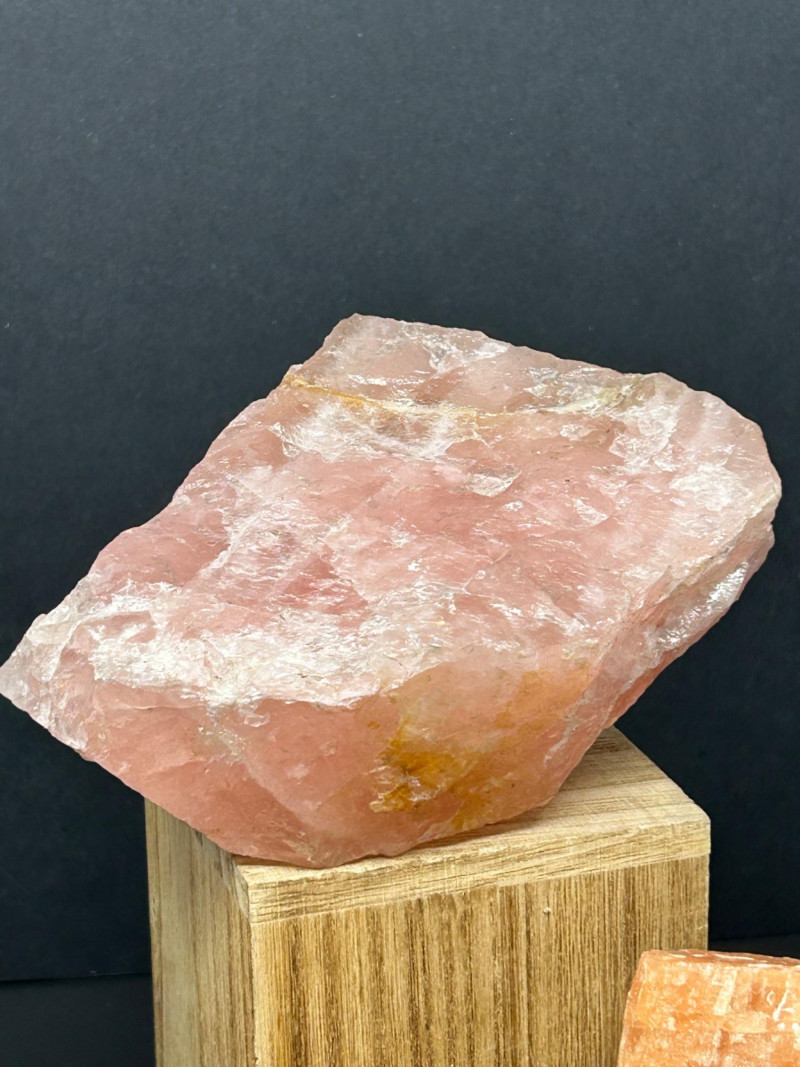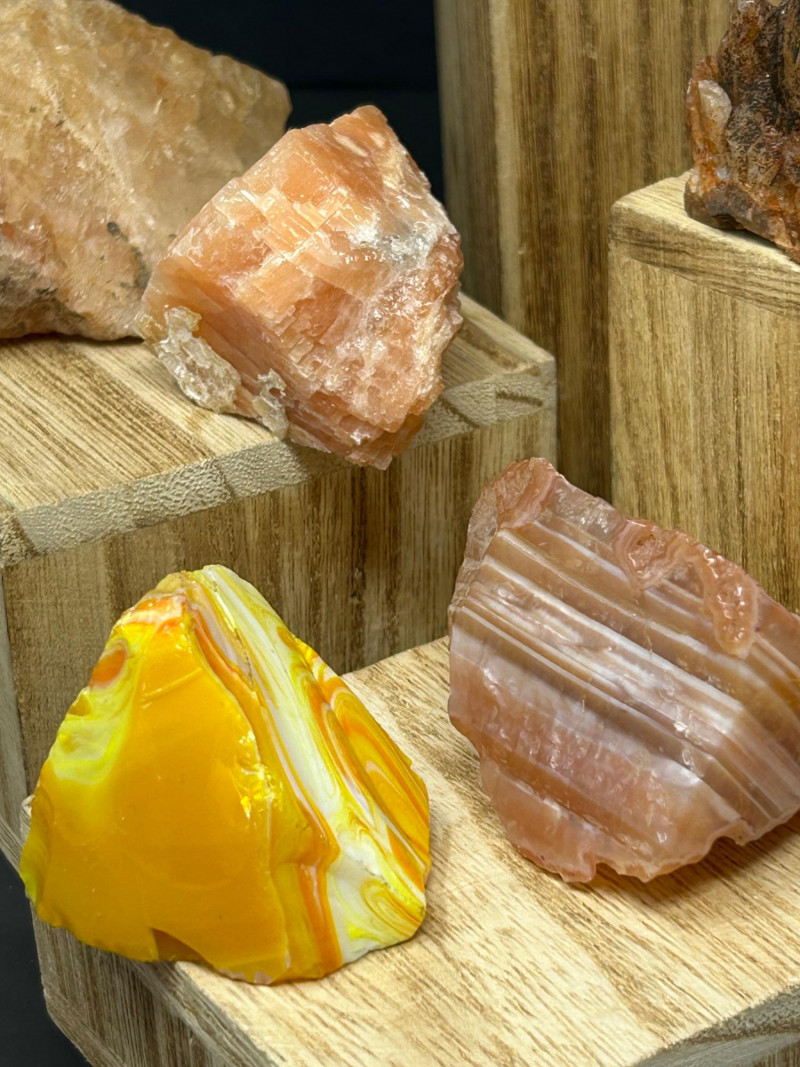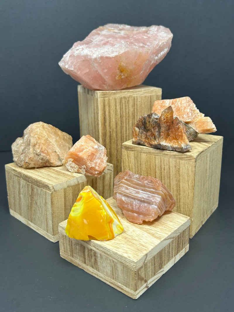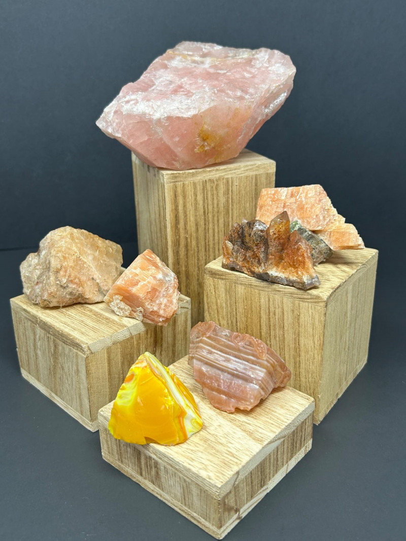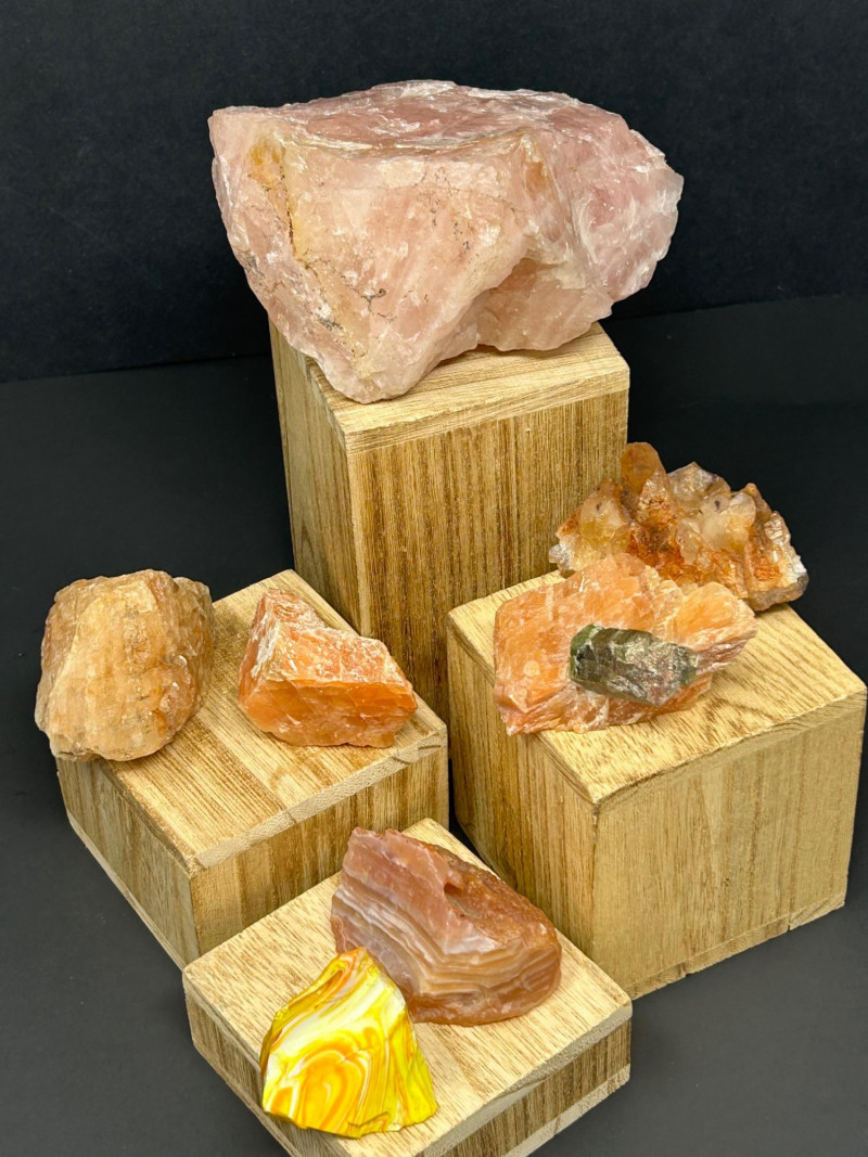 Carnelian tends to show: Semi‑translucent edges Rich orange to reddish tones A smooth, glassy polish You’ve got a color gradient from soft pink to deep red to golden yellow. The textures range from cloudy (rose quartz) to opaque (jasper) to patterned (brecciated stone). The wooden blocks give each piece its own “stage,” which makes the whole arrangement feel intentional and curated.The Big Pink Piece (top block)