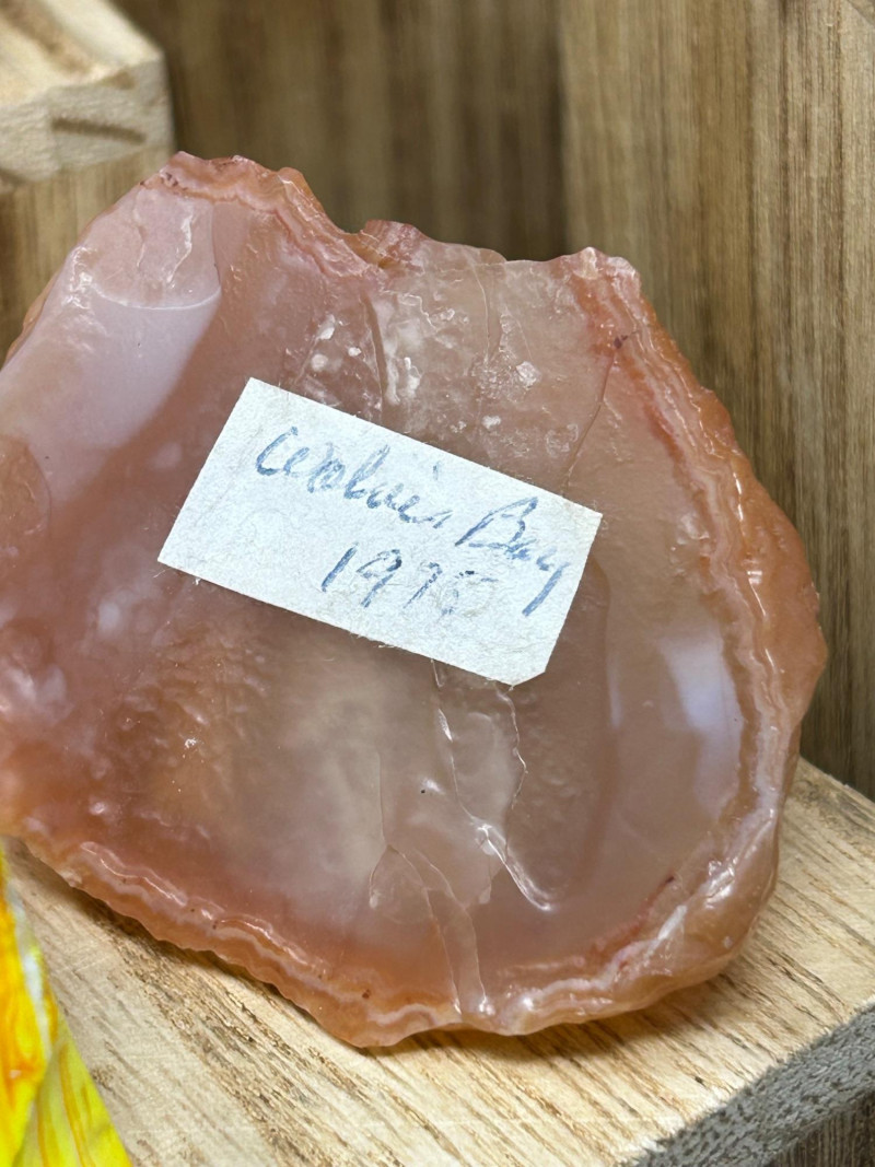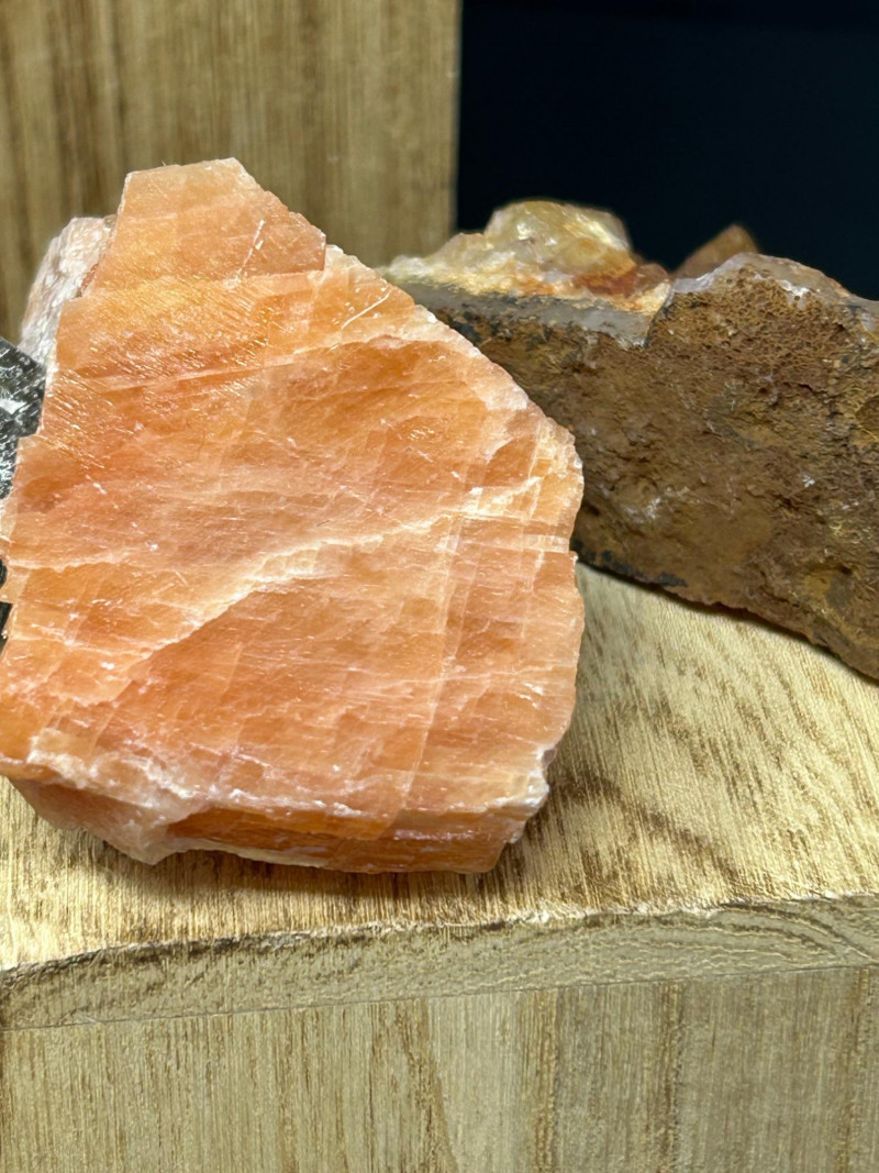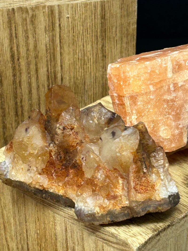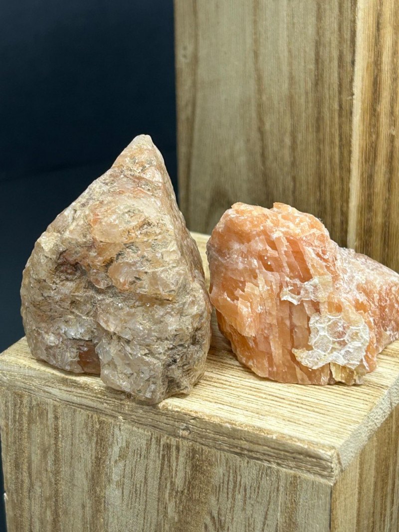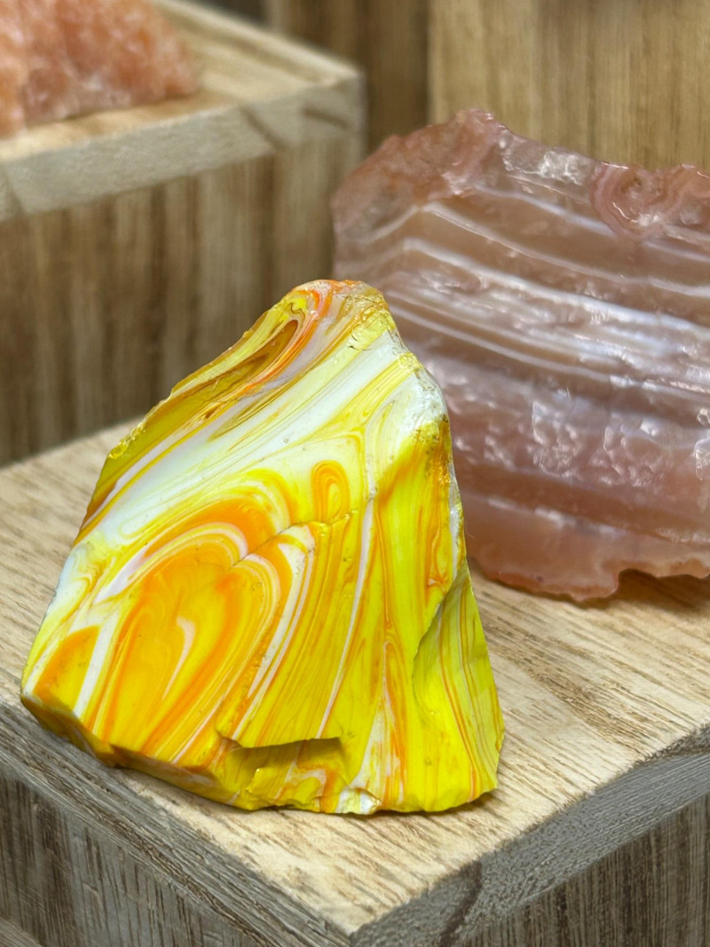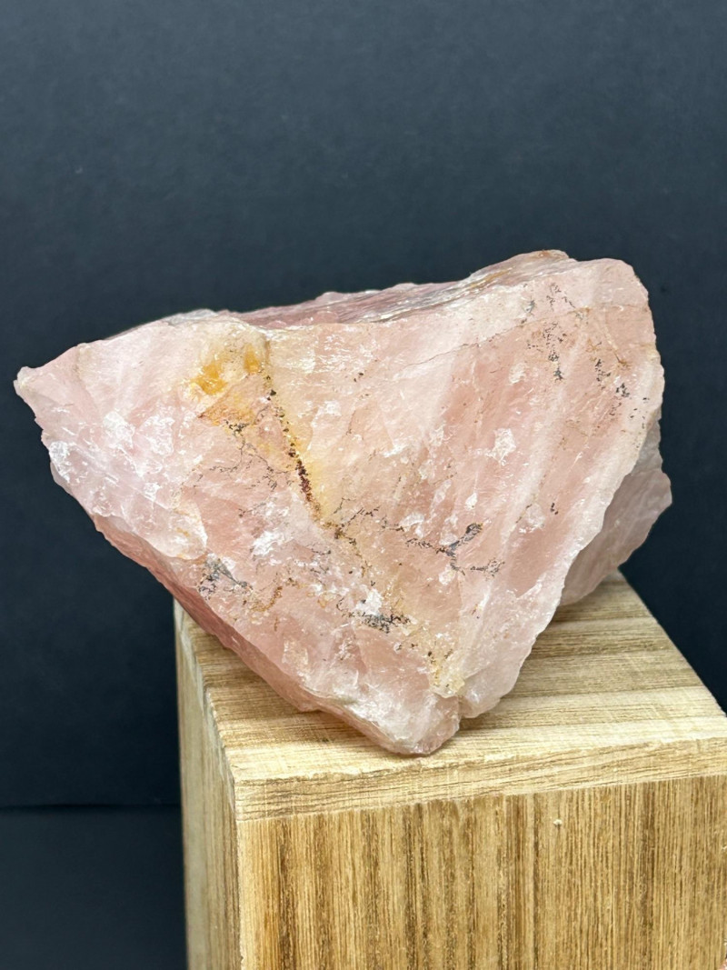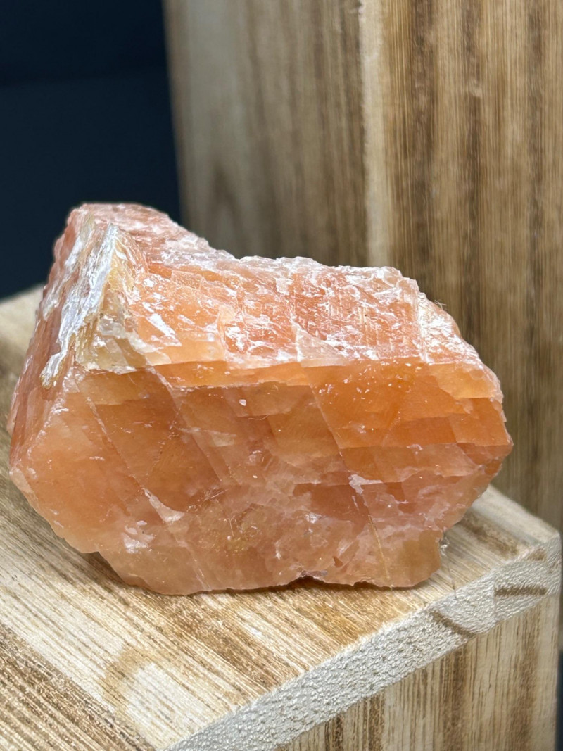 Carnelian tends to show: Semi‑translucent edges Rich orange to reddish tones A smooth, glassy polish You’ve got a color gradient from soft pink to deep red to golden yellow. The textures range from cloudy (rose quartz) to opaque (jasper) to patterned (brecciated stone). The wooden blocks give each piece its own “stage,” which makes the whole arrangement feel intentional and curated.The Big Pink Piece (top block)
