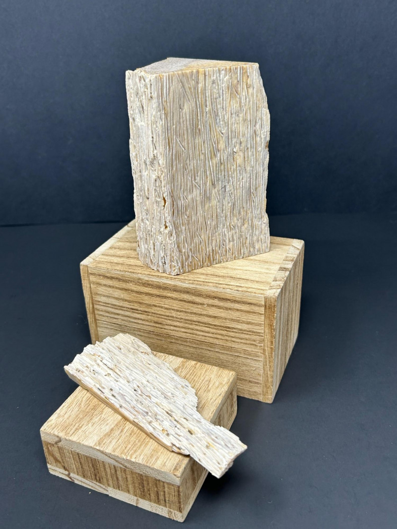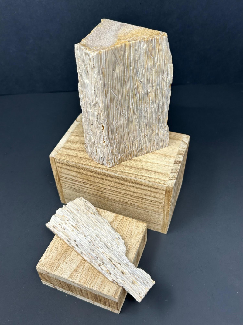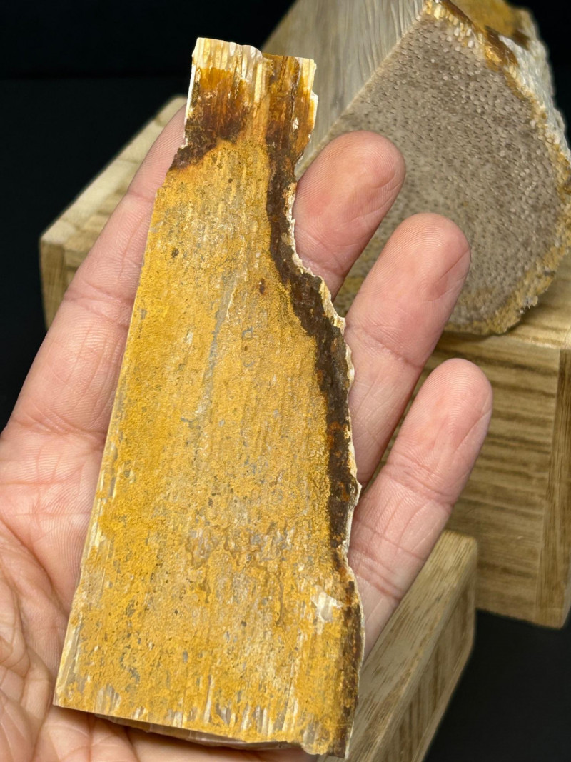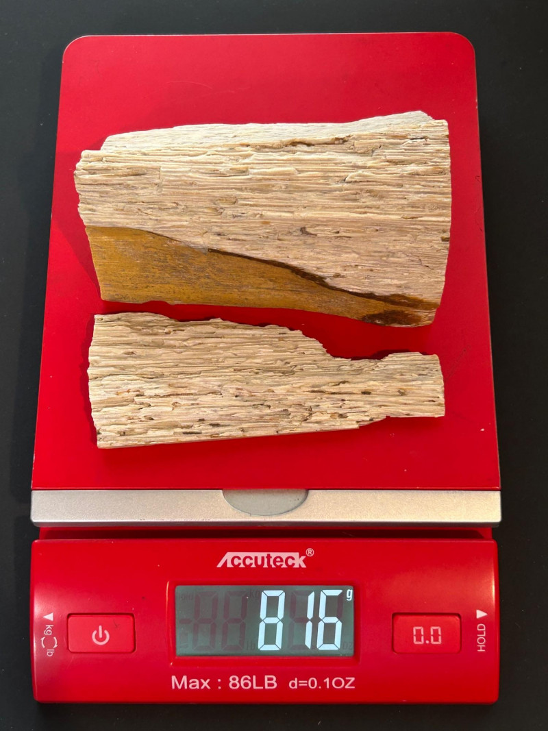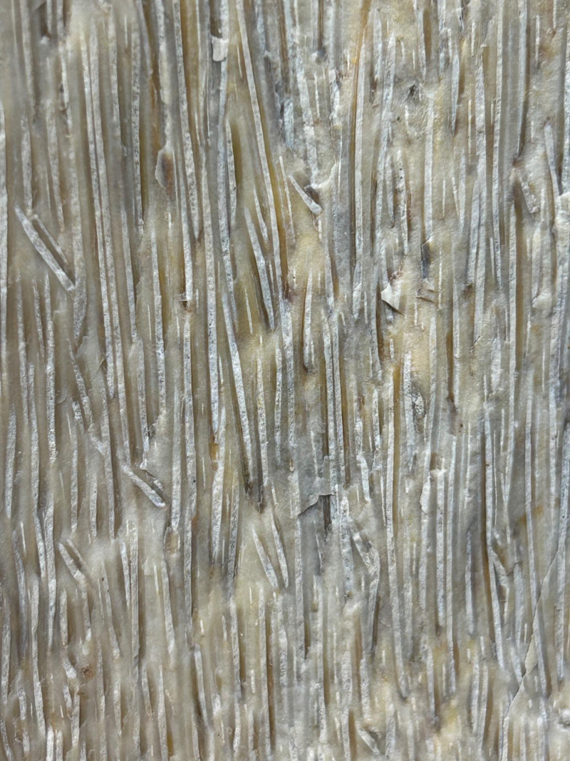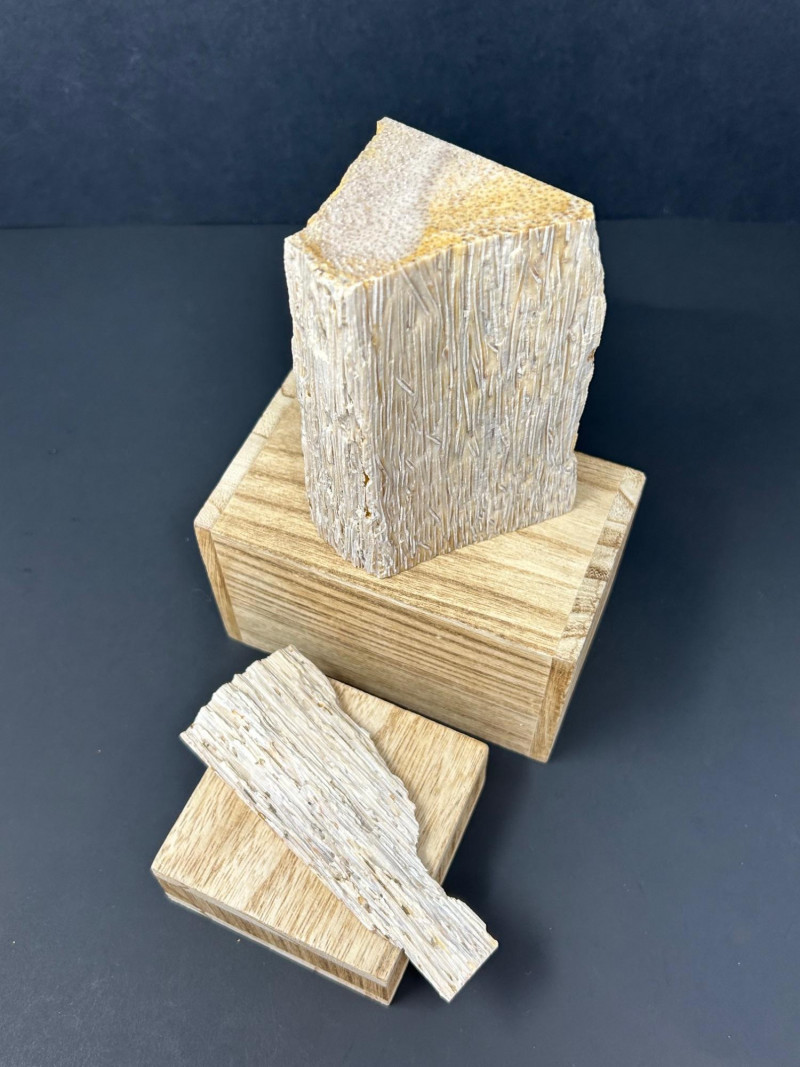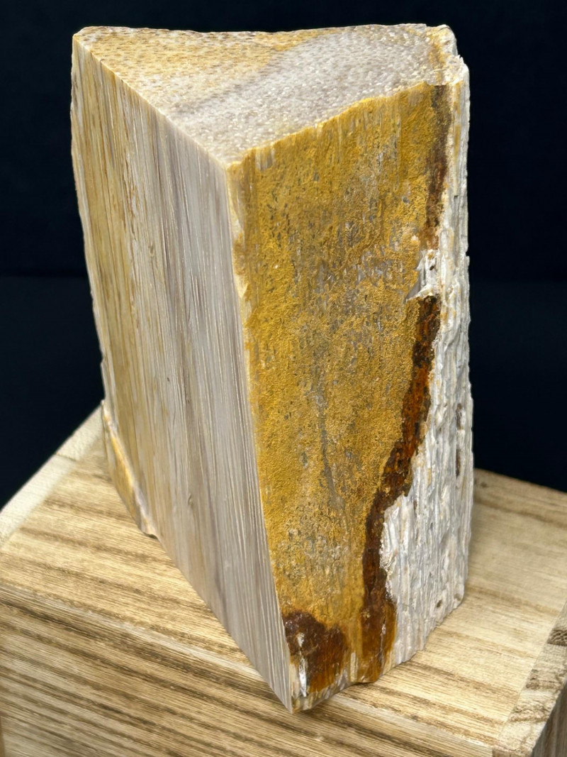 Petrified wood forms when a fallen tree is buried quickly enough that oxygen can’t reach it. Over millions of years, groundwater rich in dissolved minerals flows through the buried wood. The organic material decays cell‑by‑cell and is replaced with minerals such as quartz, chalcedony, jasper, or opal. The result is a stone replica of the original wood, preserving growth rings, grain, and even microscopic cell patterns. A few things stand out: Those long, straight lines running down the sides are the preserved grain of the original tree, showing the orientation of the wood fibers. They’re typical of conifers and other straight‑grained species. The beige, brown, and yellow tones suggest: Iron oxides (reds, yellows, browns) Silica minerals (clear to white)
