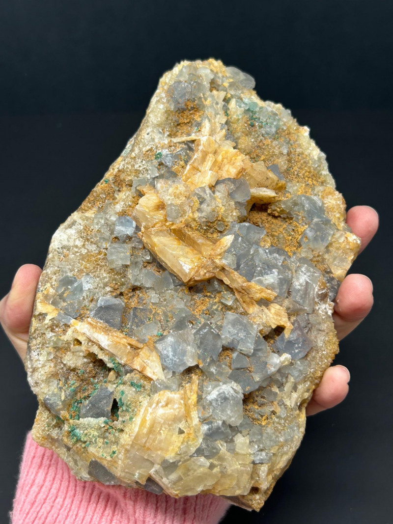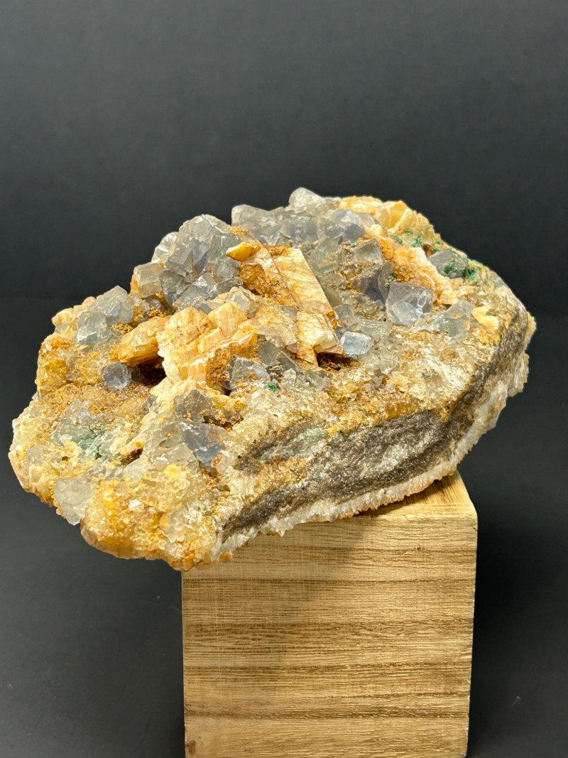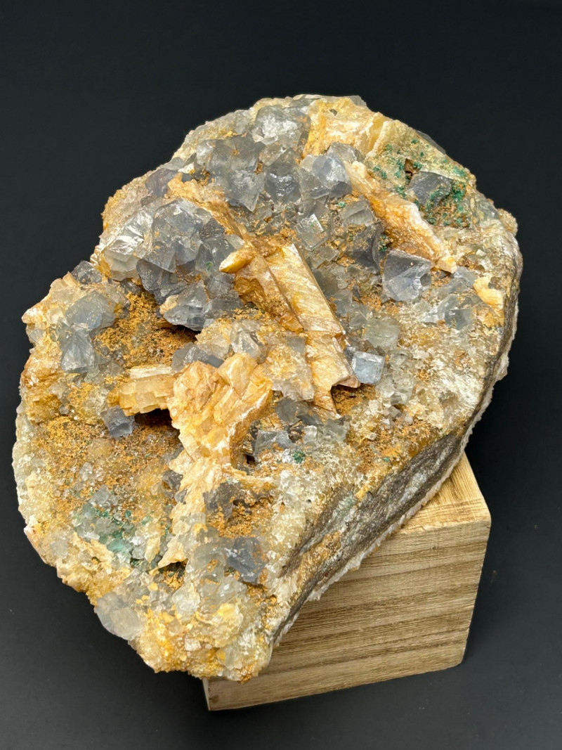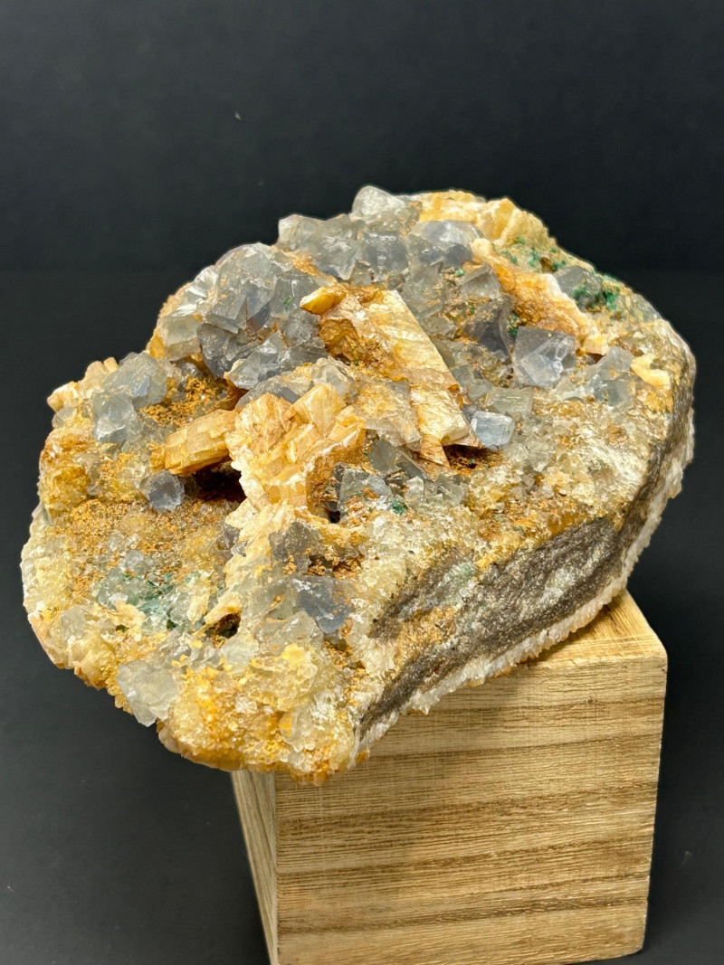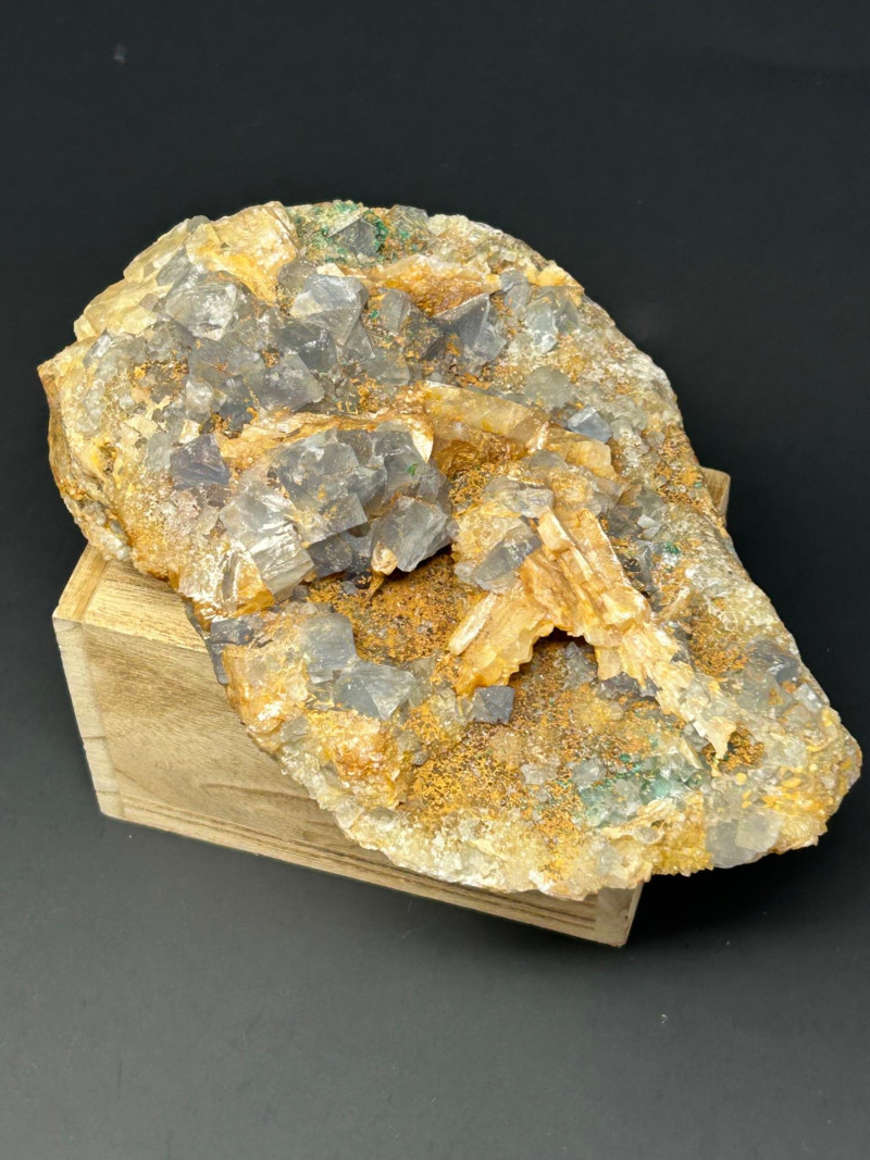 Crystal habit: Perfect cubes, often with slightly frosted or stepped faces Color: Your piece shows a smoky gray tone, which can come from trace impurities or natural radiation exposure Luster: Vitreous (glassy) Common localities with this look: Berbes, Asturias (Spain) Elk Creek, South Dakota (USA) Morocco Illinois–Kentucky Fluorspar District (USA) Crystal habit: Flat, bladed or tabular crystals Color: Honey‑yellow to amber, often translucent Luster: Pearly to vitreous Why it forms with fluorite: Both minerals can precipitate from hydrothermal fluids in similar temperature/pressure conditions, so they often grow together in cavities and veins. The orange and greenish granular coatings could be: Iron oxides (rusty orange) Chlorite or other silicates (greenish tones)