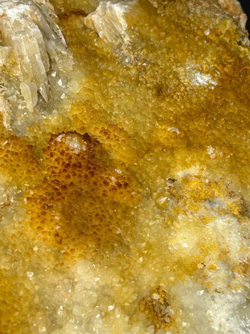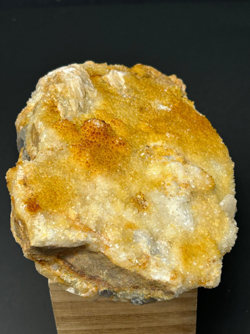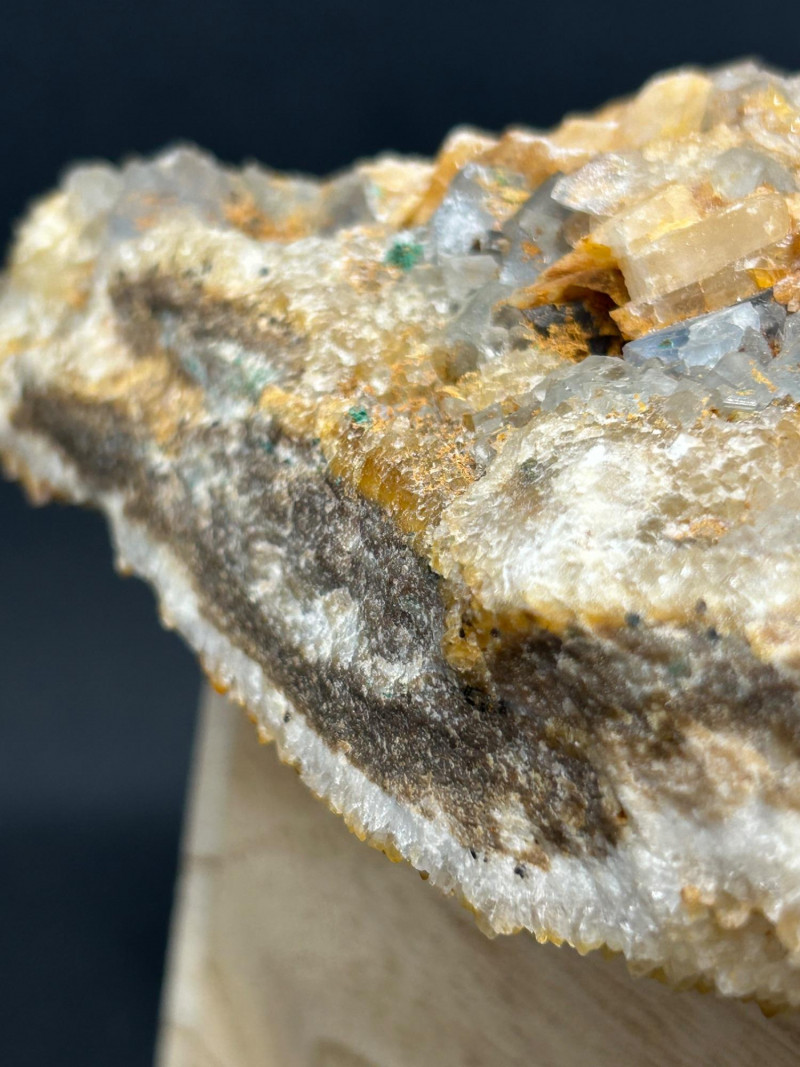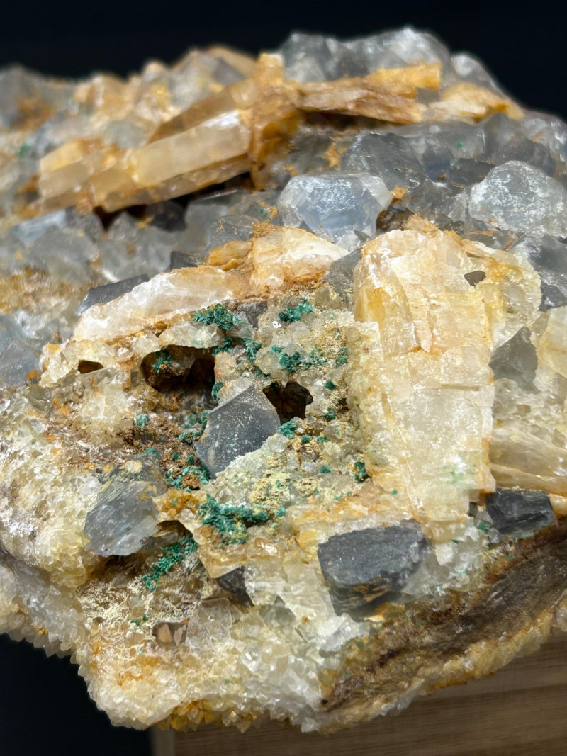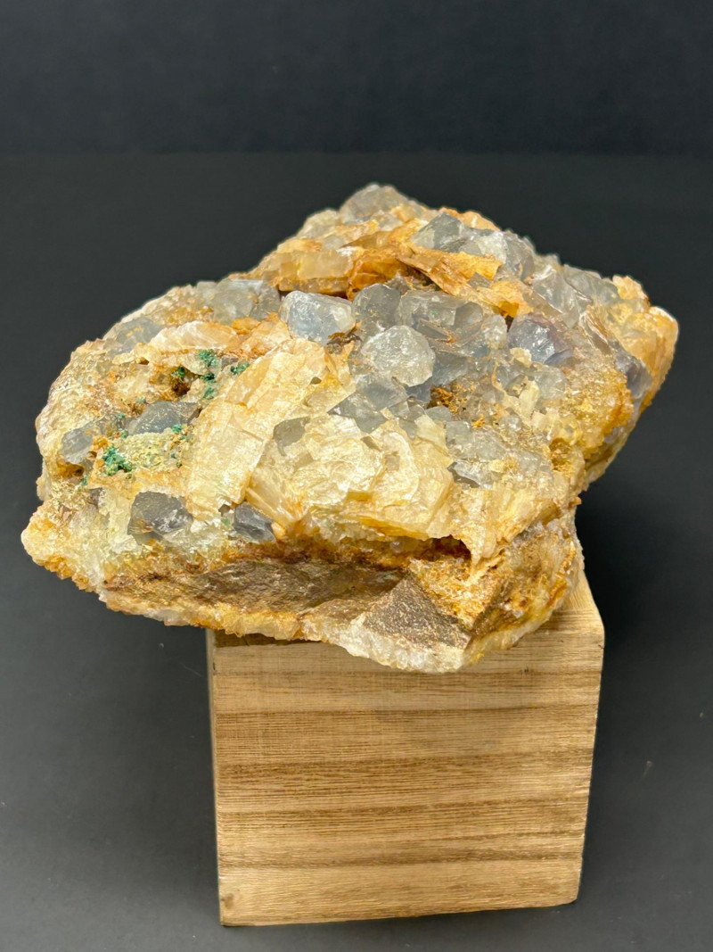Crystal habit: Perfect cubes, often with slightly frosted or stepped faces Color: Your piece shows a smoky gray tone, which can come from trace impurities or natural radiation exposure Luster: Vitreous (glassy) Common localities with this look: Berbes, Asturias (Spain) Elk Creek, South Dakota (USA) Morocco Illinois–Kentucky Fluorspar District (USA) Crystal habit: Flat, bladed or tabular crystals Color: Honey‑yellow to amber, often translucent Luster: Pearly to vitreous Why it forms with fluorite: Both minerals can precipitate from hydrothermal fluids in similar temperature/pressure conditions, so they often grow together in cavities and veins. The orange and greenish granular coatings could be: Iron oxides (rusty orange) Chlorite or other silicates (greenish tones)
