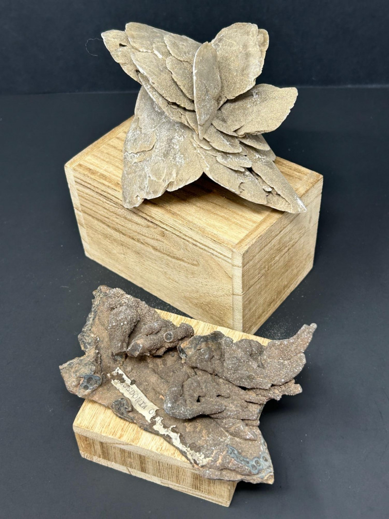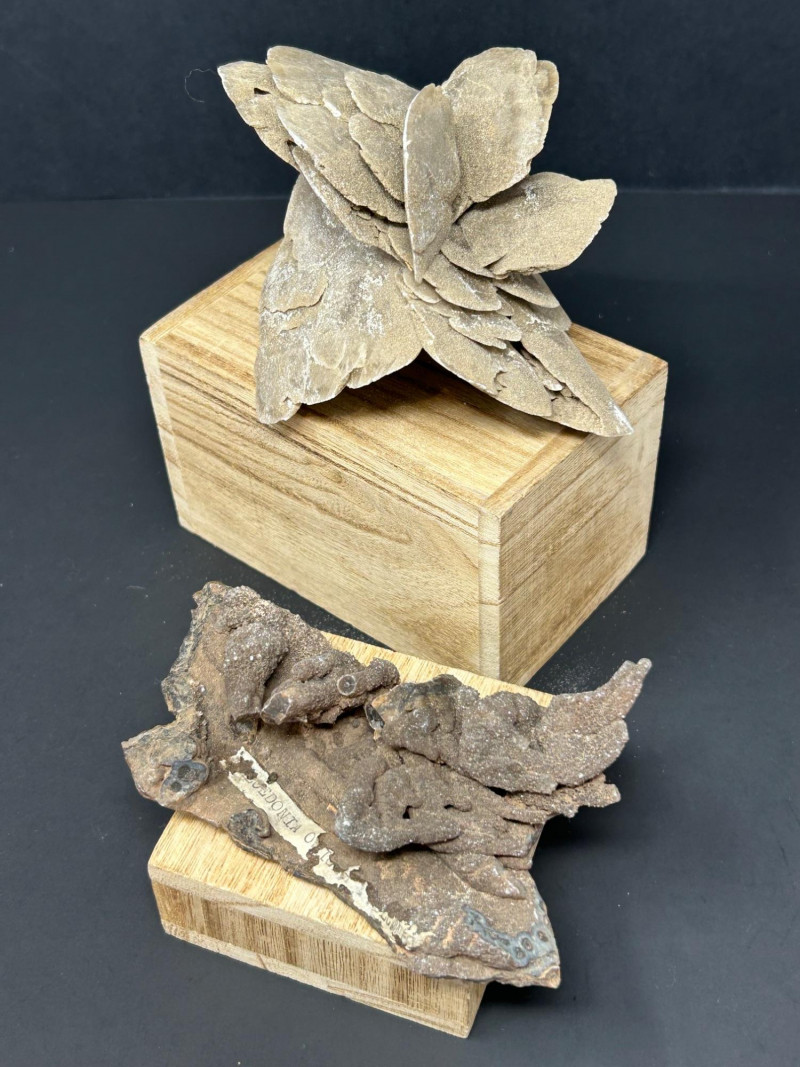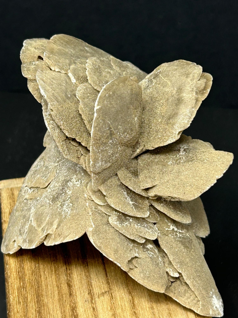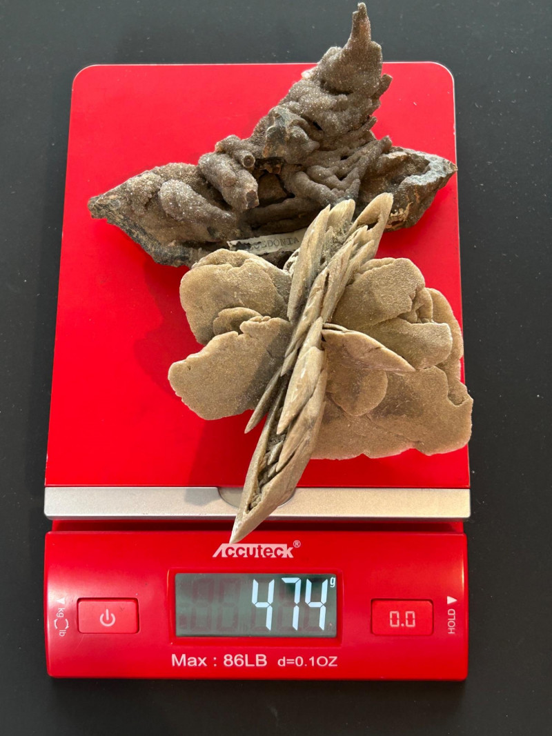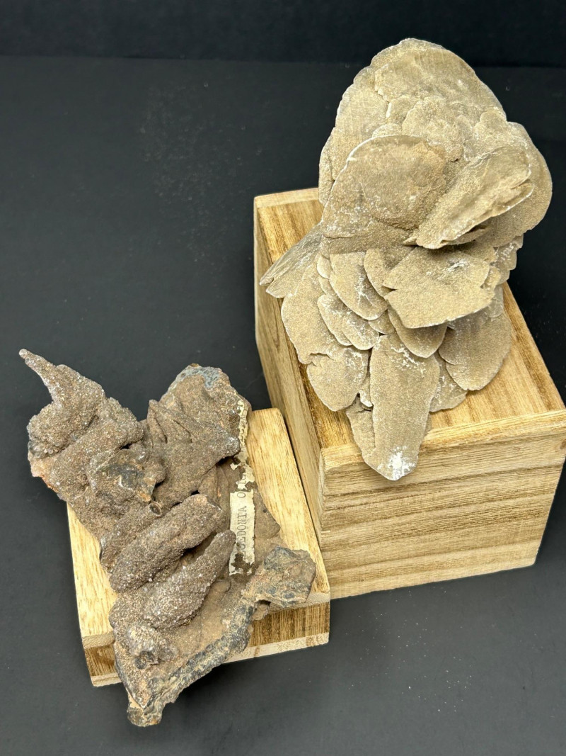 A desert rose is a cluster of gypsum or barite crystals that grow in rosette-like shapes. The “petals” form when mineral-rich water evaporates in arid environments, leaving behind blade-like crystals arranged in radiating layers. Petal-like blades with crisp, layered edges Light tan coloration, typical of gypsum roses Matte, sandy texture, suggesting it formed in a sediment-rich environment Compact rosette shape rather than elongated clusters Based on the color and softness of the edges, yours is almost certainly gypsum, not barite (barite roses tend to be heavier and more rigid). Sahara Desert (especially Algeria and Tunisia) Southwestern USA (Oklahoma, Arizona) Morocco — which fits nicely with the second specimen’s label The lower piece is trickier because Morocco produces so many types of fossils and mineral nodules, but here’s what stands out: Dark brown, rough, nodular surface Irregular, bulbous form Matrix-like texture, not crystalline A label reading “… MAROC”, confirming Moroccan origin Based on the texture and color, it could be one of the following common Moroccan finds: Morocco exports a lot of Devonian reef fossils. These often have: knobby, porous surfaces brown to reddish coloration irregular, mound-like shapes Moroccan desert concretions often show: earthy brown tones rounded, organic shapes dense, heavy feel These ancient microbial structures can appear: layered or lumpy brown and weathered irregular in form Your specimen looks closest to fossil coral or an iron-rich concretion, but I can narrow it further if you show me a close-up of the texture.Top Specimen: Desert Rose (Gypsum or Barite Rose) 6x3