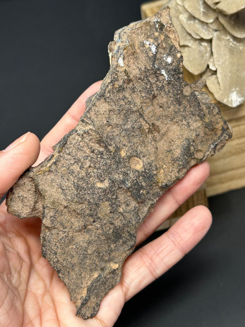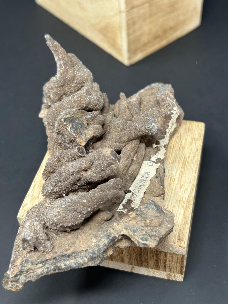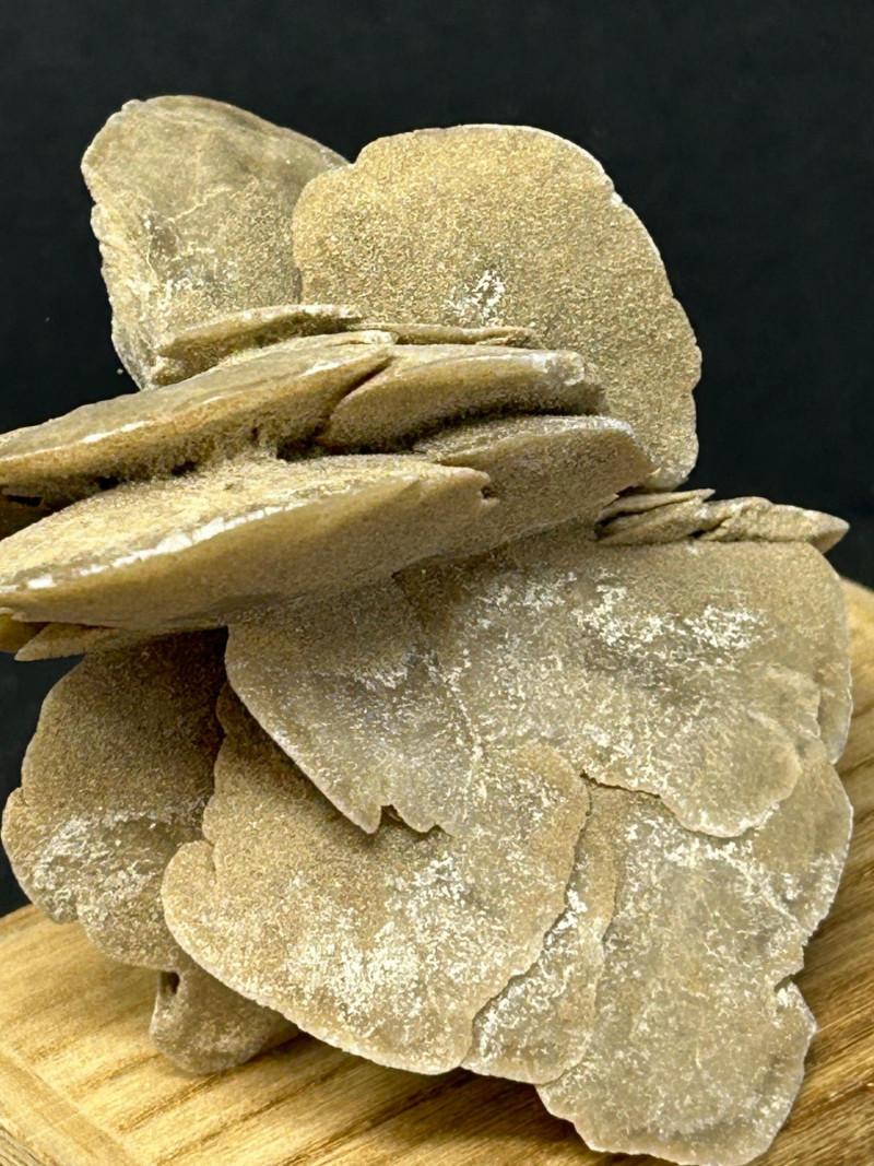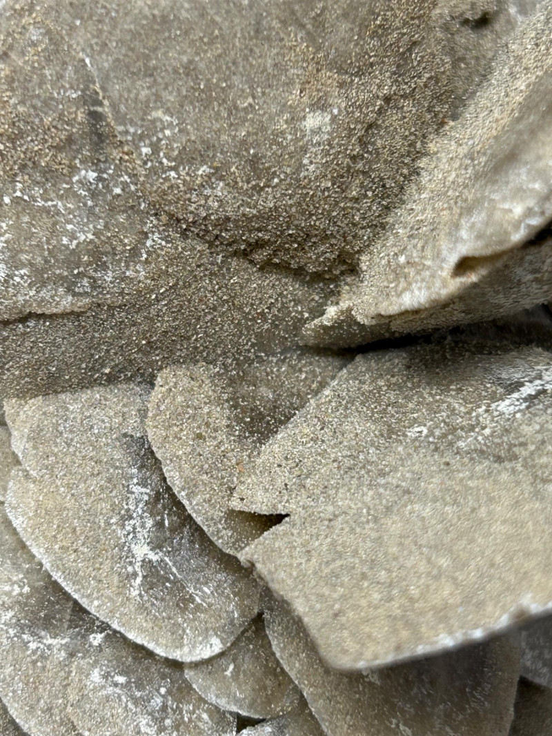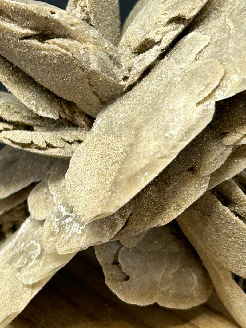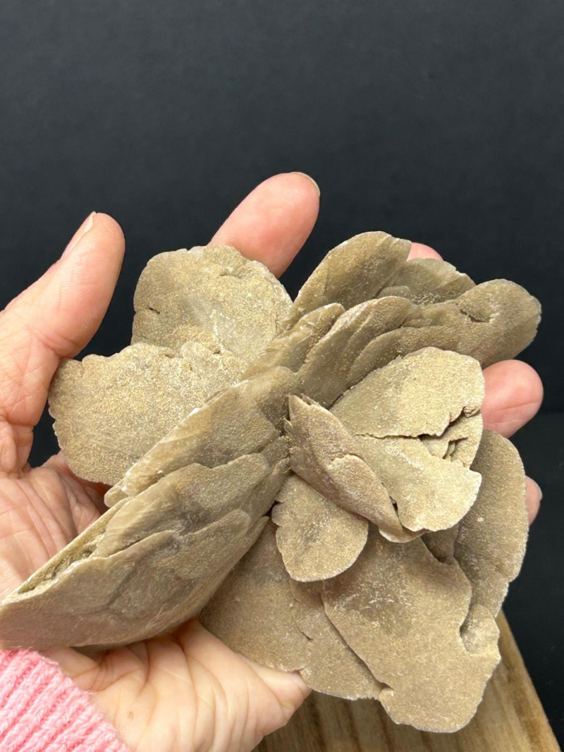 A desert rose is a cluster of gypsum or barite crystals that grow in rosette-like shapes. The “petals” form when mineral-rich water evaporates in arid environments, leaving behind blade-like crystals arranged in radiating layers. Petal-like blades with crisp, layered edges Light tan coloration, typical of gypsum roses Matte, sandy texture, suggesting it formed in a sediment-rich environment Compact rosette shape rather than elongated clusters Based on the color and softness of the edges, yours is almost certainly gypsum, not barite (barite roses tend to be heavier and more rigid). Sahara Desert (especially Algeria and Tunisia) Southwestern USA (Oklahoma, Arizona) Morocco — which fits nicely with the second specimen’s label The lower piece is trickier because Morocco produces so many types of fossils and mineral nodules, but here’s what stands out: Dark brown, rough, nodular surface Irregular, bulbous form Matrix-like texture, not crystalline A label reading “… MAROC”, confirming Moroccan origin Based on the texture and color, it could be one of the following common Moroccan finds: Morocco exports a lot of Devonian reef fossils. These often have: knobby, porous surfaces brown to reddish coloration irregular, mound-like shapes Moroccan desert concretions often show: earthy brown tones rounded, organic shapes dense, heavy feel These ancient microbial structures can appear: layered or lumpy brown and weathered irregular in form Your specimen looks closest to fossil coral or an iron-rich concretion, but I can narrow it further if you show me a close-up of the texture.Top Specimen: Desert Rose (Gypsum or Barite Rose) 6x3