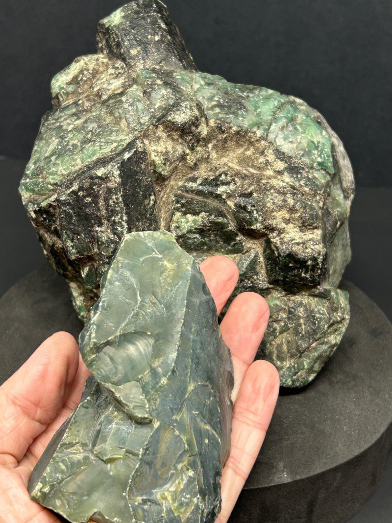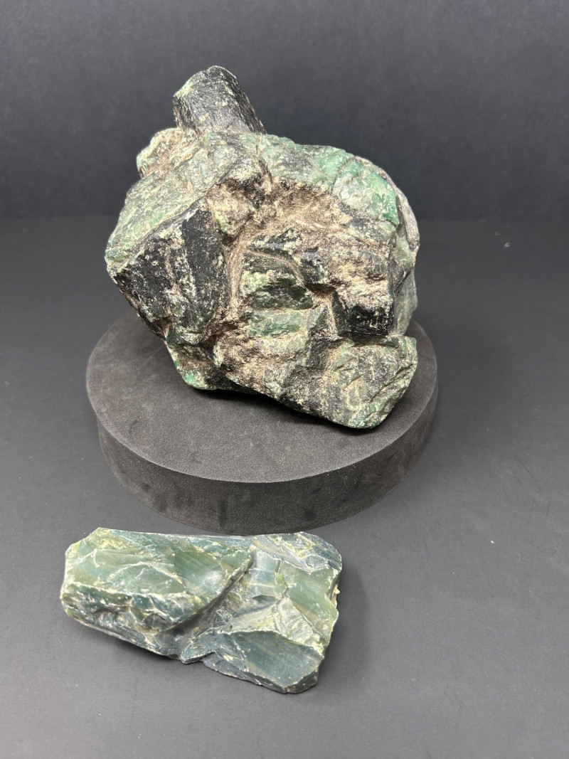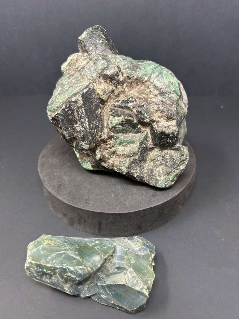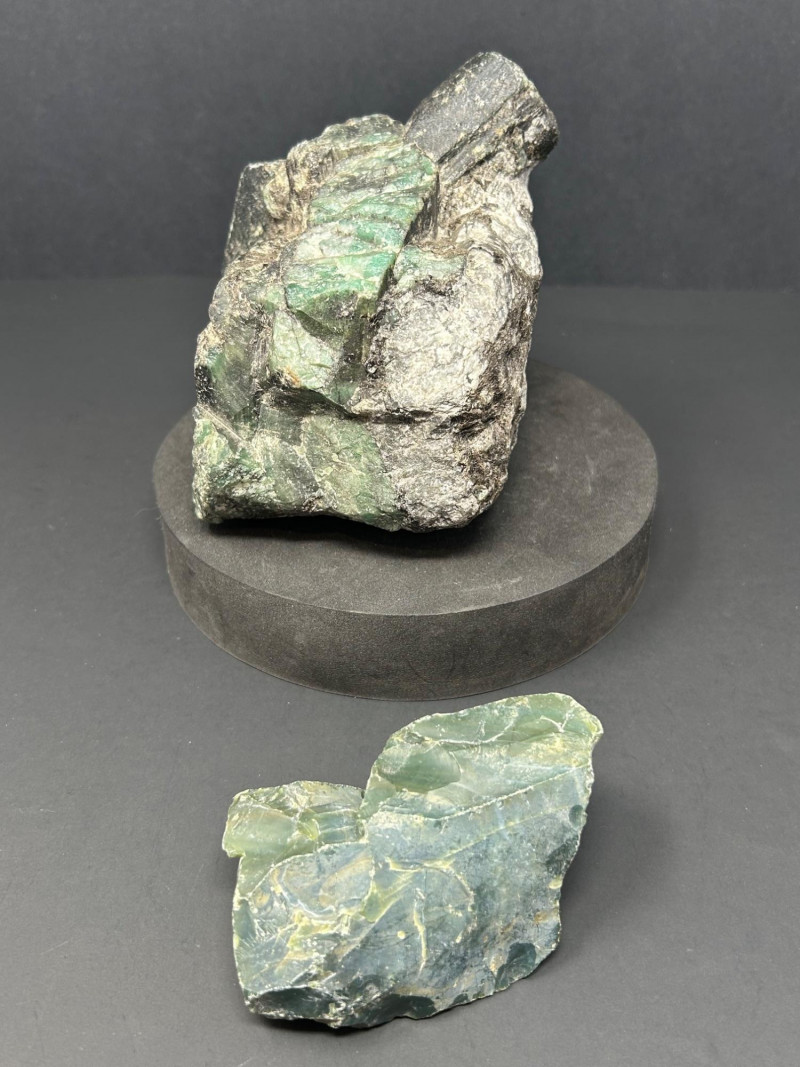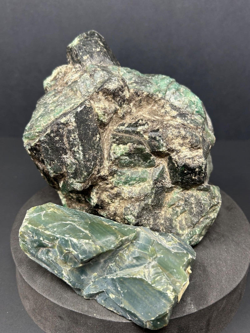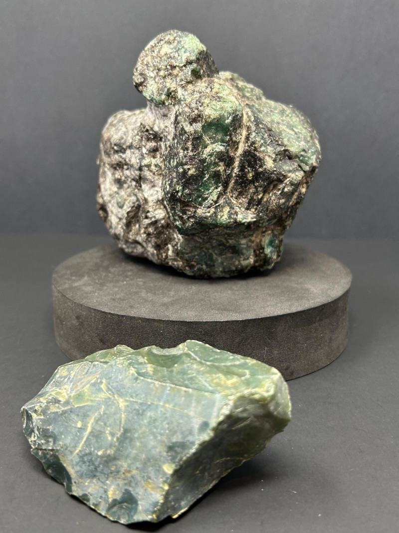 Green tourmaline—often called verdelite—is a boron‑silicate mineral that forms in long, striated crystals. It’s part of the tourmaline group, which is known for its wide color range and durability. Rich green coloration, often caused by iron or chromium Columnar or prismatic crystal structure Embedded in a host rock, commonly quartz, feldspar, or mica schist High hardness (7–7.5), giving it a glassy, durable look Green tourmaline grows in: Pegmatites (coarse‑grained igneous rocks) Metamorphic rocks like schist Regions such as Brazil, Afghanistan, Pakistan, Madagascar, and parts of the U.S. Strong pleochroism (color shifts depending on viewing angle) Excellent for jewelry due to hardness Often found in striking, well‑formed crystals Jasper is a microcrystalline variety of quartz (chalcedony) known for its opaque, earthy appearance. It forms when silica-rich fluids cement fine sediments or volcanic ash. Waxy, smooth surface Opaque green coloration, often from iron silicates or chlorite Fracture lines or mottlingthat give it character Hardness around 6.5–7 Jasper is extremely widespread, forming in: Sedimentary environments Volcanic flows Hydrothermal systems Common sources include the U.S., Australia, Madagascar, and Africa. Endless variety of colors and patterns Takes a great polish Used widely in carvings, cabochons, and decorative piecesGreen Tourmaline (Verdelite)