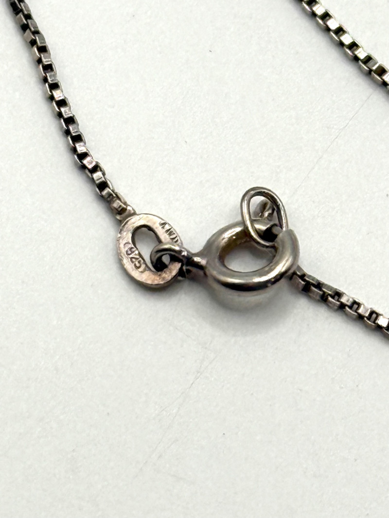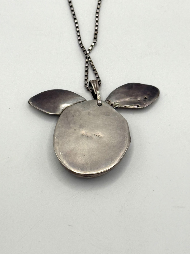 Chain is 19 inches long, pendant is 1 1/4 inches long. Chain and pendant both marked sterling.