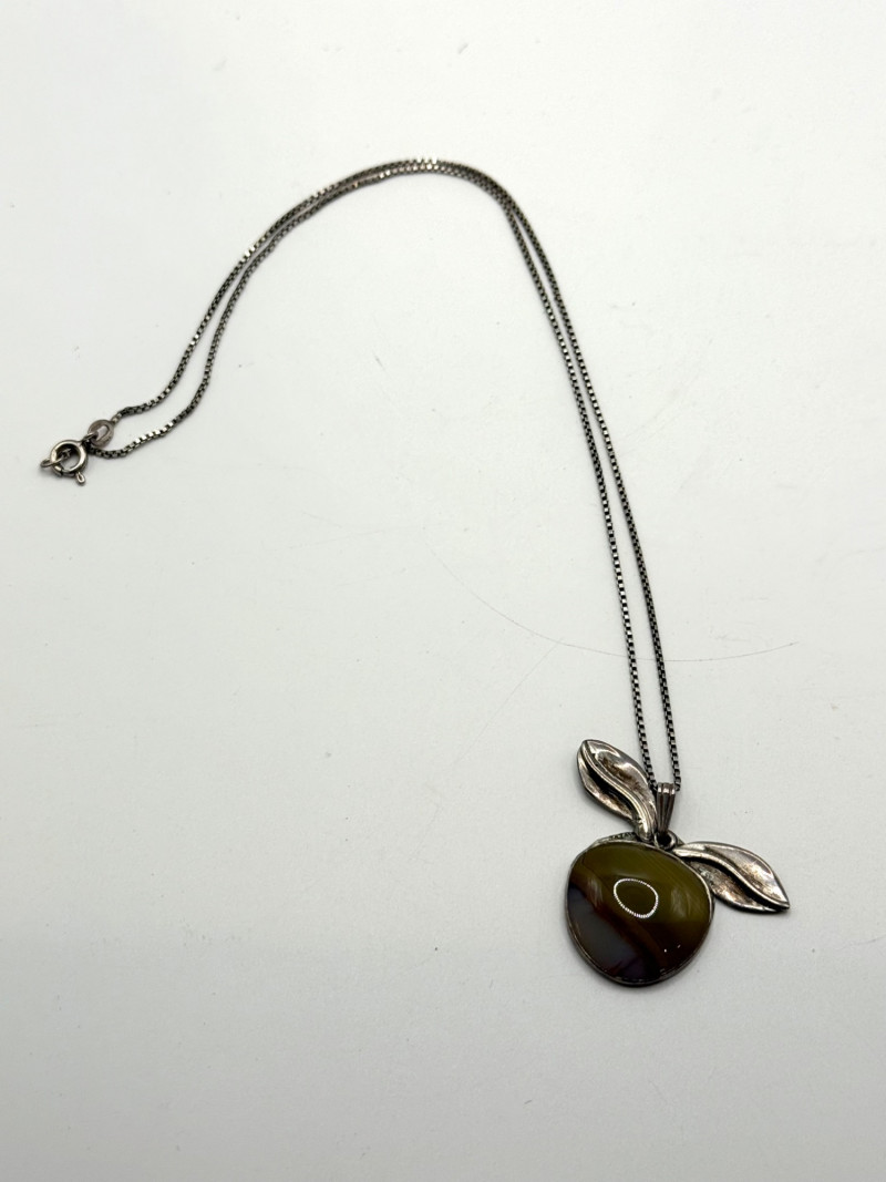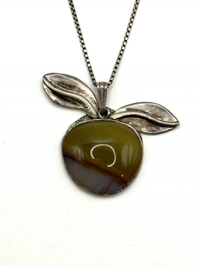 A sterling silver pendant necklace featuring a polished agate stone in warm multicolored tones, shaped in a fruit‑inspired form with two textured silver leaves at the top. The pendant hangs from a fine sterling chain, creating a naturalistic, artisan look with beautiful color variation in the stone.