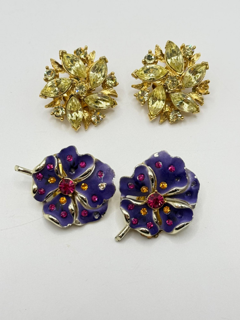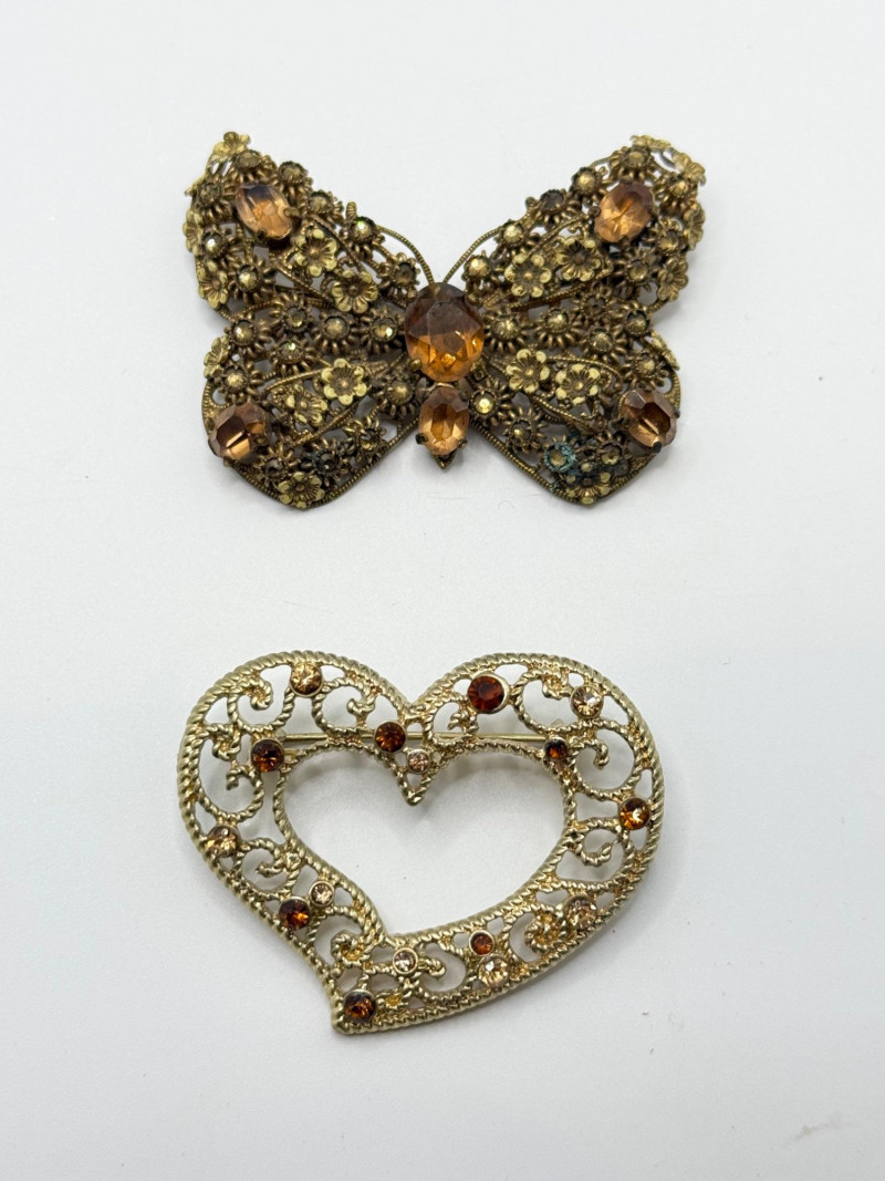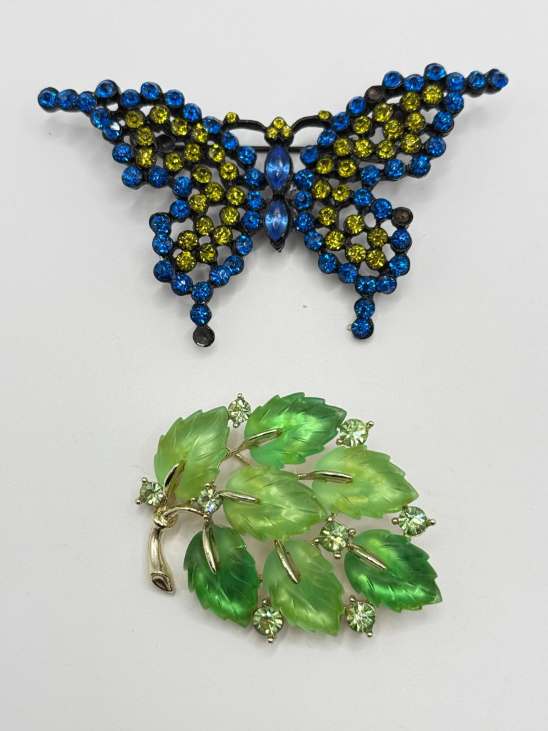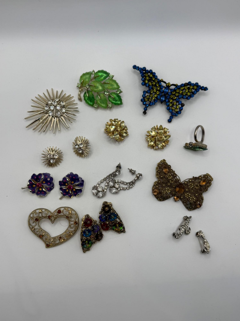 Blue and yellow rhinestone butterfly brooch Green leaf brooch Gold‑tone butterfly brooch Heart‑shaped rhinestone brooch Assorted floral earrings and pins with rhinestones and enamel accents Vintage ring with decorative setting