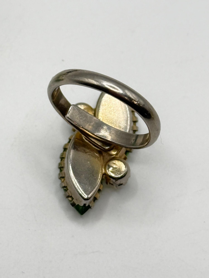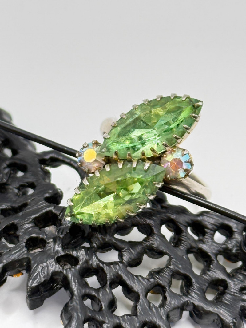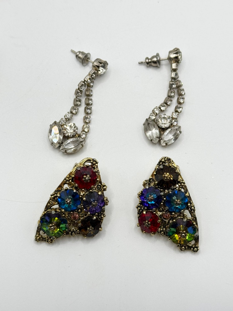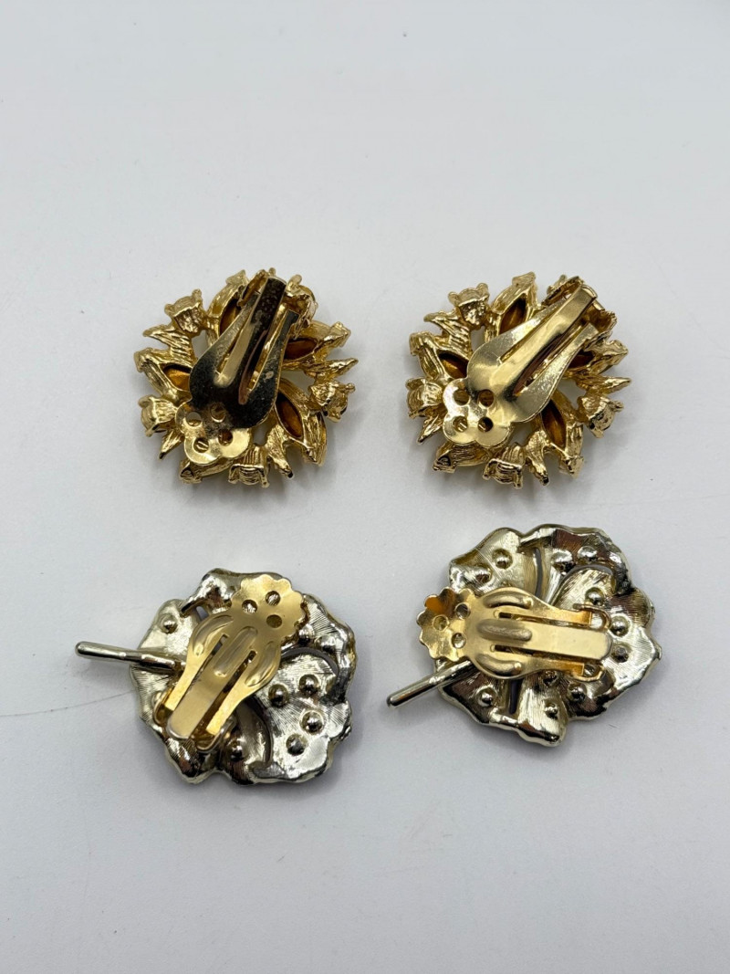 Blue and yellow rhinestone butterfly brooch Green leaf brooch Gold‑tone butterfly brooch Heart‑shaped rhinestone brooch Assorted floral earrings and pins with rhinestones and enamel accents Vintage ring with decorative setting