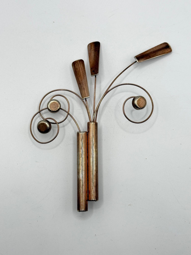 A sculptural mid‑century metal brooch featuring an abstract floral form with curled wire elements, cylindrical petals, and circular discs arranged in a balanced, modernist composition. No markings.