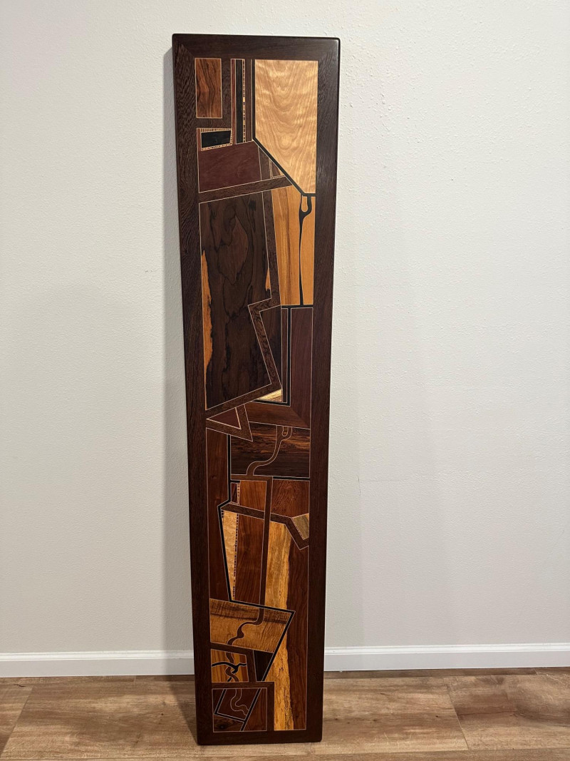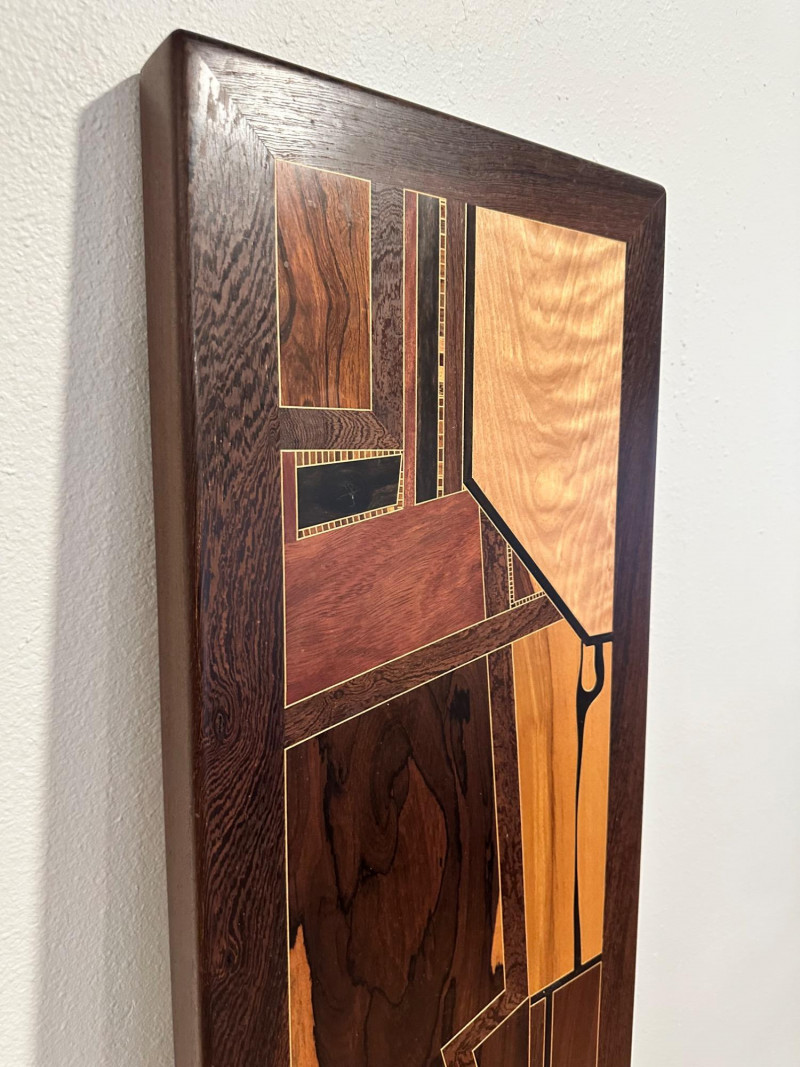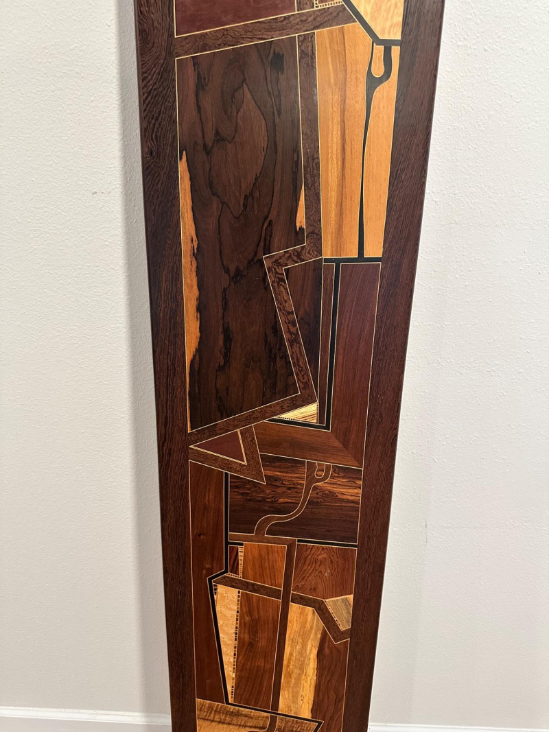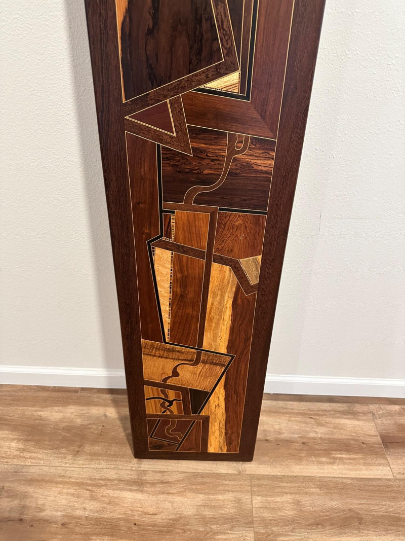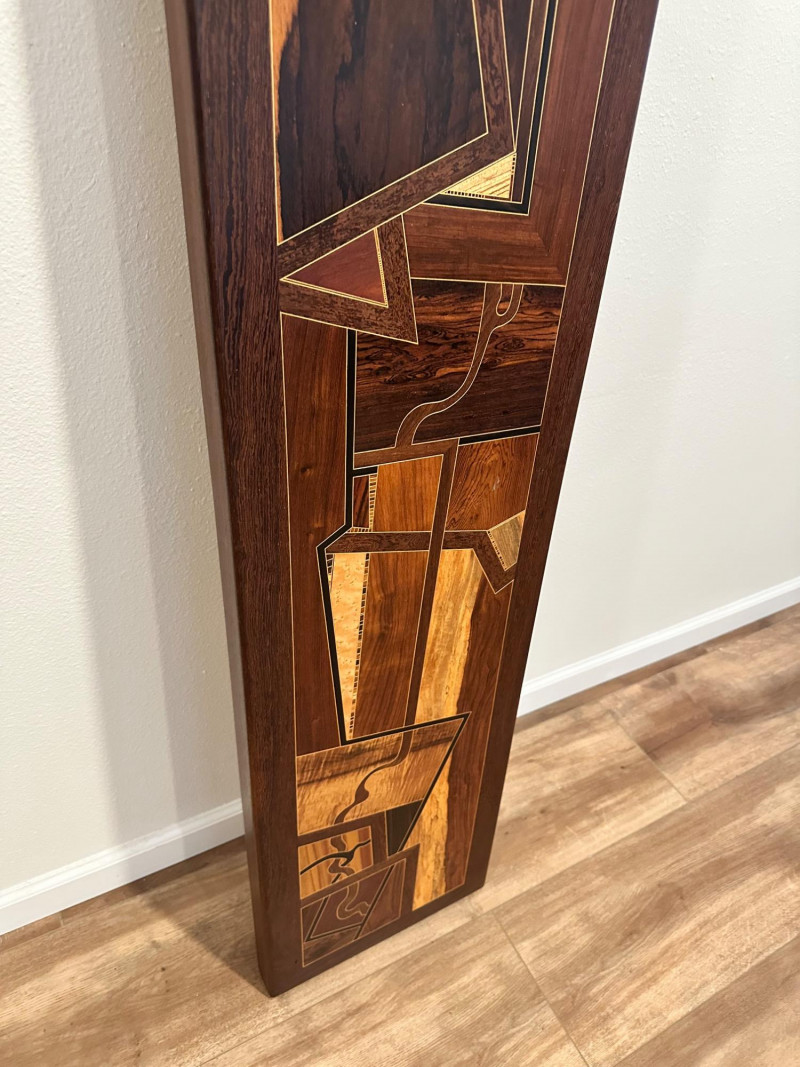 A striking handcrafted wood inlay art panel featuring an elongated vertical format and a bold abstract geometric composition. This piece is constructed from carefully selected contrasting hardwoods arranged in angular, architectural forms with flowing linear accents. Rich natural grain patterns—ranging from warm honey tones to deep espresso browns—create strong visual depth and movement. The panel is signed and dated 1992 on the reverse, indicating an original studio-made artwork rather than decorative mass production. Framed in solid dark wood, it has substantial visual presence and is designed to be displayed vertically, making it an excellent statement piece for modern, mid-century, or architectural interiors. Item Type: Handcrafted wood inlay wall art panel Style: Abstract / Geometric / Modernist Materials: Mixed hardwoods with fine inlay detailing Orientation: Vertical Signature: Signed and dated 1992 (on back, photographed) Construction: Solid wood frame with inset inlaid panel Finish: Natural wood tones with smooth sealed surface Measurements: Height: approx. 66 inches Width: approx. 13 inches Display: Designed for wall mounting Details: