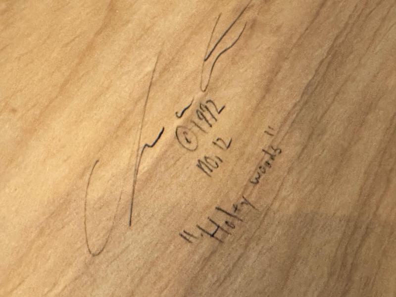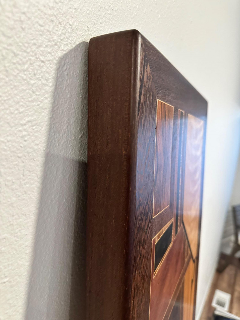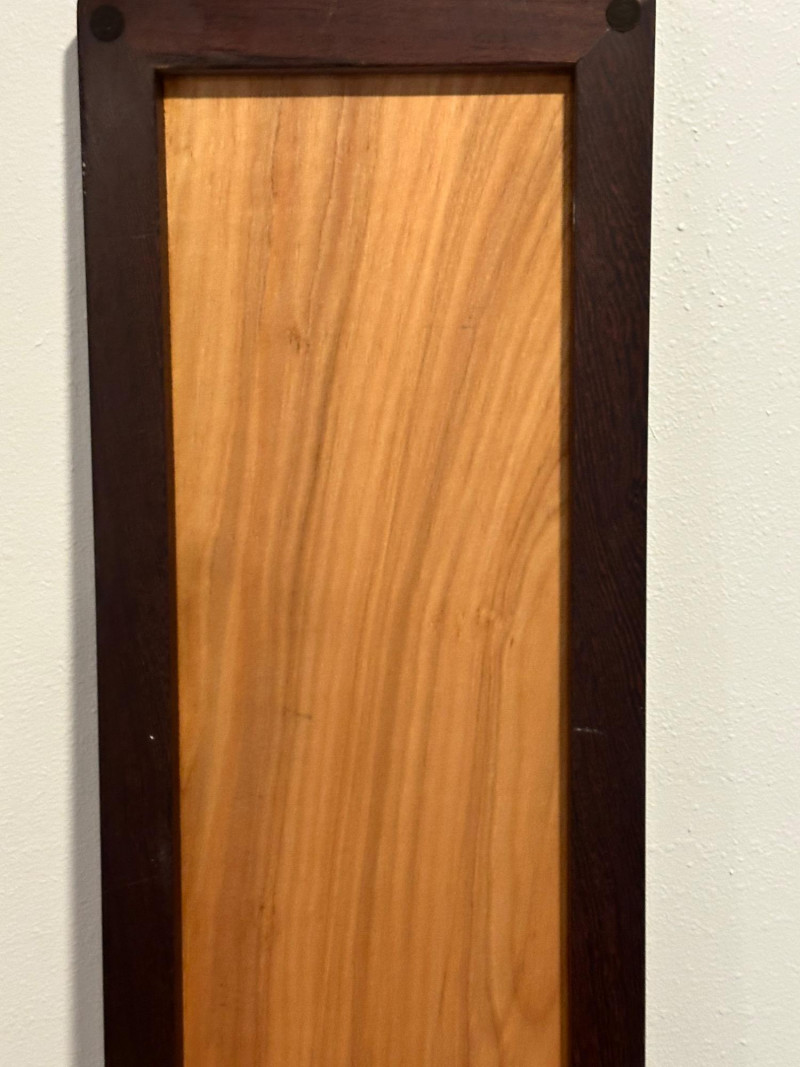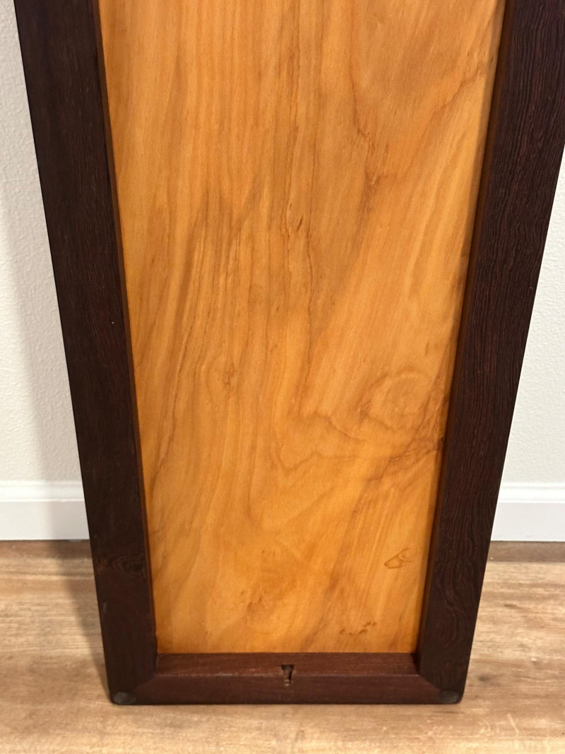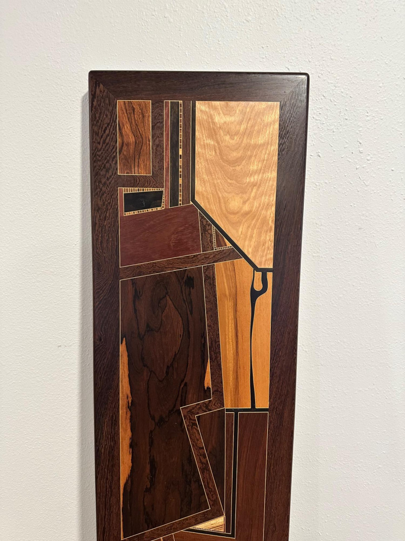 A striking handcrafted wood inlay art panel featuring an elongated vertical format and a bold abstract geometric composition. This piece is constructed from carefully selected contrasting hardwoods arranged in angular, architectural forms with flowing linear accents. Rich natural grain patterns—ranging from warm honey tones to deep espresso browns—create strong visual depth and movement. The panel is signed and dated 1992 on the reverse, indicating an original studio-made artwork rather than decorative mass production. Framed in solid dark wood, it has substantial visual presence and is designed to be displayed vertically, making it an excellent statement piece for modern, mid-century, or architectural interiors. Item Type: Handcrafted wood inlay wall art panel Style: Abstract / Geometric / Modernist Materials: Mixed hardwoods with fine inlay detailing Orientation: Vertical Signature: Signed and dated 1992 (on back, photographed) Construction: Solid wood frame with inset inlaid panel Finish: Natural wood tones with smooth sealed surface Measurements: Height: approx. 66 inches Width: approx. 13 inches Display: Designed for wall mounting Details: