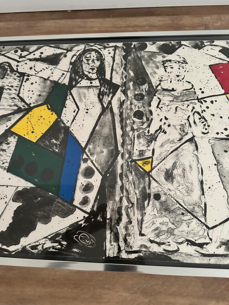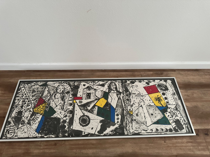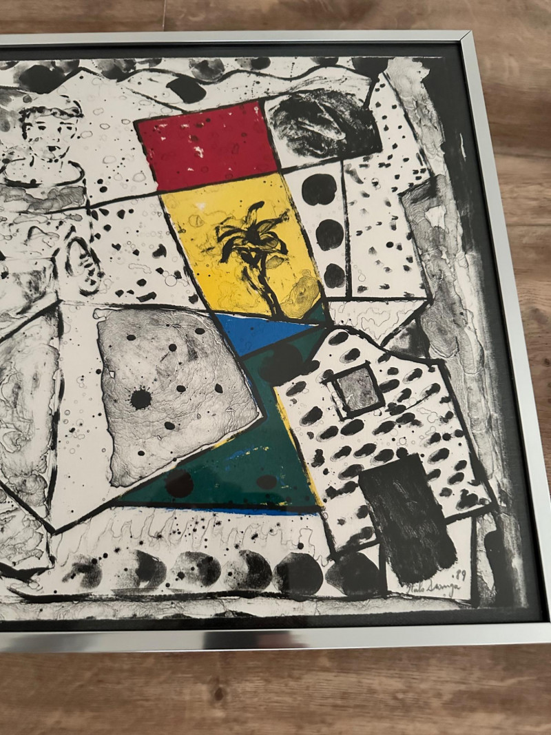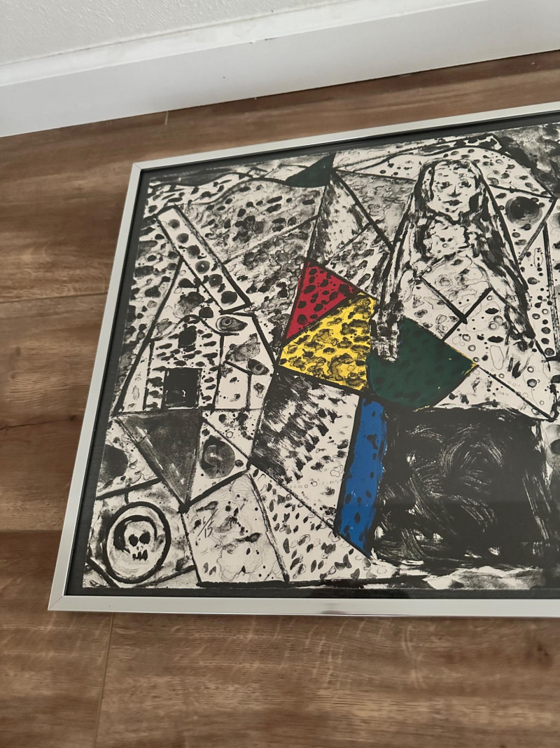 Bold and intellectually engaging, this limited-edition lithograph by Italo Scanga exemplifies the artist’s distinctive abstract-figurative language from the late 1980s. Two Female Saints and a Skull combines expressive black-and-white textures with striking geometric color fields, creating a layered composition rich in symbolism and visual tension. The imagery blends figurative references, architectural forms, and symbolic motifs—hallmarks of Scanga’s work—inviting interpretation while maintaining a strong modernist presence. Produced as a four-color lithograph, the work is hand-signed, dated 1989, titled in pencil, and numbered 6/15, from a small, collectible edition. This piece is a documented work by Scanga and is known to have been printed in collaboration with master printer Bill Lagattuta. Framed and ready to display, it makes a compelling statement for modern, contemporary, or gallery-style interiors. Artist: Italo Scanga (Italian-American, 1932–2001) Title: Two Female Saints and a Skull Year: 1989 Medium: Four-color lithograph on paper Edition: 6 of 15 Signature: Hand-signed, titled, dated, and numbered in pencil Printer: Bill Lagattuta Presentation: Framed (included)Details: