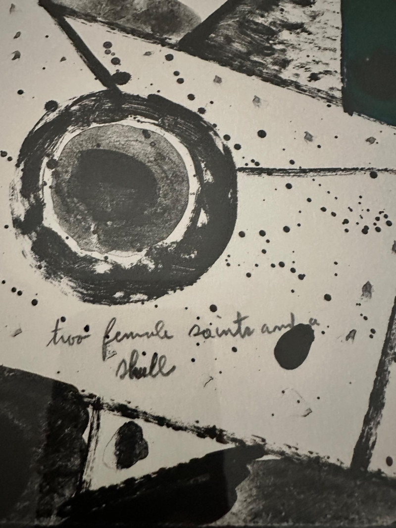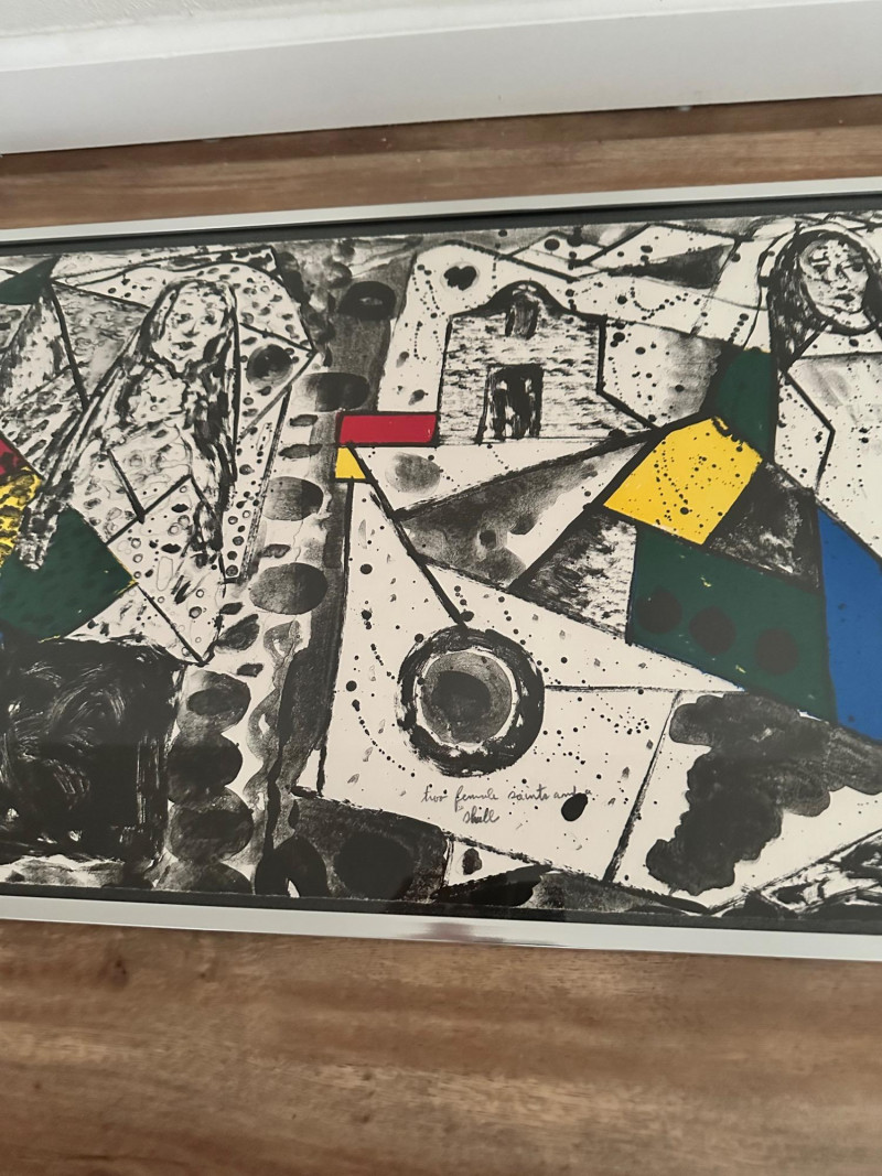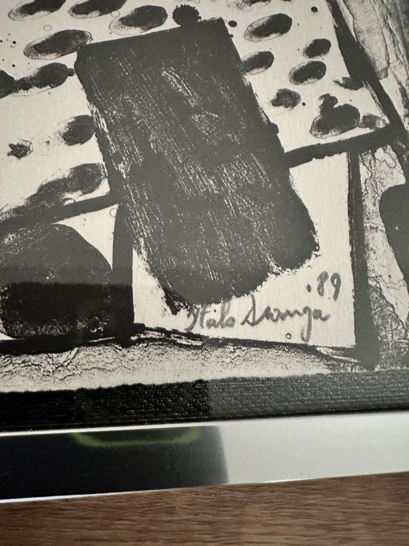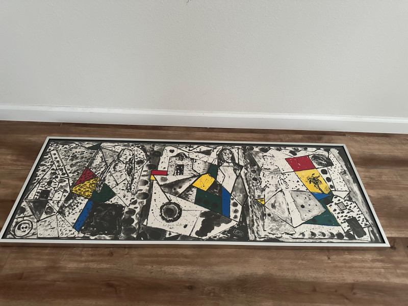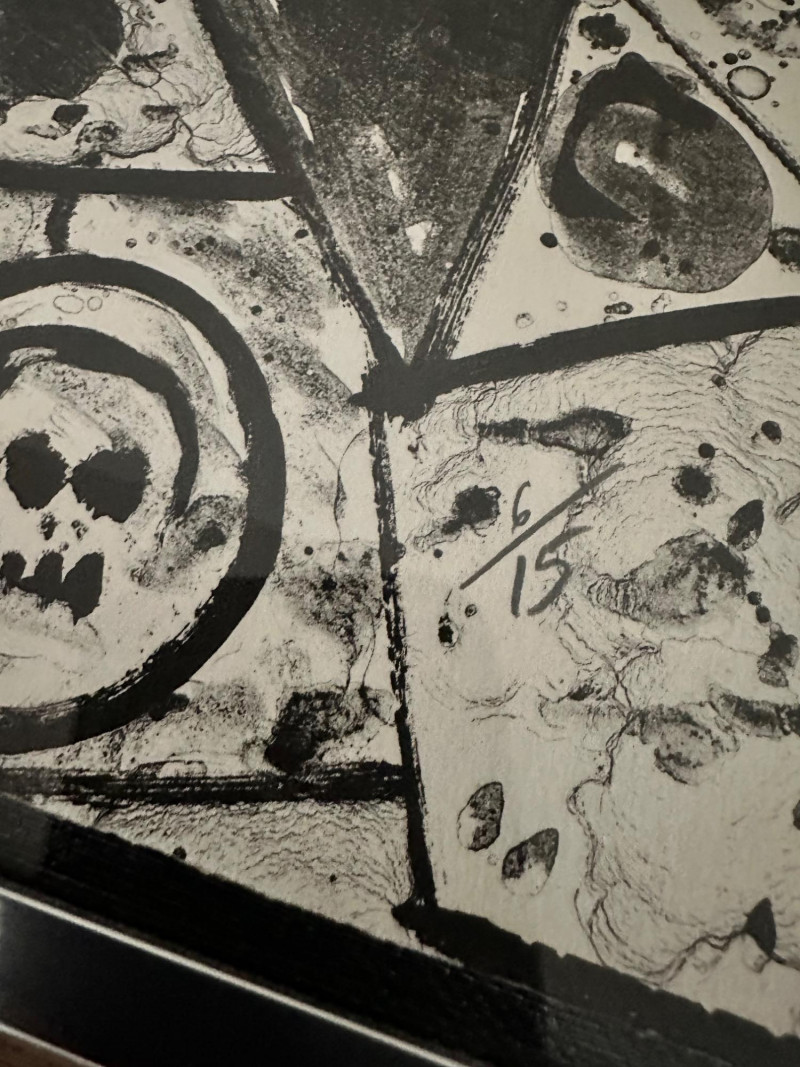 Bold and intellectually engaging, this limited-edition lithograph by Italo Scanga exemplifies the artist’s distinctive abstract-figurative language from the late 1980s. Two Female Saints and a Skull combines expressive black-and-white textures with striking geometric color fields, creating a layered composition rich in symbolism and visual tension. The imagery blends figurative references, architectural forms, and symbolic motifs—hallmarks of Scanga’s work—inviting interpretation while maintaining a strong modernist presence. Produced as a four-color lithograph, the work is hand-signed, dated 1989, titled in pencil, and numbered 6/15, from a small, collectible edition. This piece is a documented work by Scanga and is known to have been printed in collaboration with master printer Bill Lagattuta. Framed and ready to display, it makes a compelling statement for modern, contemporary, or gallery-style interiors. Artist: Italo Scanga (Italian-American, 1932–2001) Title: Two Female Saints and a Skull Year: 1989 Medium: Four-color lithograph on paper Edition: 6 of 15 Signature: Hand-signed, titled, dated, and numbered in pencil Printer: Bill Lagattuta Presentation: Framed (included)Details: