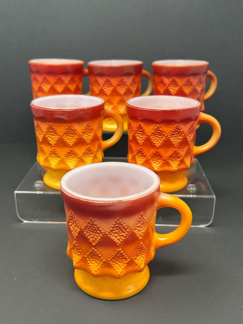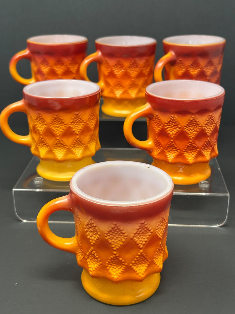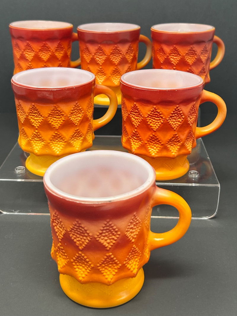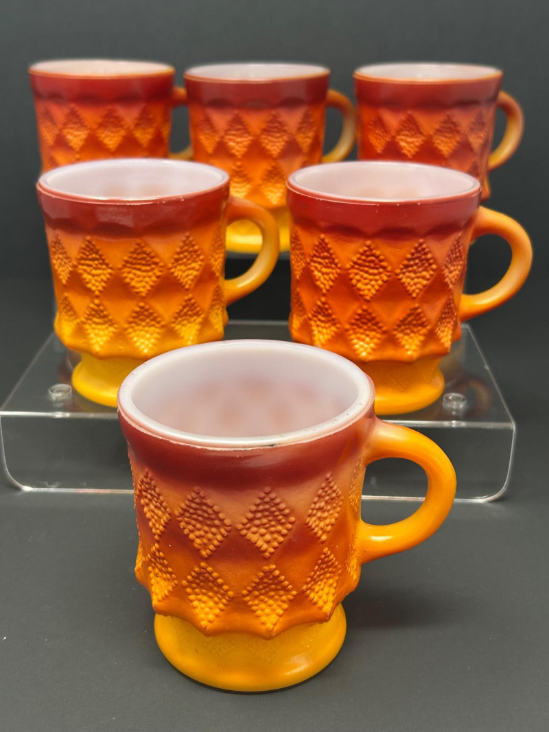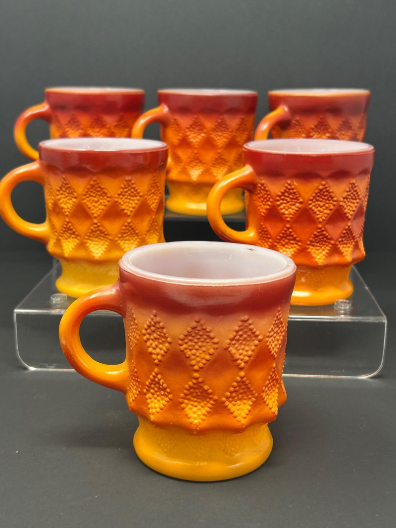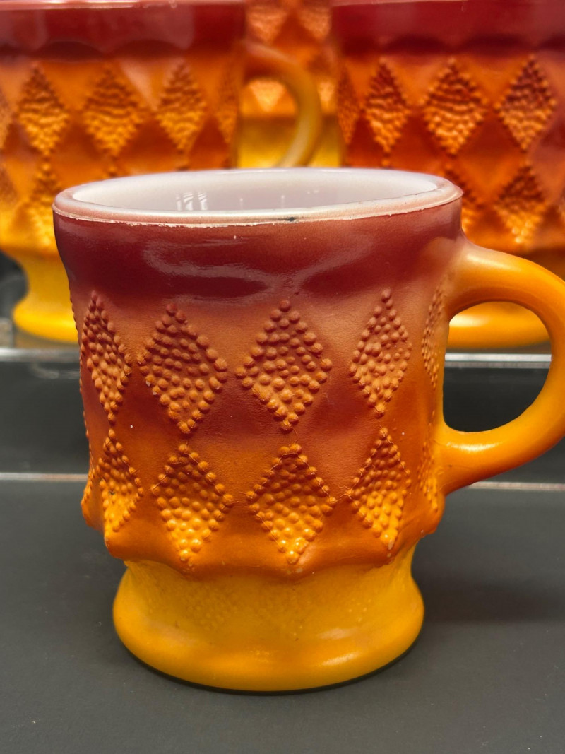 These are Fire-King Kimberly mugs, produced by Anchor Hocking in the 1960s–70s. The distinctive diamond-textured pattern and bold gradient glaze—often transitioning from red to orange or yellow—are signature features of the Kimberly design, named after the diamond mines of Kimberly, South Africa. Pattern: Kimberly (raised diamond texture) Maker: Anchor Hocking Fire-King Material: Heat-resistant milk glass with fired-on color Colorway: Commonly called “Red-Orange” or “Amberina” depending on the intensity Era: Circa 1960s–1970s 3.5” tall 3” diameter Identification Highlights: