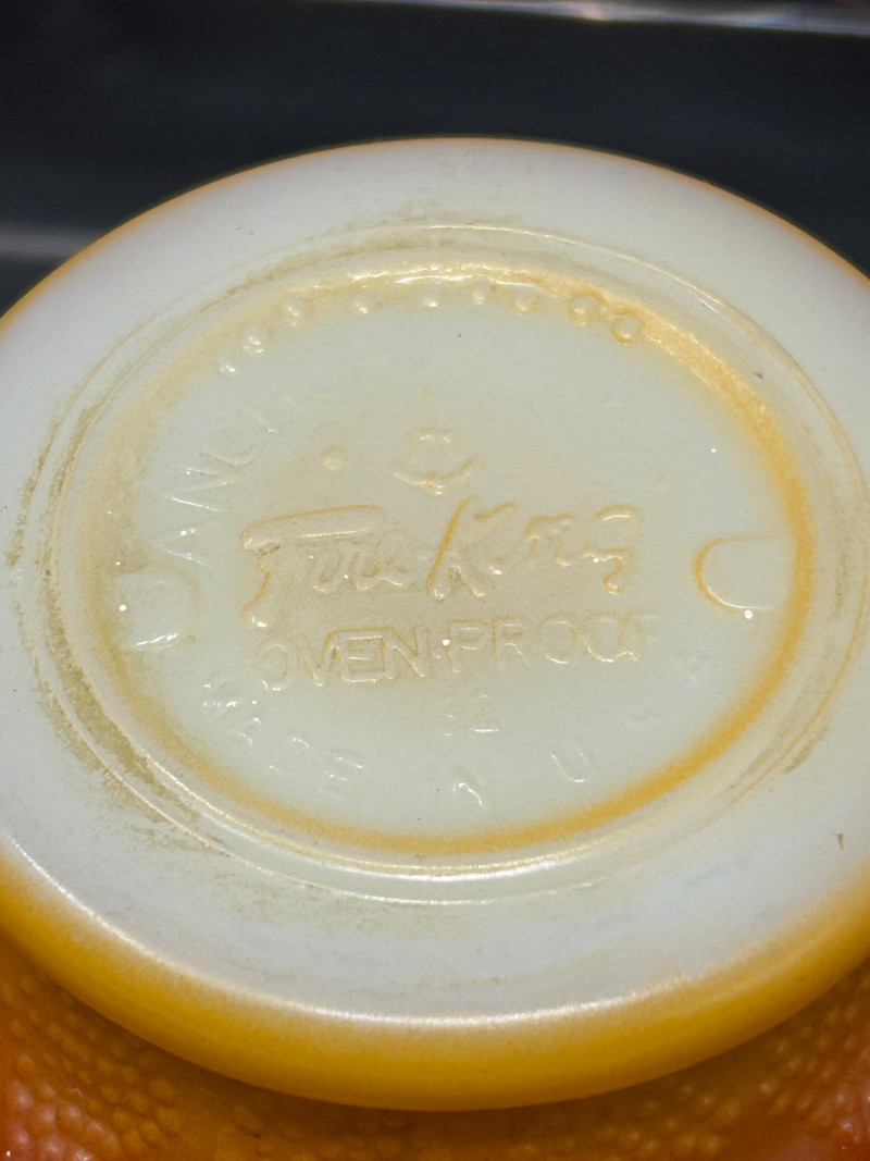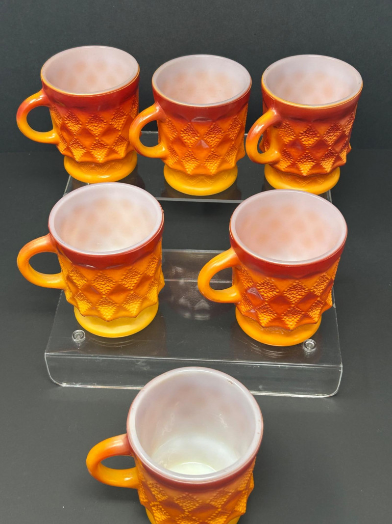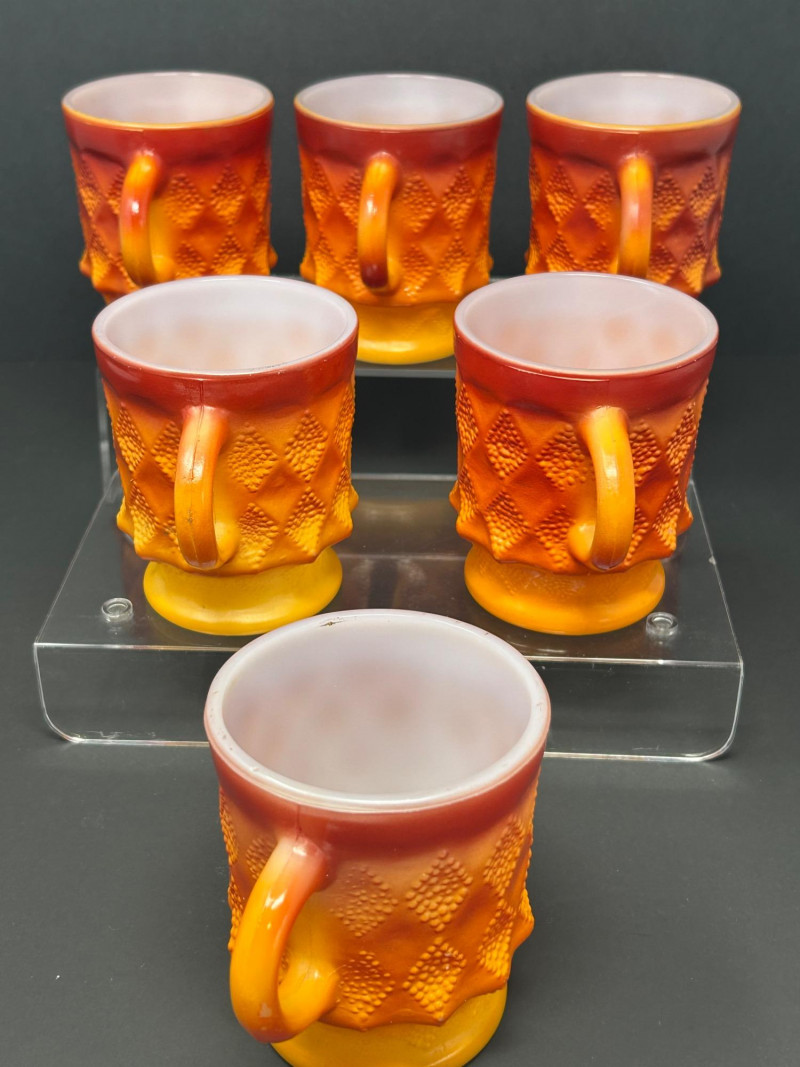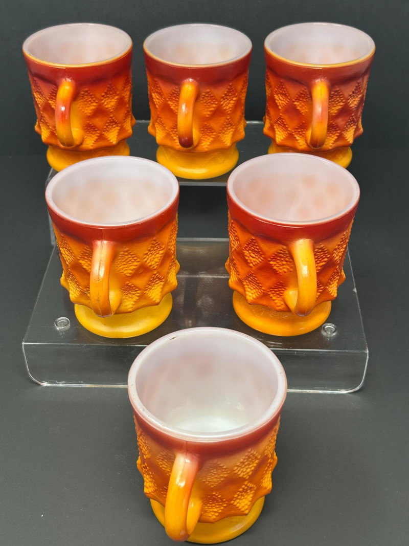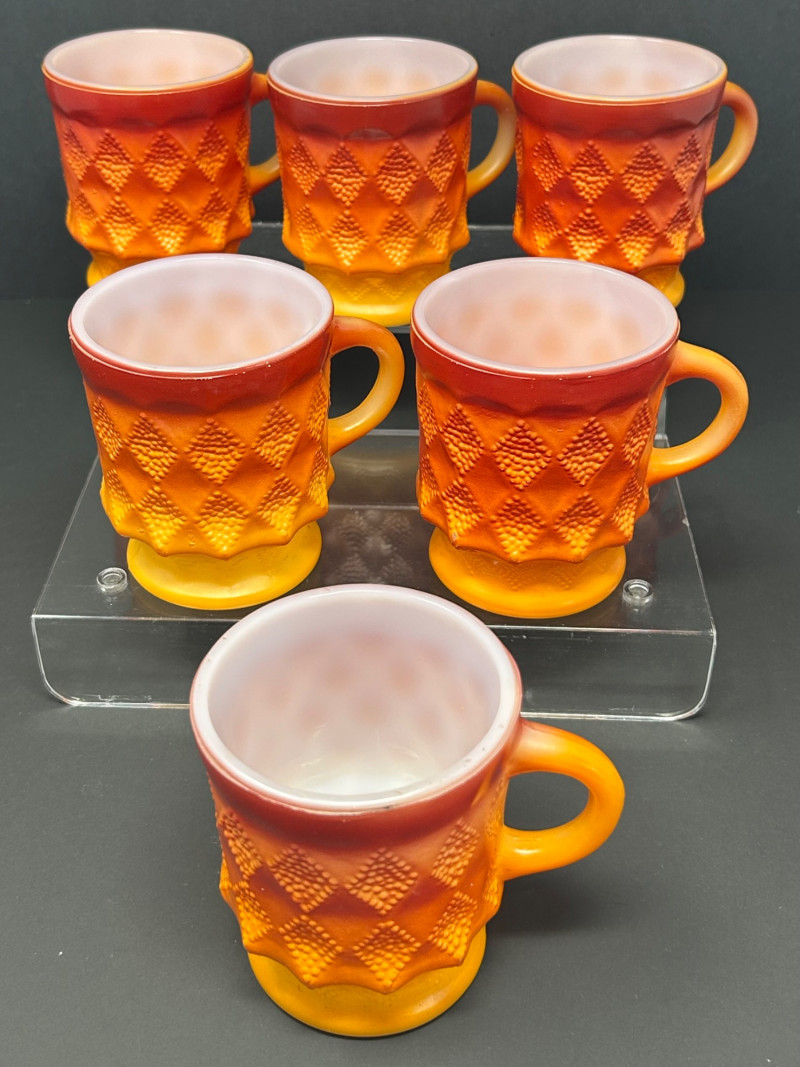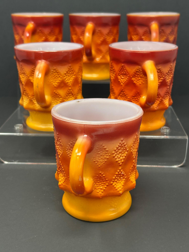 These are Fire-King Kimberly mugs, produced by Anchor Hocking in the 1960s–70s. The distinctive diamond-textured pattern and bold gradient glaze—often transitioning from red to orange or yellow—are signature features of the Kimberly design, named after the diamond mines of Kimberly, South Africa. Pattern: Kimberly (raised diamond texture) Maker: Anchor Hocking Fire-King Material: Heat-resistant milk glass with fired-on color Colorway: Commonly called “Red-Orange” or “Amberina” depending on the intensity Era: Circa 1960s–1970s 3.5” tall 3” diameter Identification Highlights: