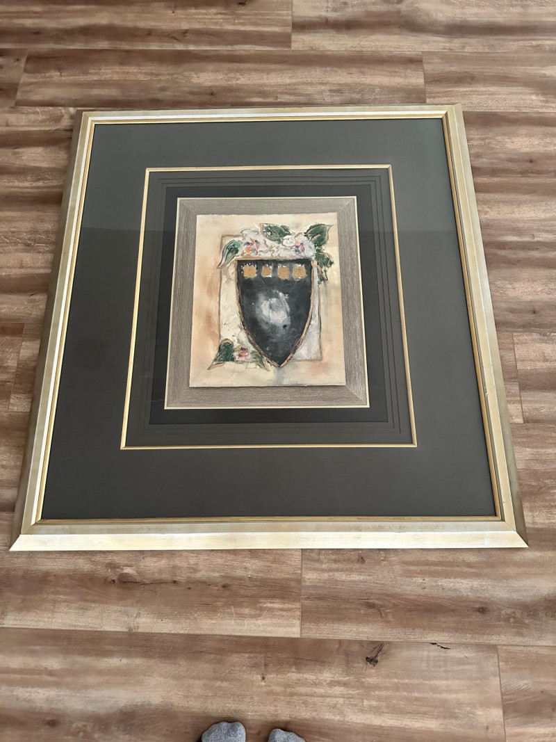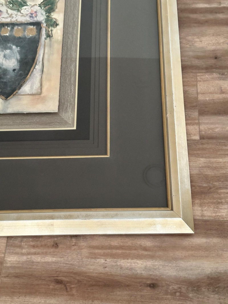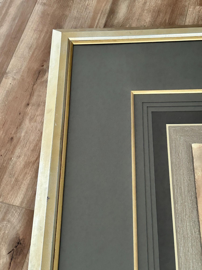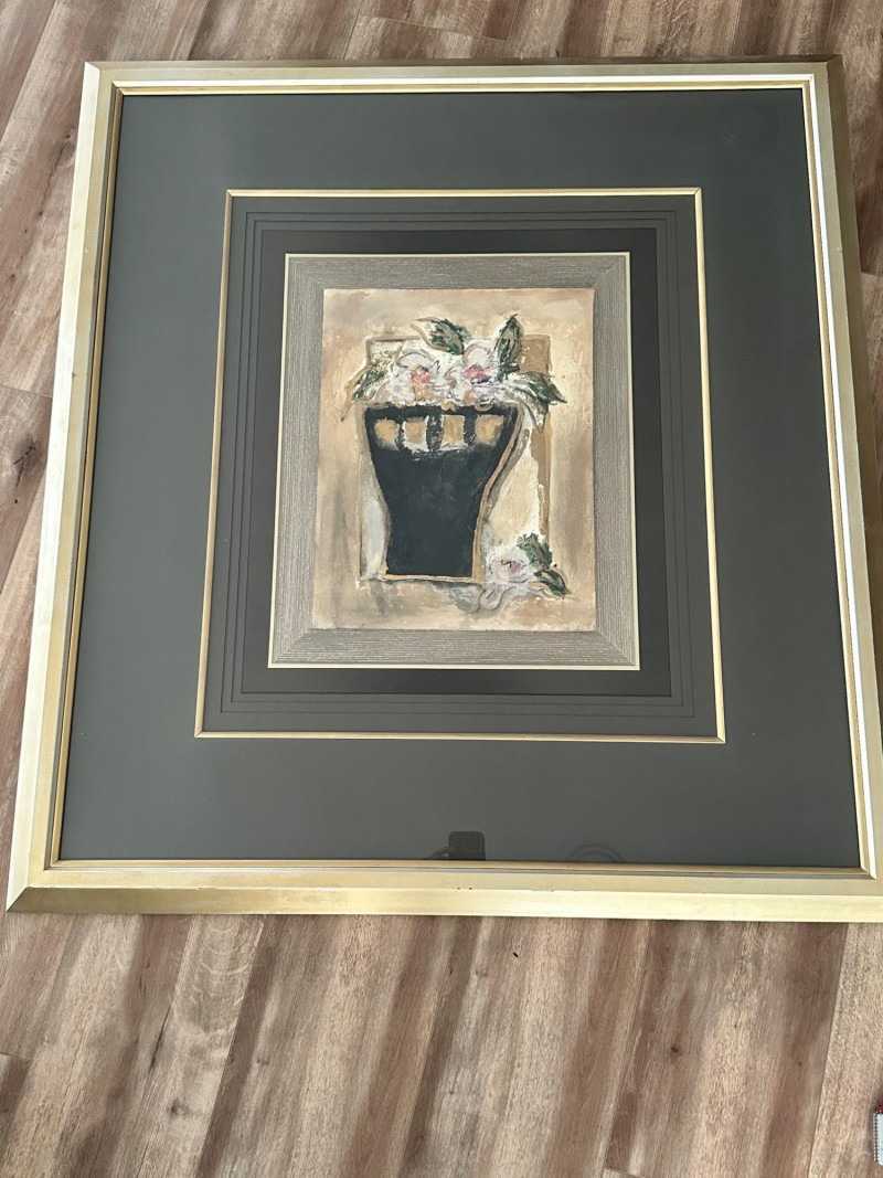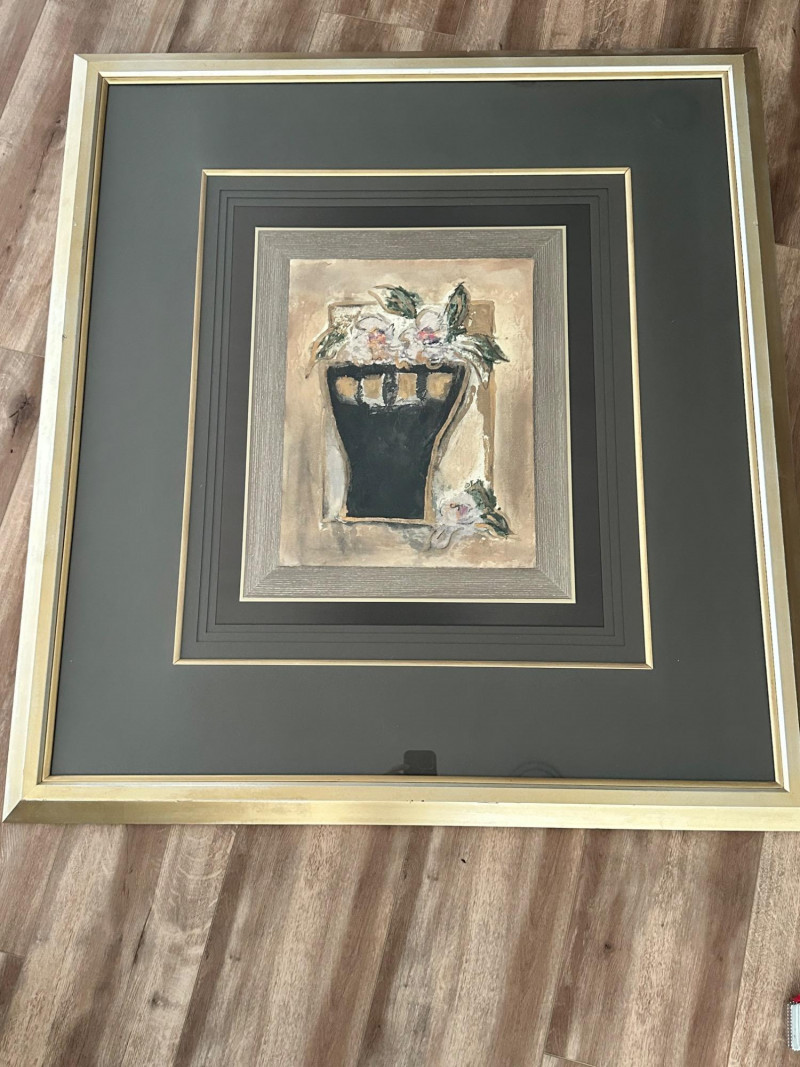 A striking very large framed wall art piece featuring a classic Tuscan-inspired urn and floral motif. The composition evokes Old World European décor, with soft earth tones, painterly textures, and a timeless Mediterranean aesthetic. The artwork is professionally presented in an oversized, multi-layer matting arrangement, combining deep charcoal and black mats with subtle gold accent lines. It is finished with a wide gold-tone frame, giving the piece a dramatic presence and refined architectural depth. The layered presentation draws the eye inward, making it an ideal statement piece for formal living spaces, dining rooms, entryways, or traditional interiors. Style: Tuscany / Mediterranean / Old World Subject: Classical urn with floral accents Medium: Print Presentation: Extra-large framed wall art Matting: Multi-layer mat with gold accent lines Frame: Wide gold-tone frame Orientation: SquareDetails: