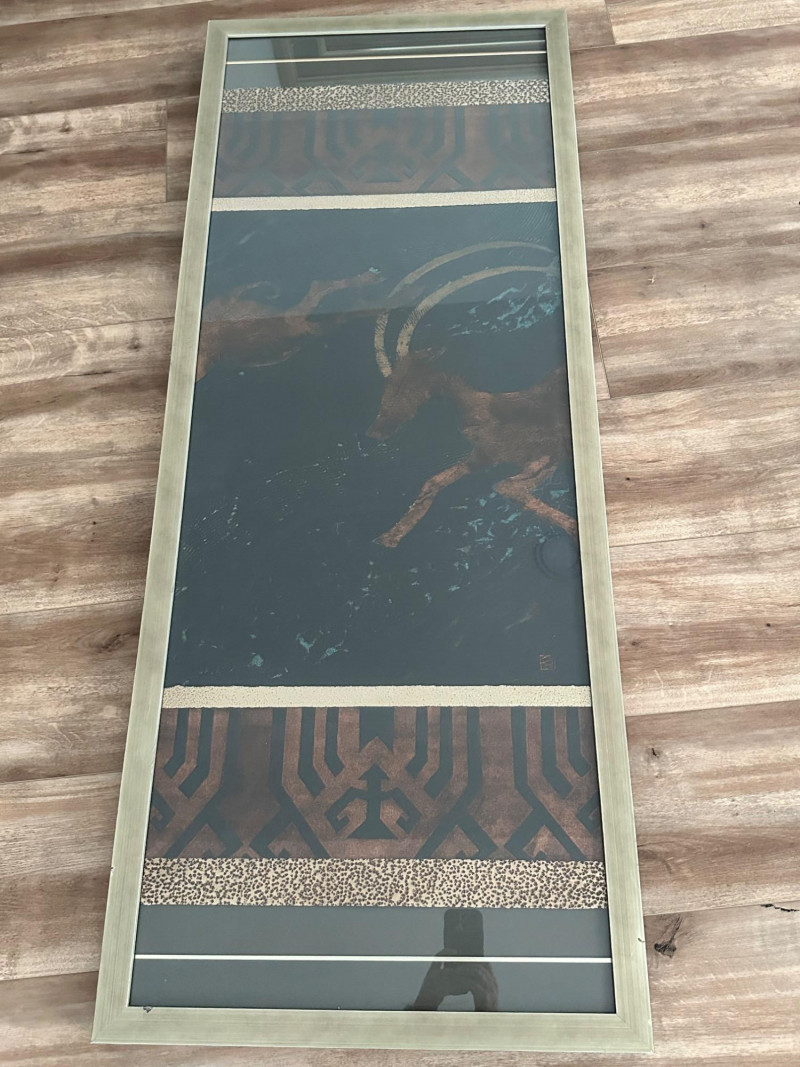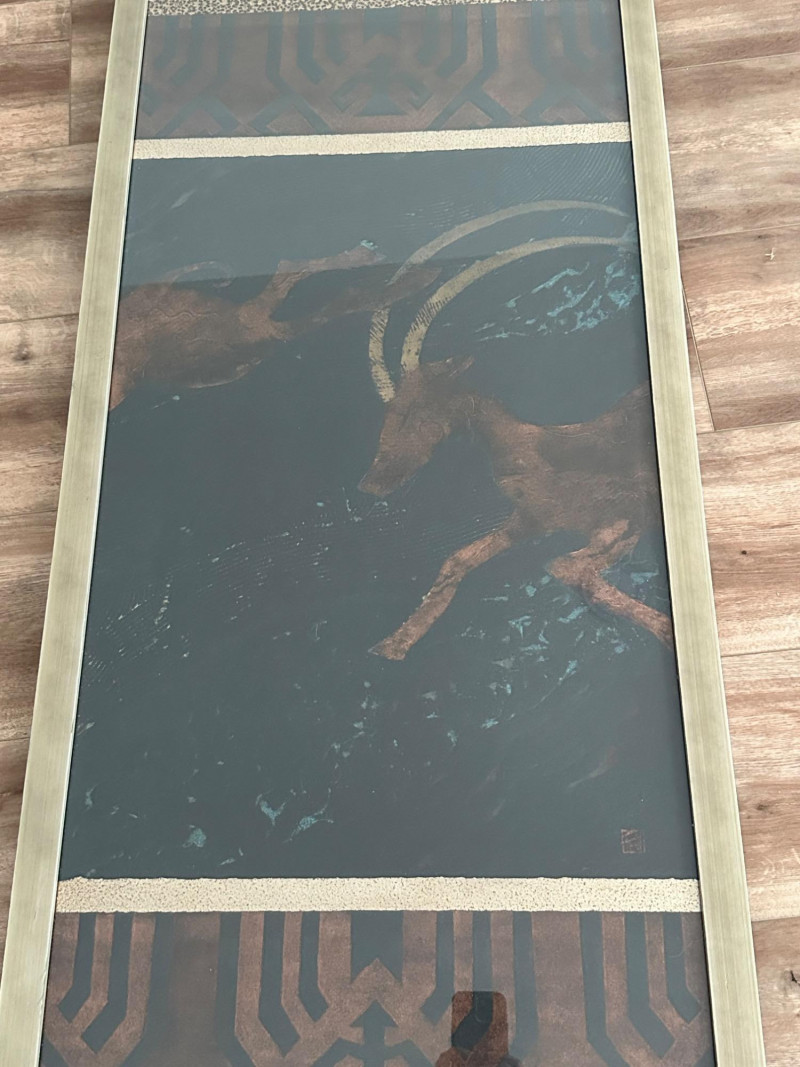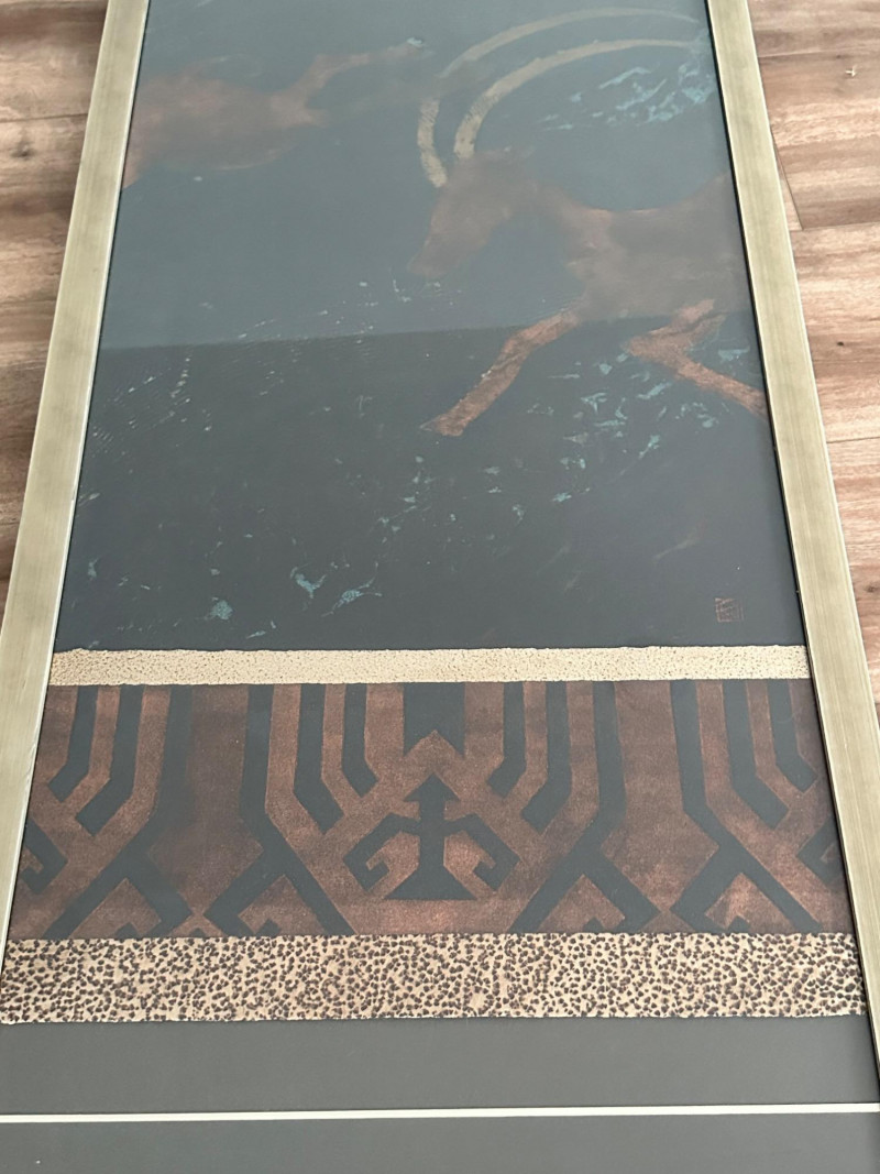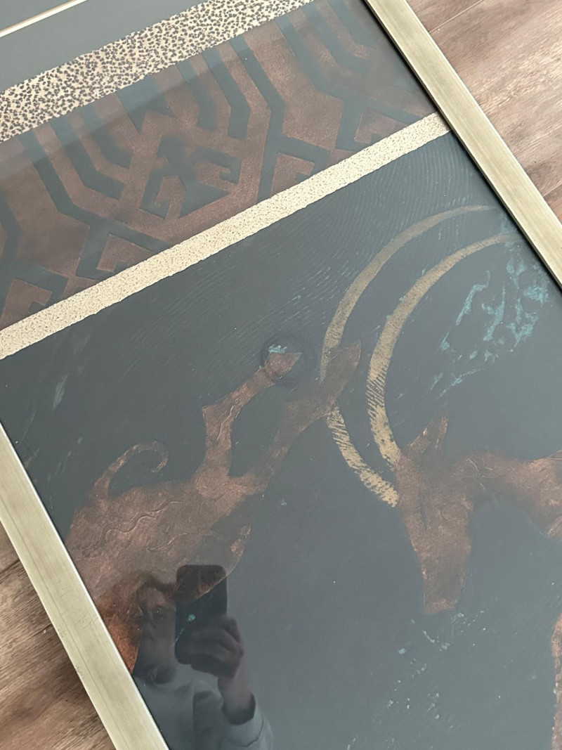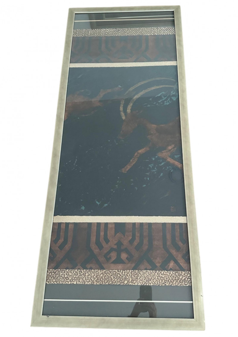 Bold contemporary abstract panel artwork featuring a stylized antelope-like figure rendered in expressive metallic tones. The animal form—defined by sweeping curved horns and elongated movement—emerges against a deep charcoal-green background, layered with horizontal bands of geometric patterning and textured accents. Warm bronze and copper hues contrast beautifully with subtle teal highlights, giving the piece depth, motion, and a refined modern presence. The tall vertical format enhances the sense of movement and makes this artwork especially well suited for hallways, entryways, stairwells, or narrow wall spaces. The piece is framed in a muted gold-tone molded frame that complements the metallic elements within the composition, creating a cohesive and decorative presentation. Artwork Type: Contemporary abstract decorative panel Orientation: Vertical Motif: Stylized antelope / antelope-like animal figure Design Elements: Geometric patterned bands Textured accent strips Metallic bronze and copper abstract forms Dark charcoal-green ground with subtle teal accents Frame: Gold-tone molded frameDetails: