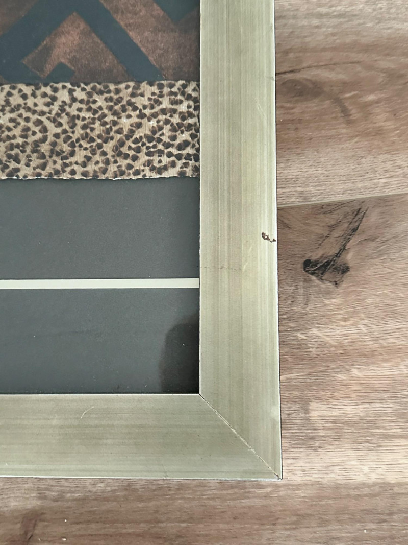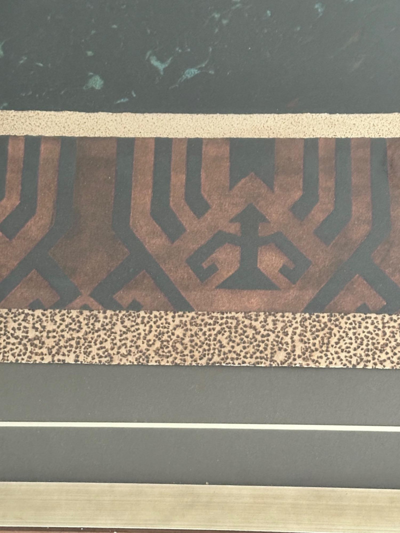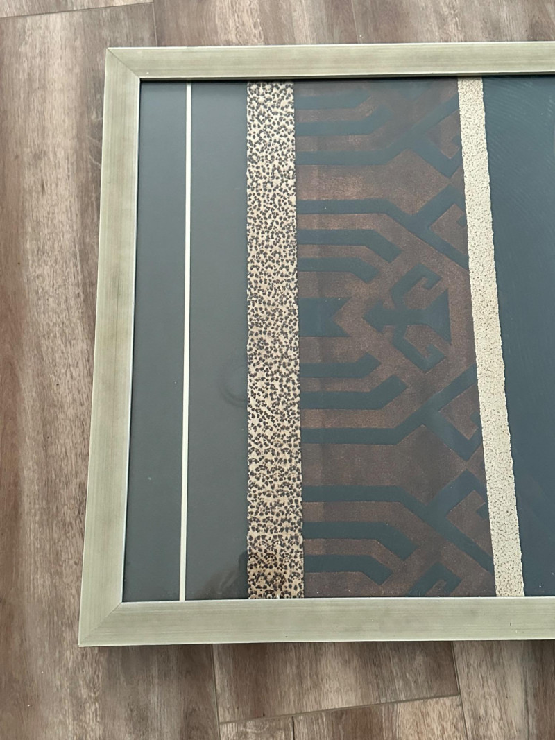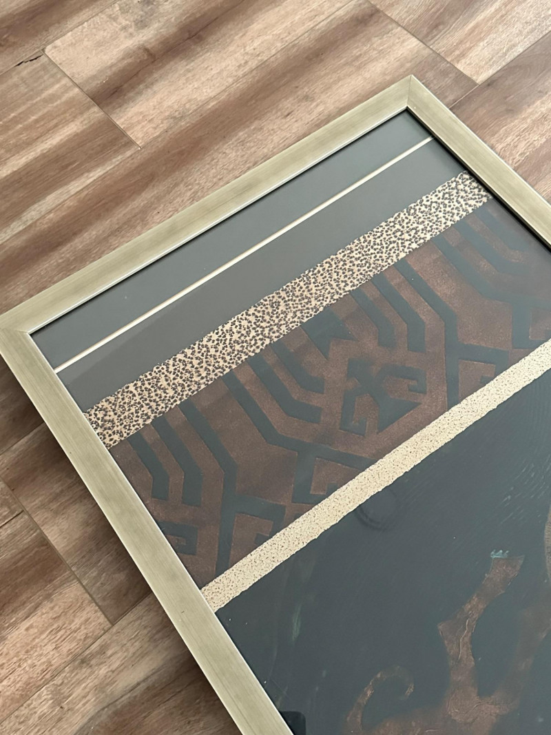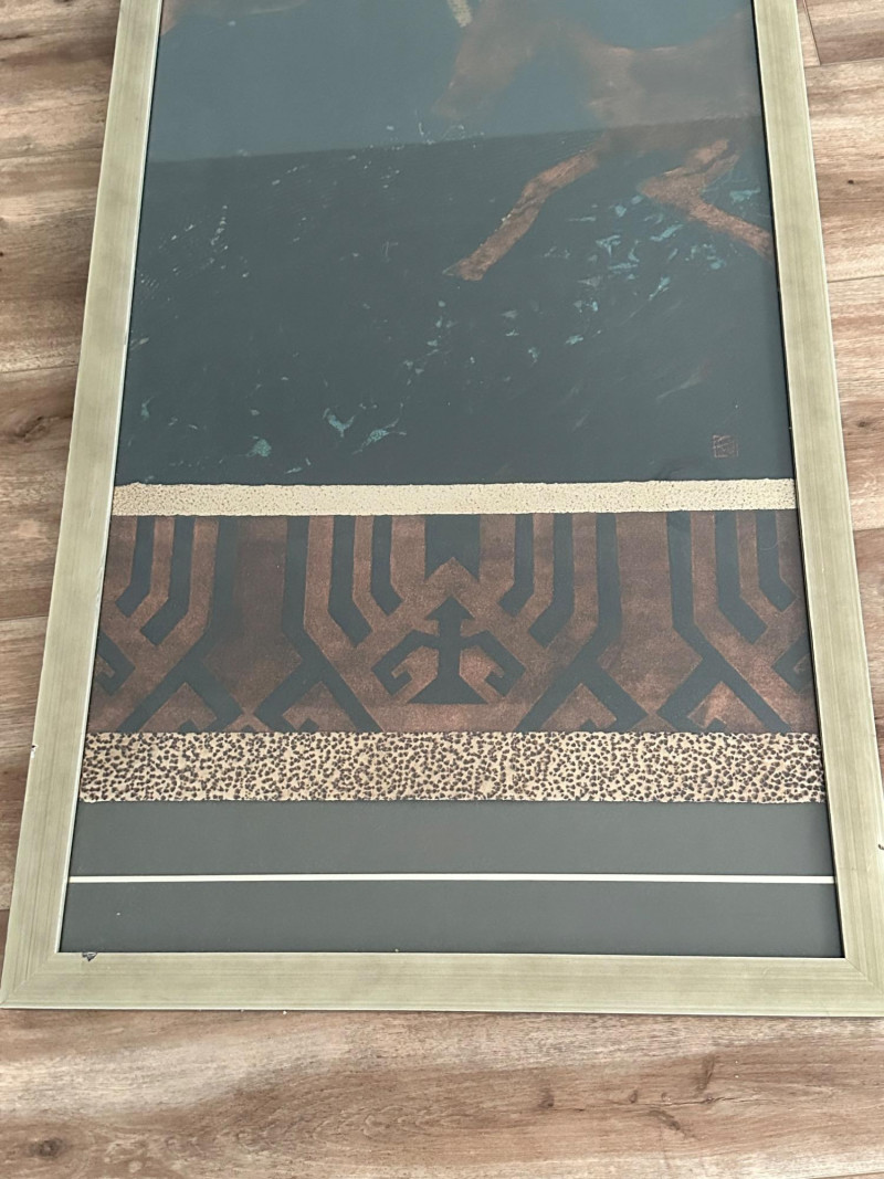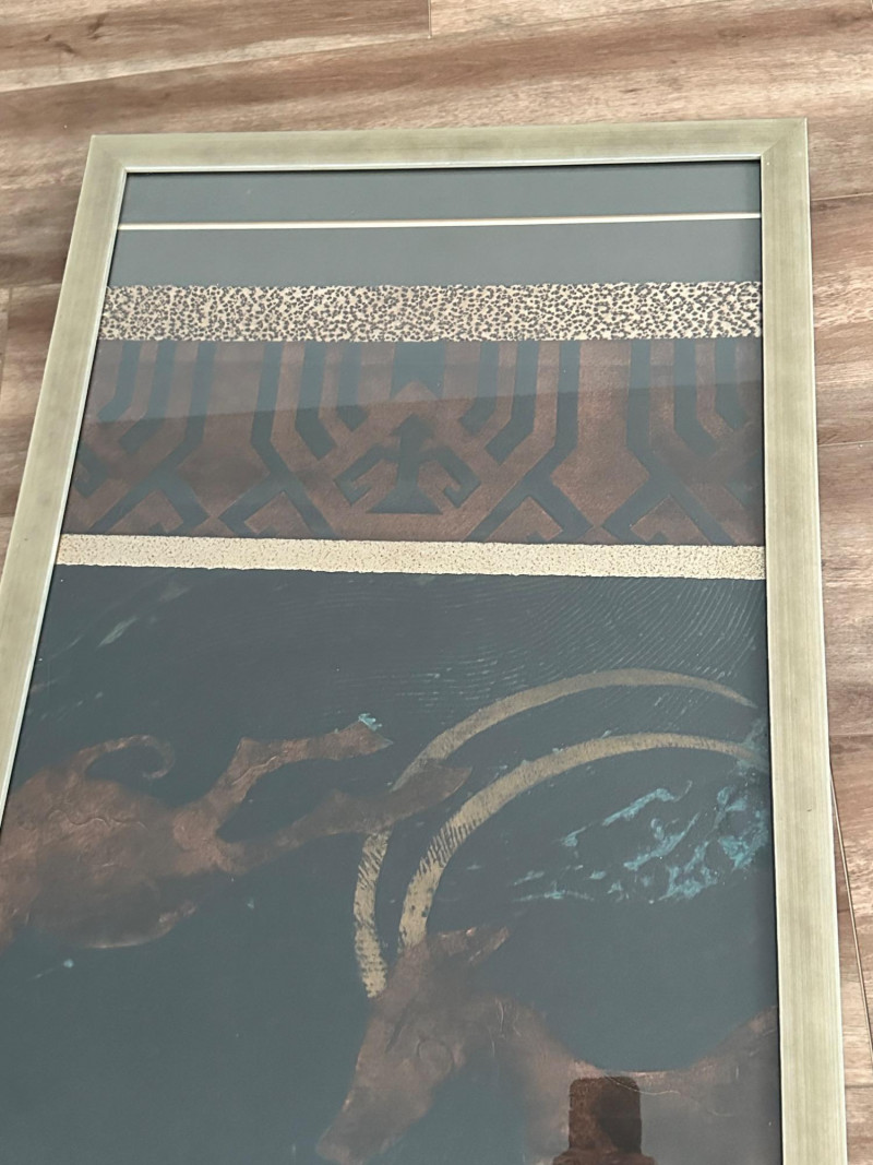 Bold contemporary abstract panel artwork featuring a stylized antelope-like figure rendered in expressive metallic tones. The animal form—defined by sweeping curved horns and elongated movement—emerges against a deep charcoal-green background, layered with horizontal bands of geometric patterning and textured accents. Warm bronze and copper hues contrast beautifully with subtle teal highlights, giving the piece depth, motion, and a refined modern presence. The tall vertical format enhances the sense of movement and makes this artwork especially well suited for hallways, entryways, stairwells, or narrow wall spaces. The piece is framed in a muted gold-tone molded frame that complements the metallic elements within the composition, creating a cohesive and decorative presentation. Artwork Type: Contemporary abstract decorative panel Orientation: Vertical Motif: Stylized antelope / antelope-like animal figure Design Elements: Geometric patterned bands Textured accent strips Metallic bronze and copper abstract forms Dark charcoal-green ground with subtle teal accents Frame: Gold-tone molded frameDetails:
