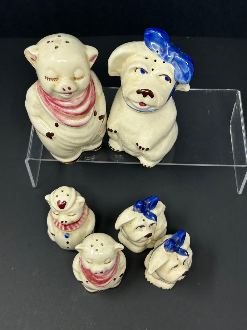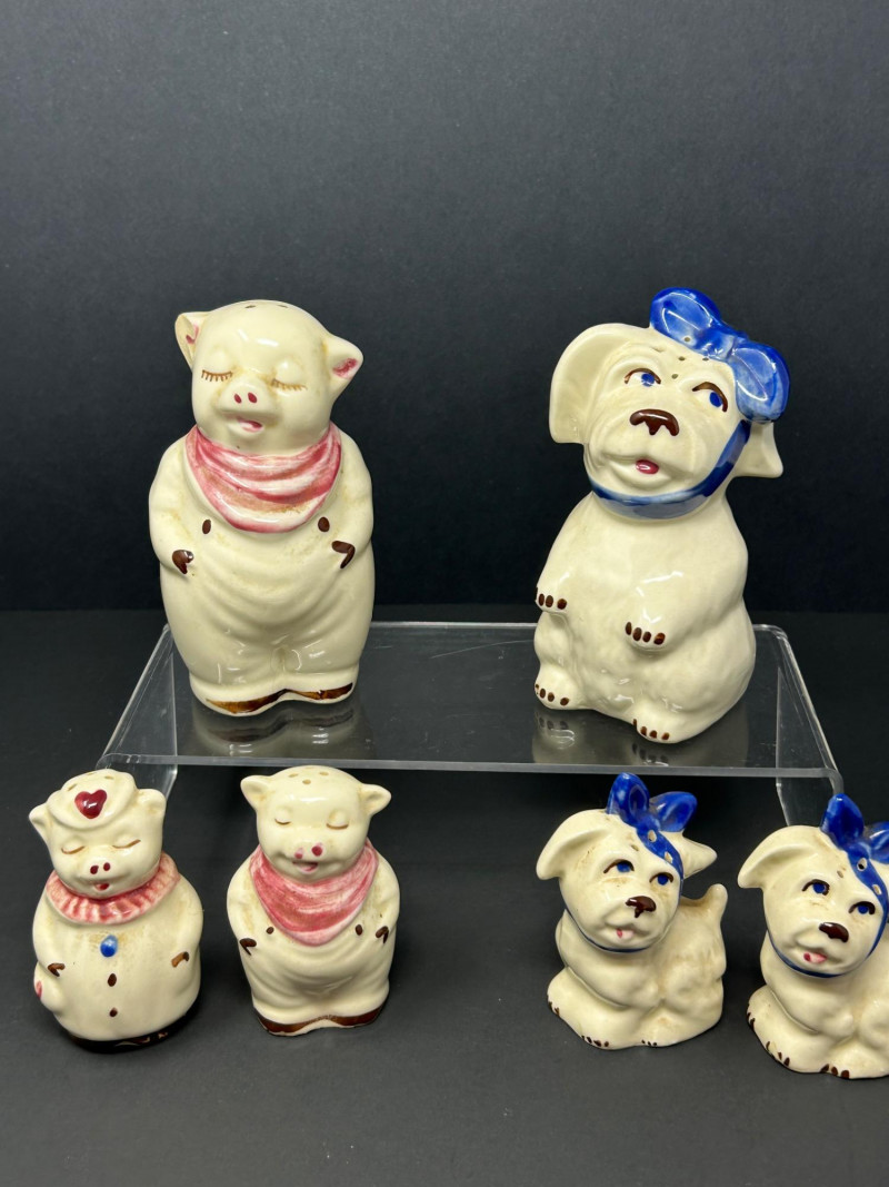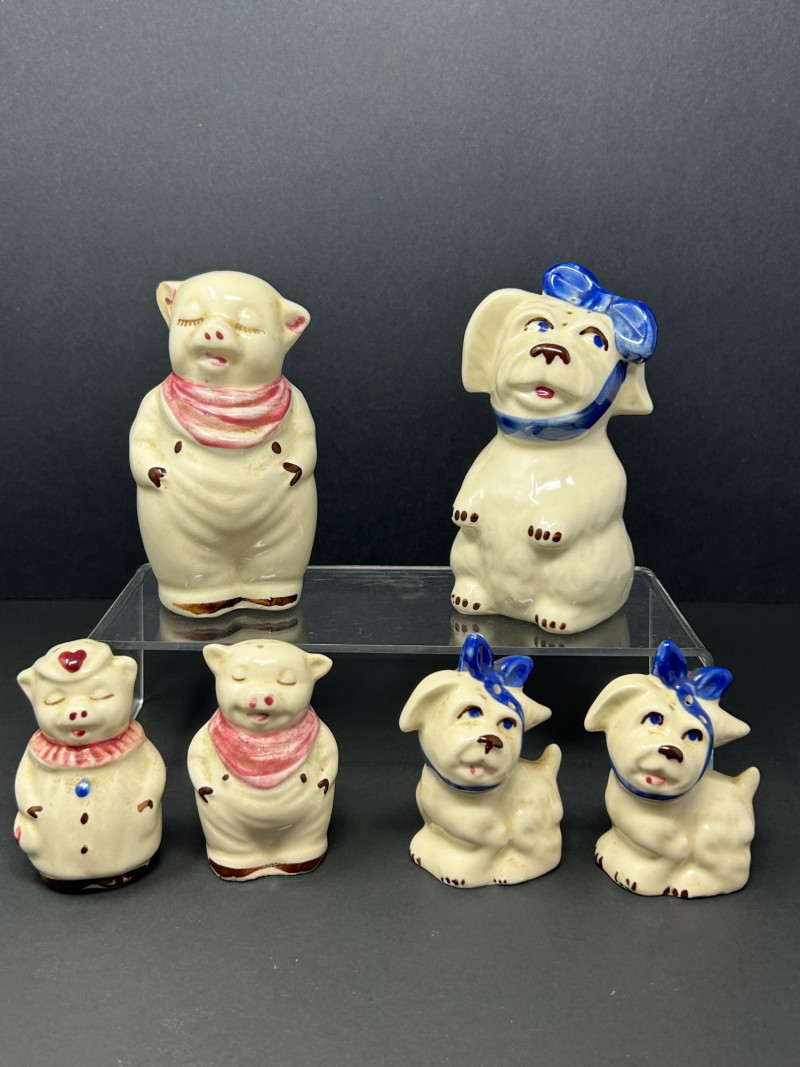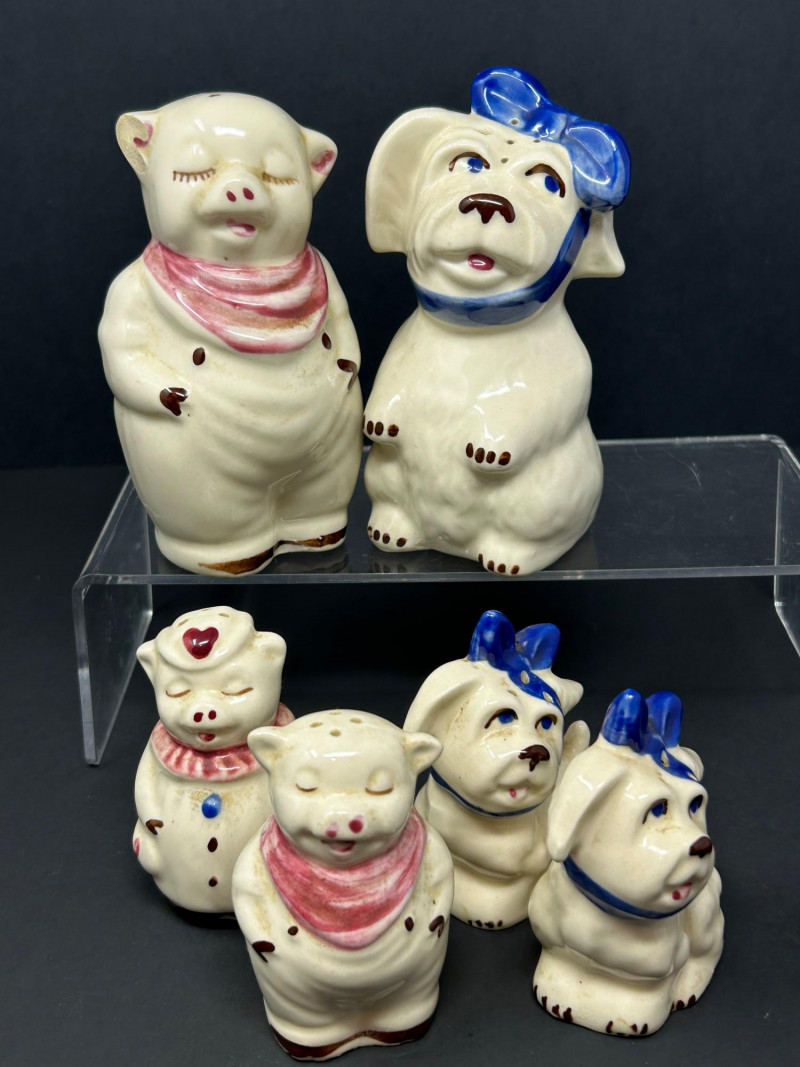 A charming vintage Shawnee Pottery shaker assortment featuring two of Shawnee’s most beloved novelty designs: the Smiley / Winnie Pig and the Mugsy (Toothache) Dog. This mixed lot includes both larger display-size shakers and smaller companion shakers, all finished in Shawnee’s classic creamy ivory glaze with hand-painted pink and blue accents. The pigs feature the iconic closed-eye “smiley” expression with red/pink scarf detail, while the dogs display the expressive Mugsy look with blue bows and collars. These designs date to the 1940s–1950s and remain highly collectible among Shawnee and novelty pottery collectors. Maker: Shawnee Pottery Patterns / Characters: Smiley Pig / Winnie Pig Mugsy Dog (Toothache) Material: Glazed ceramic Era: Mid-20th century (circa 1940s–1950s) Includes (6 total pieces): (2) Larger shakers – approx. 5.5" tall (4) Smaller shakers – approx. 3.5" tallDetails: