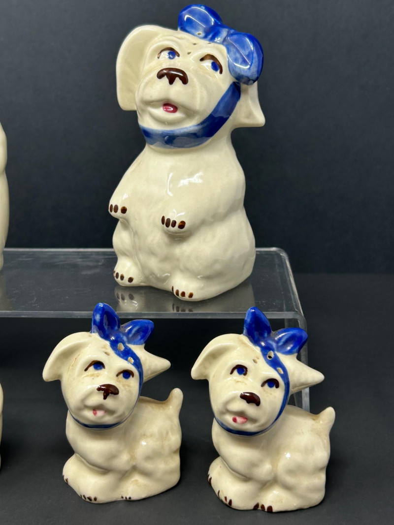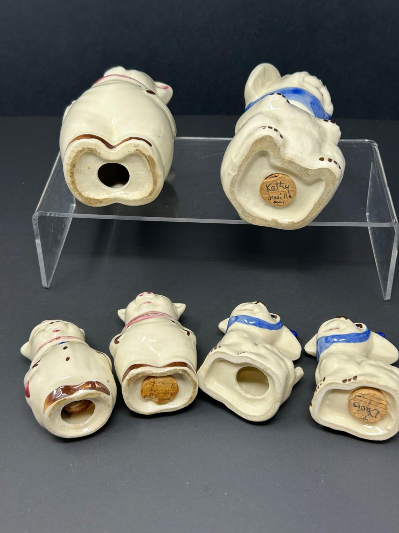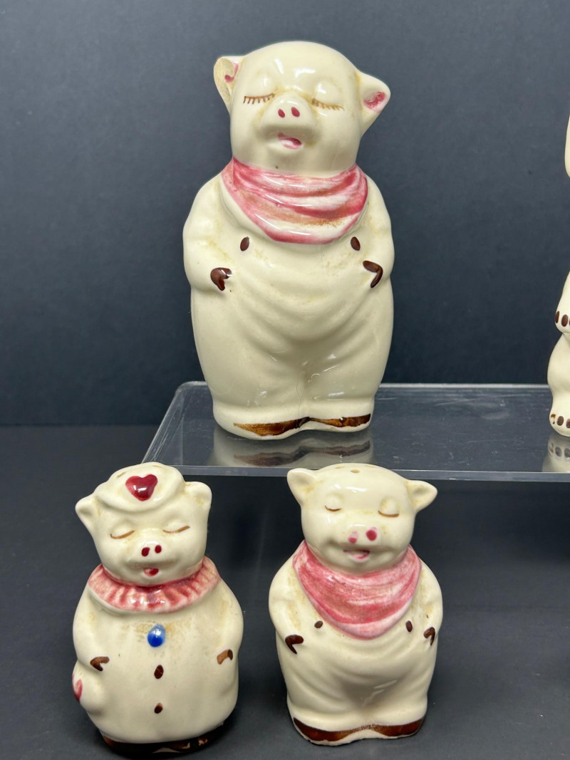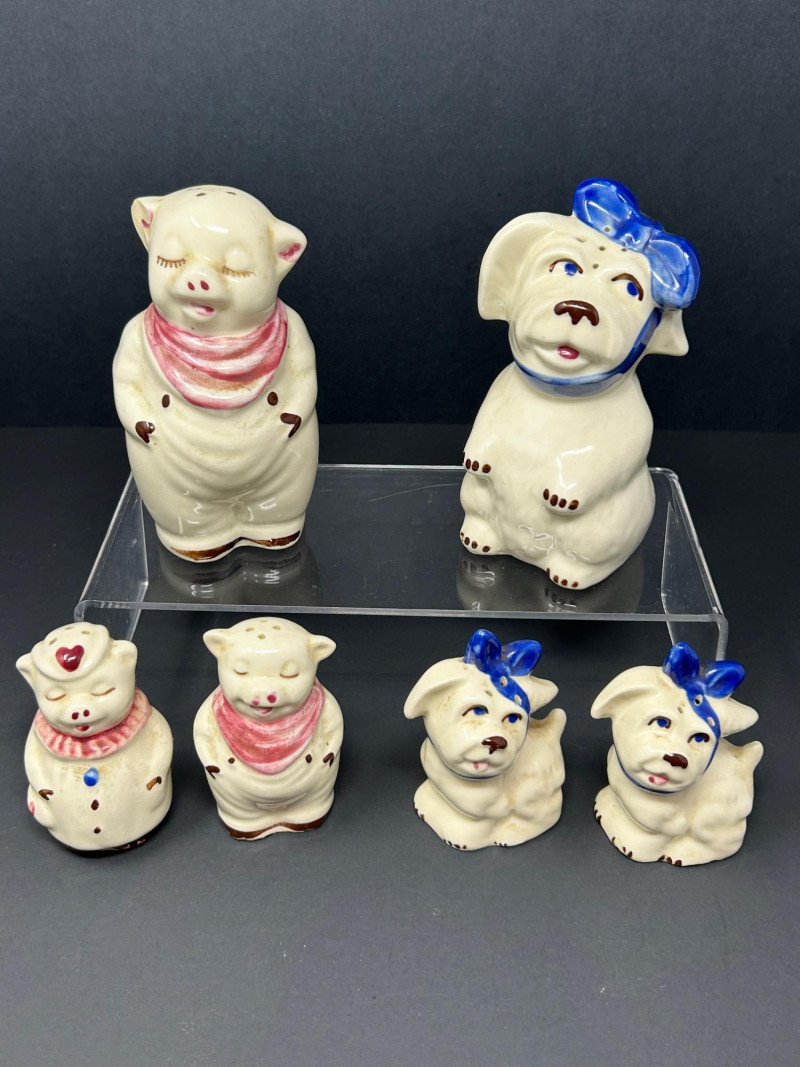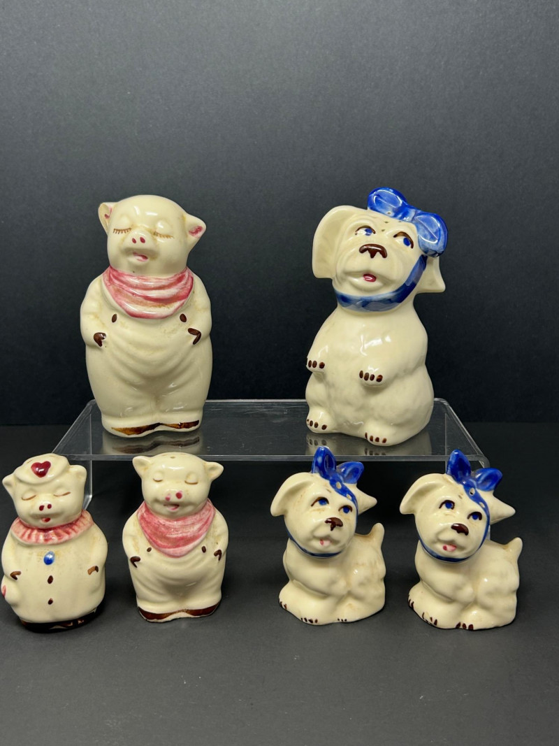A charming vintage Shawnee Pottery shaker assortment featuring two of Shawnee’s most beloved novelty designs: the Smiley / Winnie Pig and the Mugsy (Toothache) Dog. This mixed lot includes both larger display-size shakers and smaller companion shakers, all finished in Shawnee’s classic creamy ivory glaze with hand-painted pink and blue accents. The pigs feature the iconic closed-eye “smiley” expression with red/pink scarf detail, while the dogs display the expressive Mugsy look with blue bows and collars. These designs date to the 1940s–1950s and remain highly collectible among Shawnee and novelty pottery collectors. Maker: Shawnee Pottery Patterns / Characters: Smiley Pig / Winnie Pig Mugsy Dog (Toothache) Material: Glazed ceramic Era: Mid-20th century (circa 1940s–1950s) Includes (6 total pieces): (2) Larger shakers – approx. 5.5" tall (4) Smaller shakers – approx. 3.5" tallDetails: