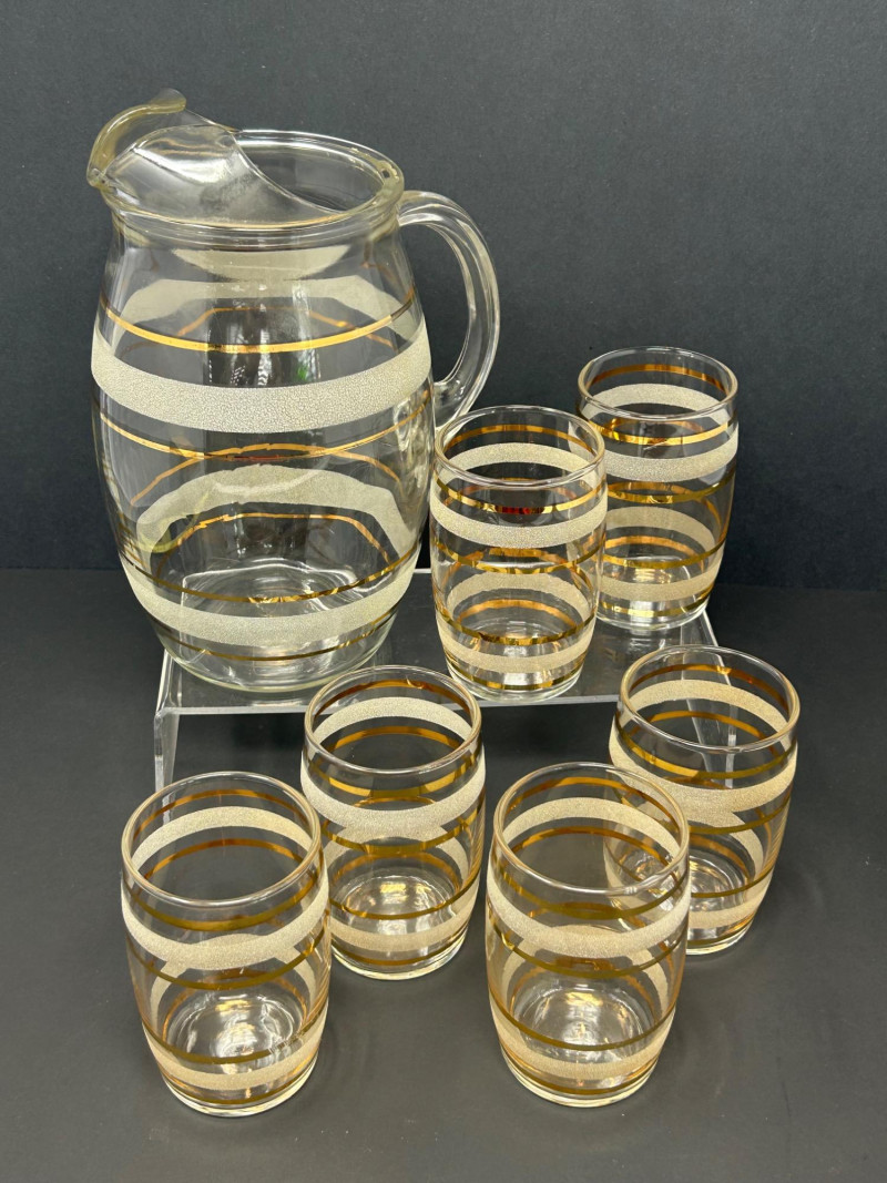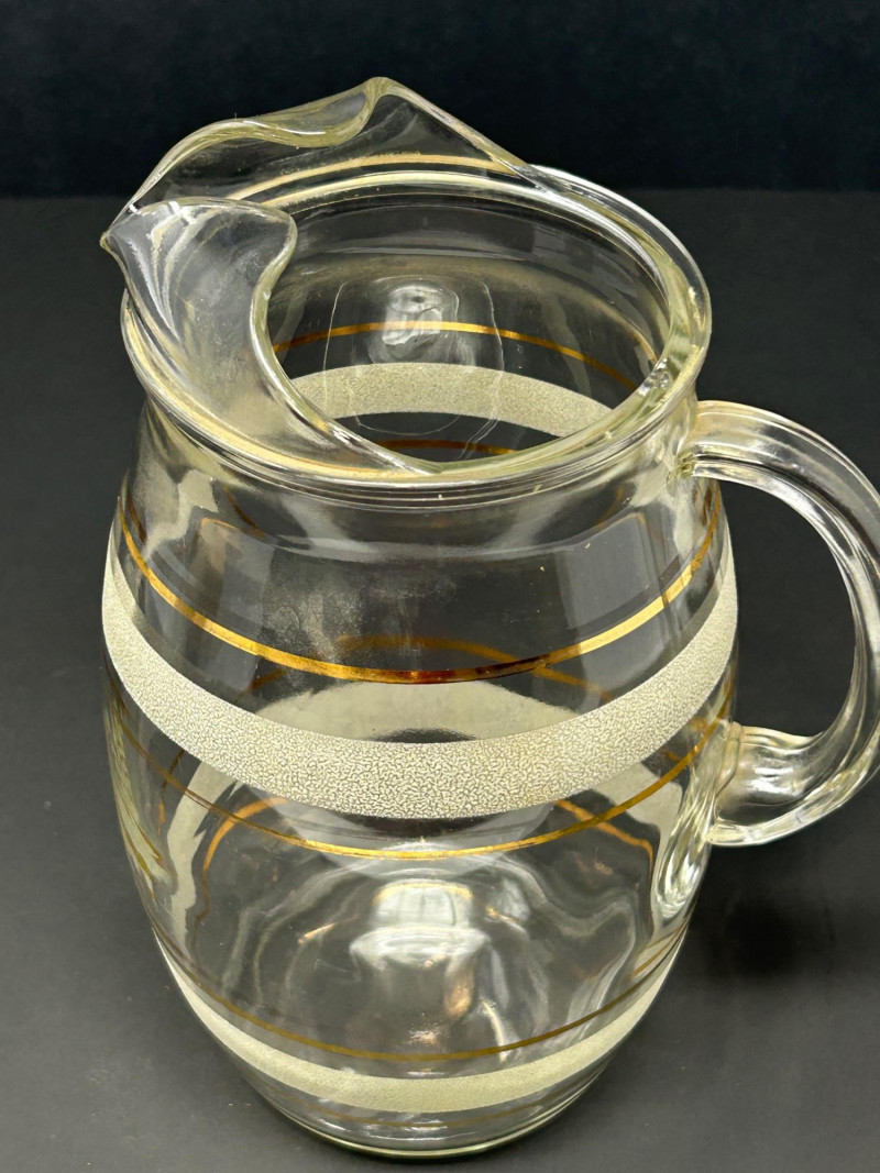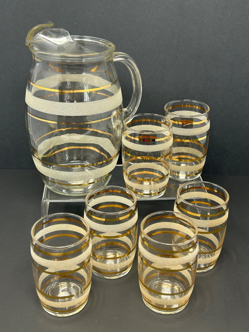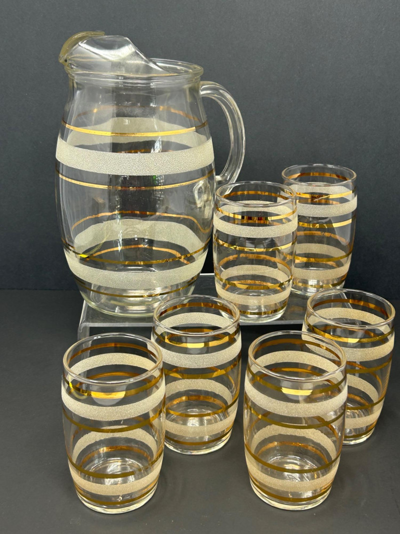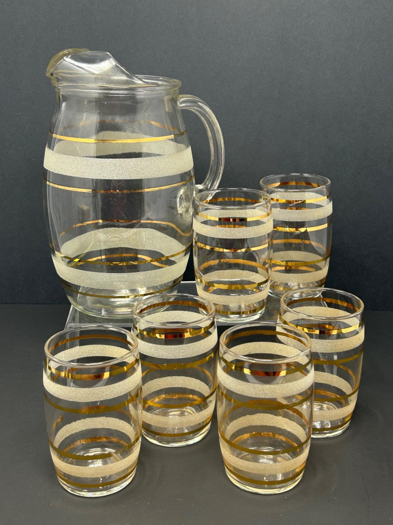 Attractive vintage clear glass beverage set featuring a classic carafe and matching tumblers, decorated with gold trim and white frosted textured bands. The balanced proportions, rounded carafe form, and horizontal band design reflect a timeless mid-century modern aesthetic. The carafe features an integrated handle and shaped pouring lip, making it both functional and decorative. This set is ideal for serving water, juice, wine, or cocktails, and also displays beautifully in a bar or dining setting. Set Includes: (1) Clear glass carafe (6) Matching tumblers Carafe Size: approx. 9" tall x 6" wide Tumbler Size: approx. 4.5" tall Material: Clear glass Decoration: Gold bands with white frosted textured accents Style: Vintage / Mid-Century ModernItem Details: