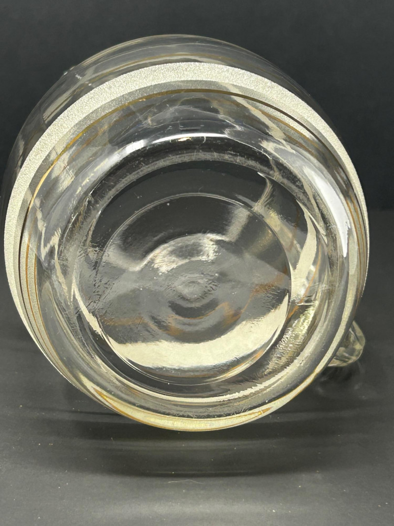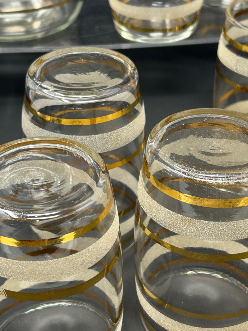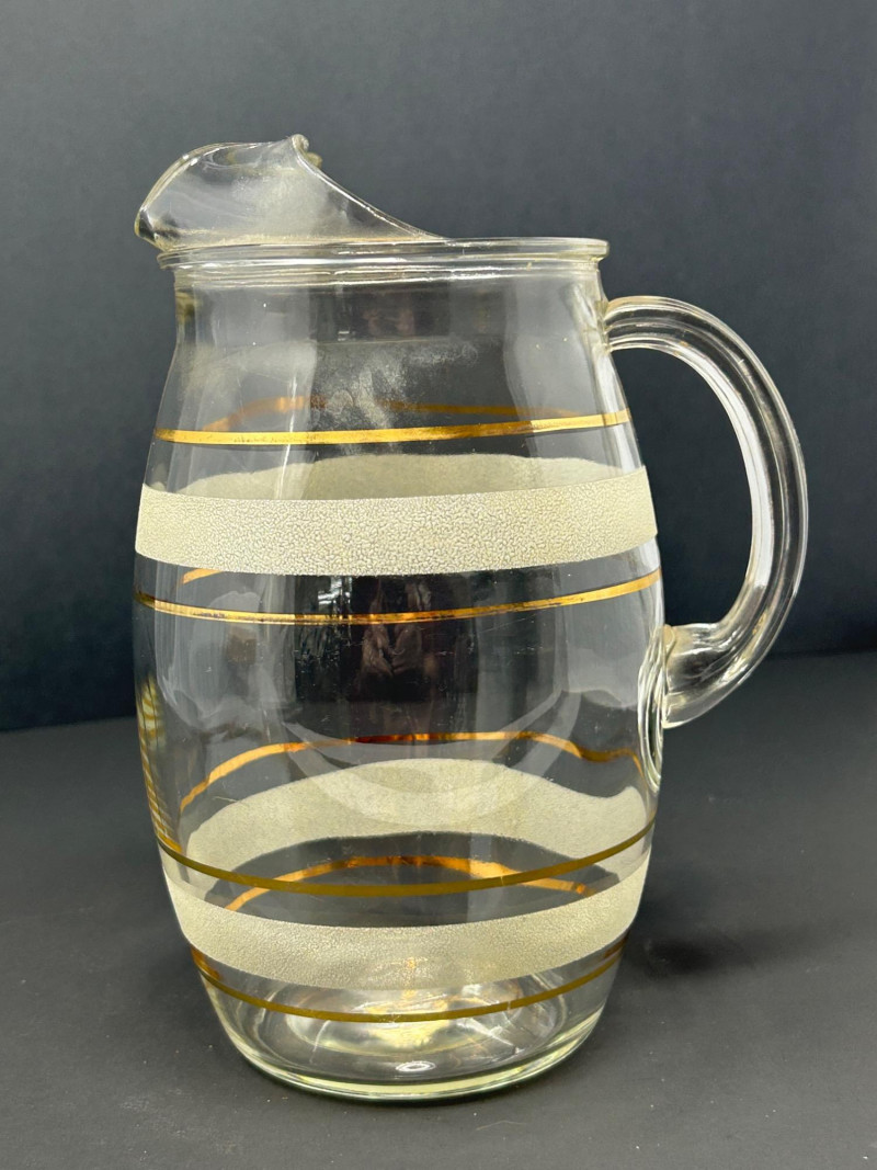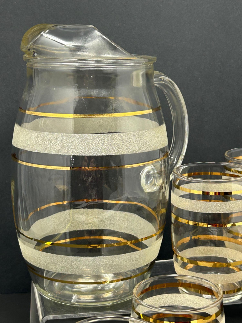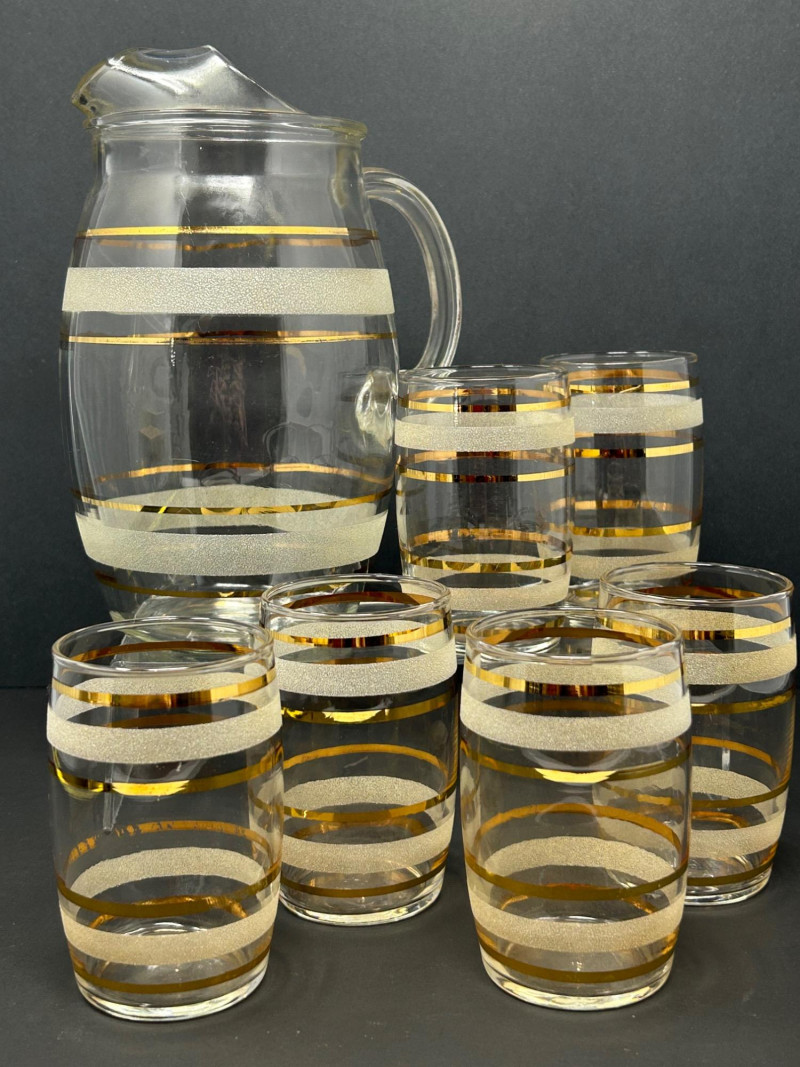 Attractive vintage clear glass beverage set featuring a classic carafe and matching tumblers, decorated with gold trim and white frosted textured bands. The balanced proportions, rounded carafe form, and horizontal band design reflect a timeless mid-century modern aesthetic. The carafe features an integrated handle and shaped pouring lip, making it both functional and decorative. This set is ideal for serving water, juice, wine, or cocktails, and also displays beautifully in a bar or dining setting. Set Includes: (1) Clear glass carafe (6) Matching tumblers Carafe Size: approx. 9" tall x 6" wide Tumbler Size: approx. 4.5" tall Material: Clear glass Decoration: Gold bands with white frosted textured accents Style: Vintage / Mid-Century ModernItem Details: