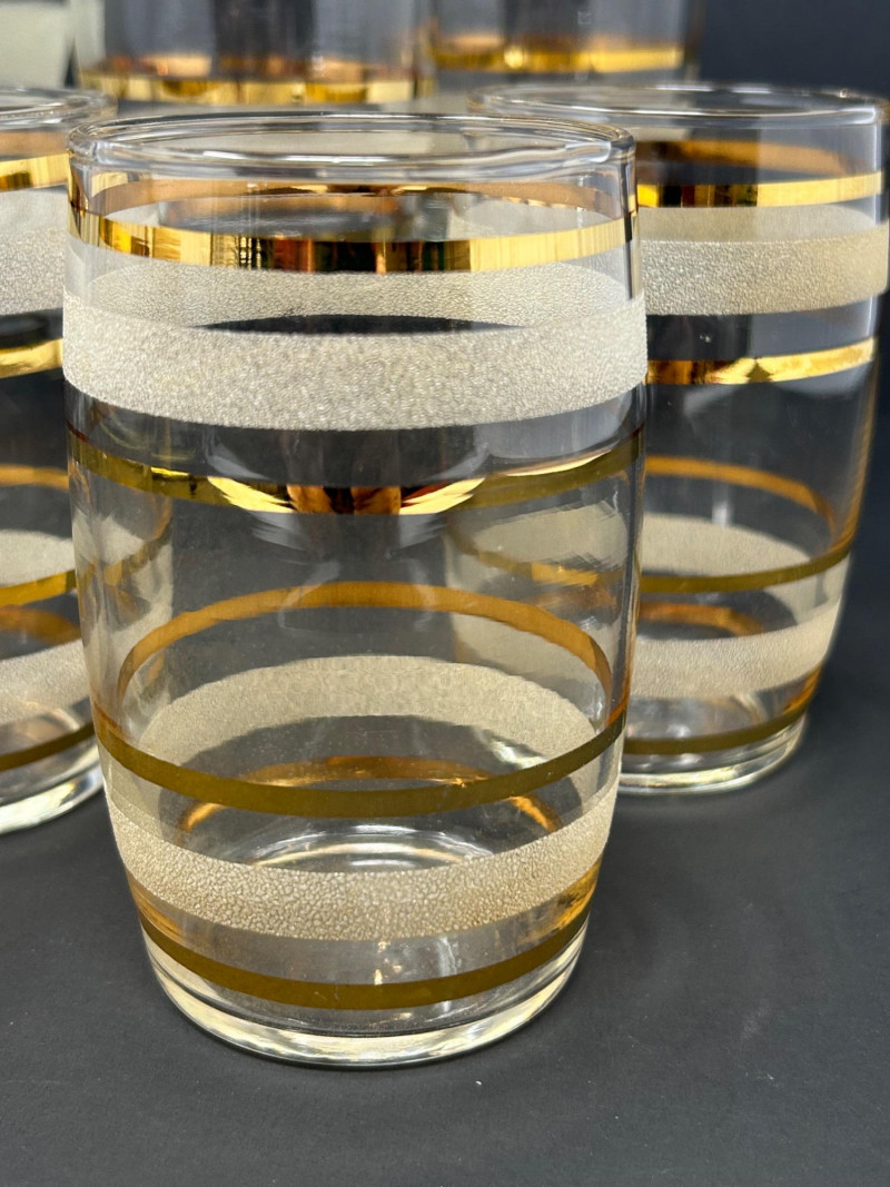 Lot # 63 - Vintage Clear Glass Carafe & Tumblers – Gold & White Frosted Bands