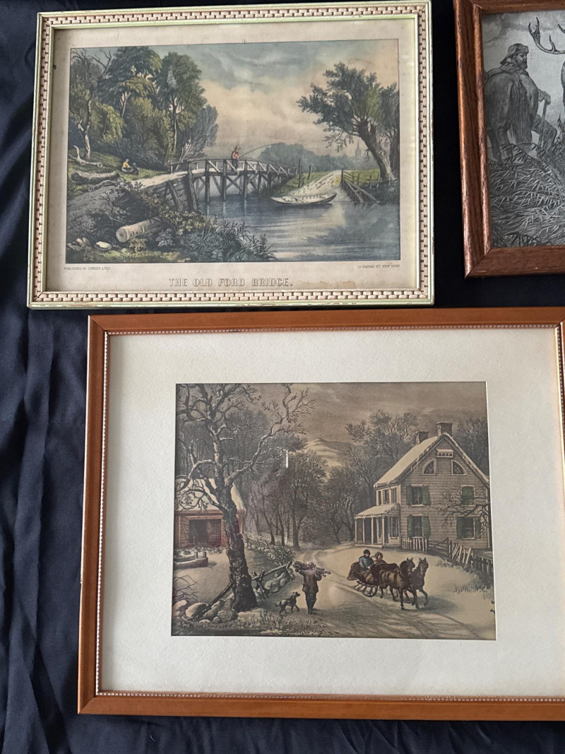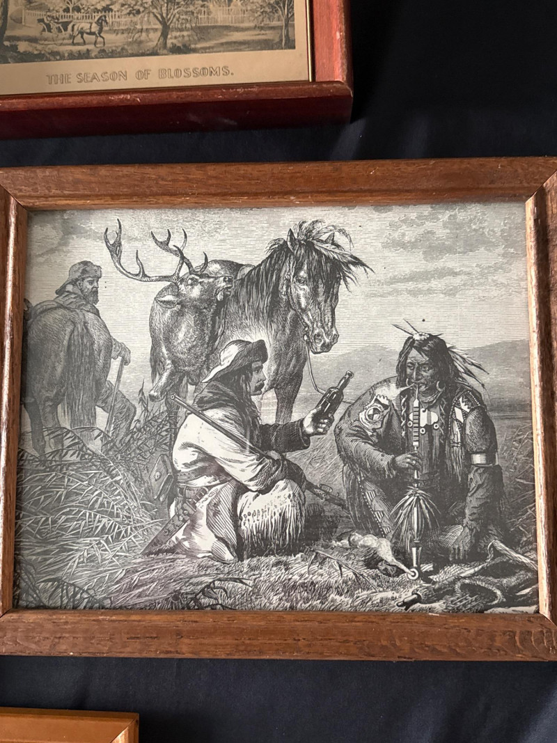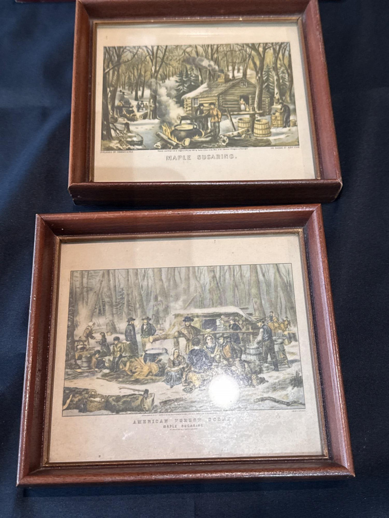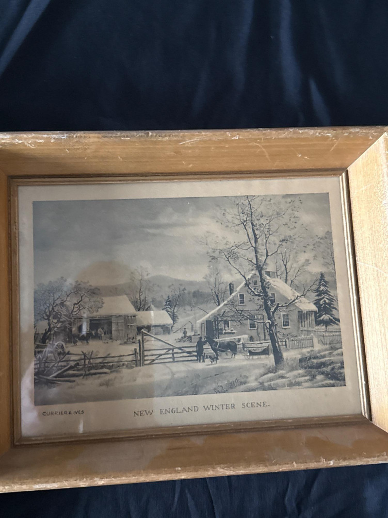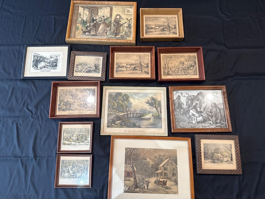 This lot features a collection of thirteen (13) vintage framed prints showcasing classic Americana, pastoral landscapes, seasonal scenes, and historical genre imagery. The artworks depict rural life, farmsteads, winter and spring scenes, early American industry, travel, and narrative moments rendered in traditional engraving or lithograph styles. Subjects visible across the collection include: New England and rural countryside scenes Winter farm life and seasonal activities Springtime and pastoral landscapes Early American labor and industry Historical and narrative illustrations The prints are presented in a variety of wood frames, some matching and others complementary, creating a cohesive yet visually interesting grouping. This collection works well for farmhouse décor, country homes, libraries, offices, or gallery wall displays, and offers flexibility for grouping together or displaying individually. Item Type: Framed print collection (group lot) Quantity: 13 framed prints Art Style: Americana / pastoral / genre Medium: Printed works (engraving or lithograph style) Frames: Mixed wood frames, under glass Orientation: Mostly horizontal Size Range: Largest: approx. 15" W x 12" H Smallest: approx. 6.5" W x 5.5" H Color Palette: Sepia, grayscale, and muted earth tonesDetails: