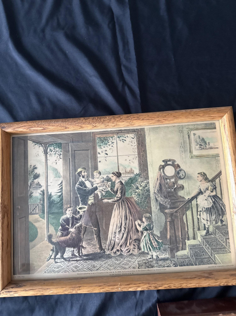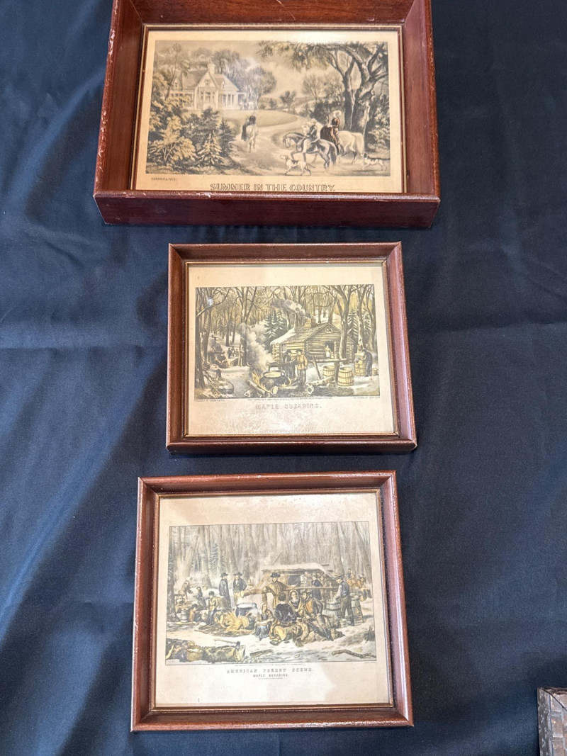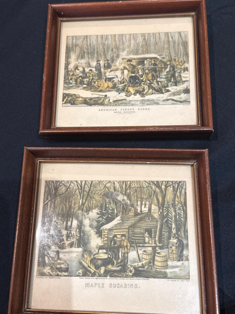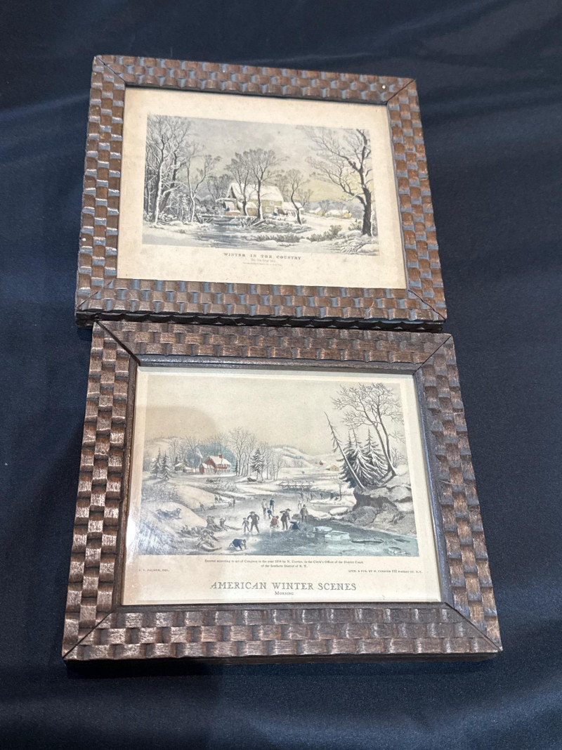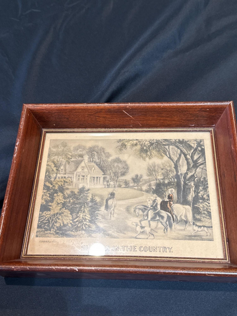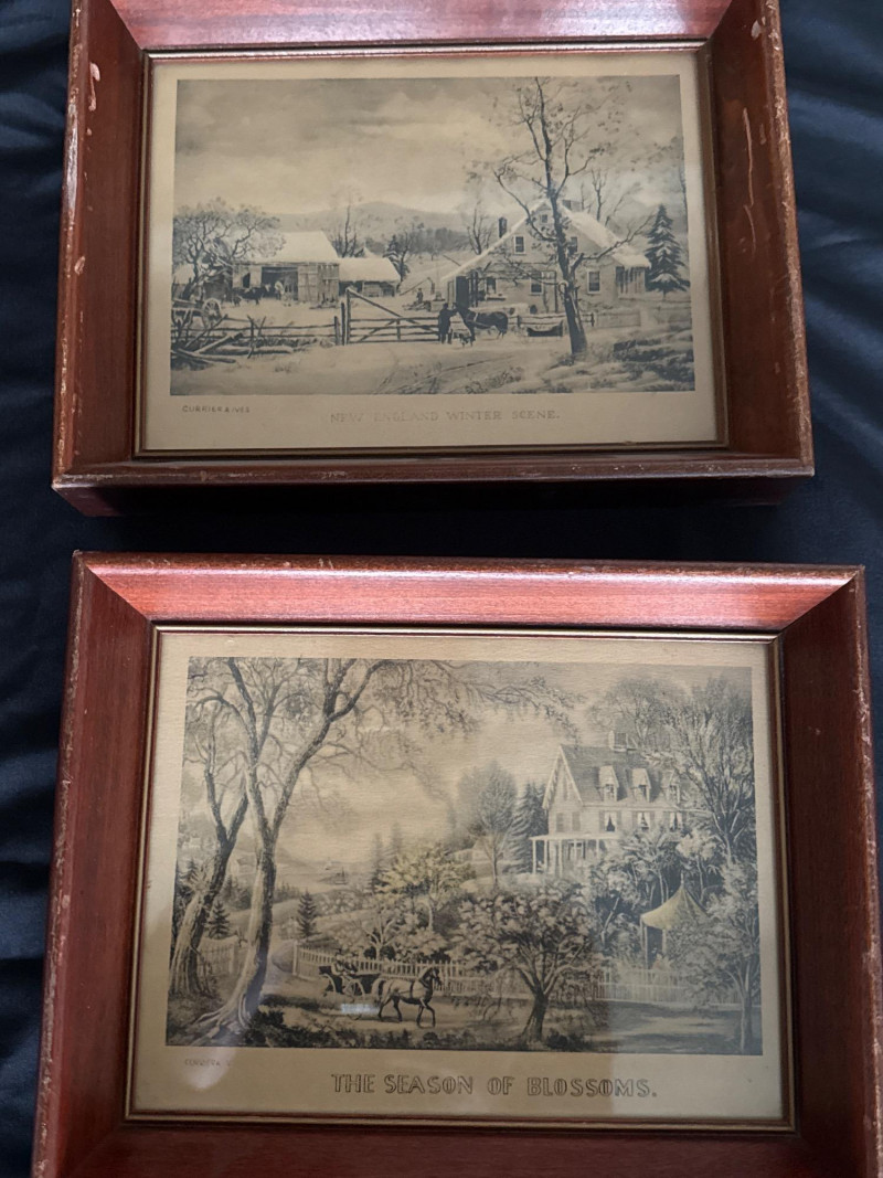 This lot features a collection of thirteen (13) vintage framed prints showcasing classic Americana, pastoral landscapes, seasonal scenes, and historical genre imagery. The artworks depict rural life, farmsteads, winter and spring scenes, early American industry, travel, and narrative moments rendered in traditional engraving or lithograph styles. Subjects visible across the collection include: New England and rural countryside scenes Winter farm life and seasonal activities Springtime and pastoral landscapes Early American labor and industry Historical and narrative illustrations The prints are presented in a variety of wood frames, some matching and others complementary, creating a cohesive yet visually interesting grouping. This collection works well for farmhouse décor, country homes, libraries, offices, or gallery wall displays, and offers flexibility for grouping together or displaying individually. Item Type: Framed print collection (group lot) Quantity: 13 framed prints Art Style: Americana / pastoral / genre Medium: Printed works (engraving or lithograph style) Frames: Mixed wood frames, under glass Orientation: Mostly horizontal Size Range: Largest: approx. 15" W x 12" H Smallest: approx. 6.5" W x 5.5" H Color Palette: Sepia, grayscale, and muted earth tonesDetails: