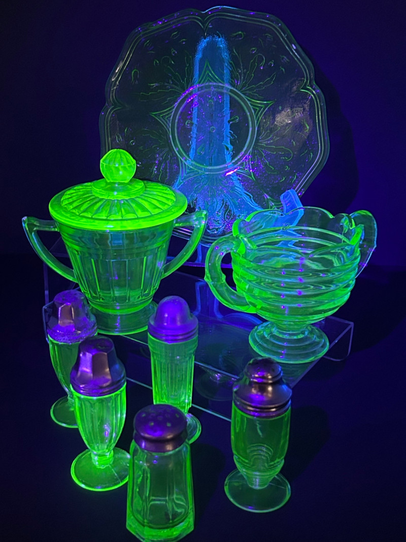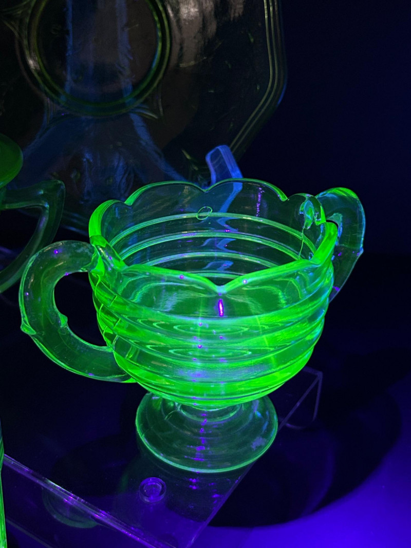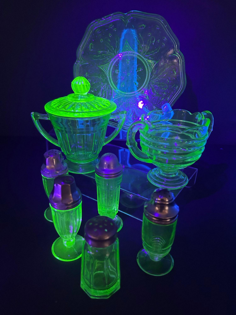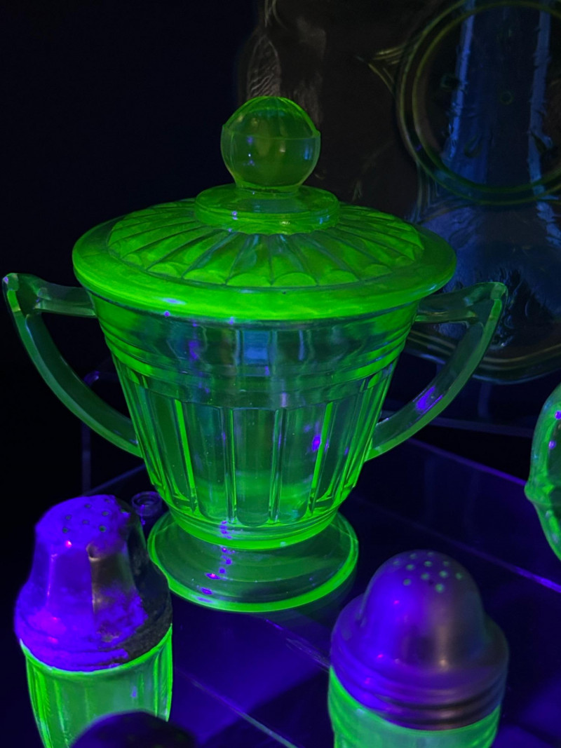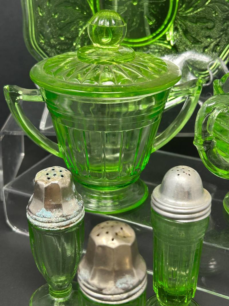 Striking vintage uranium glass collection featuring a beautifully coordinated group of tableware and condiment pieces. This set showcases classic molded designs with ribbed, paneled, and scalloped forms that glow vividly under UV light, highlighting the distinctive neon green color prized by collectors. The collection includes handled sugar containers, a lidded sugar bowl, matching salt and pepper shakers, and a decorative plate. Together, these pieces create an eye-catching display or functional vintage table setting, perfect for uranium glass collectors, Art Deco enthusiasts, or display cabinet décor. Material: Uranium glass (glows under UV/blacklight) Color: Bright translucent green Included pieces: Handled sugar containers – approx. 5" across Lidded sugar bowl – approx. 6" tall Plate – approx. 8" across Salt & pepper shakers – approx. 3"–4" tall Design features: Ribbed bodies, scalloped edges, paneled sides, metal shaker tops Era: Vintage (exact maker and pattern unmarked)Details: