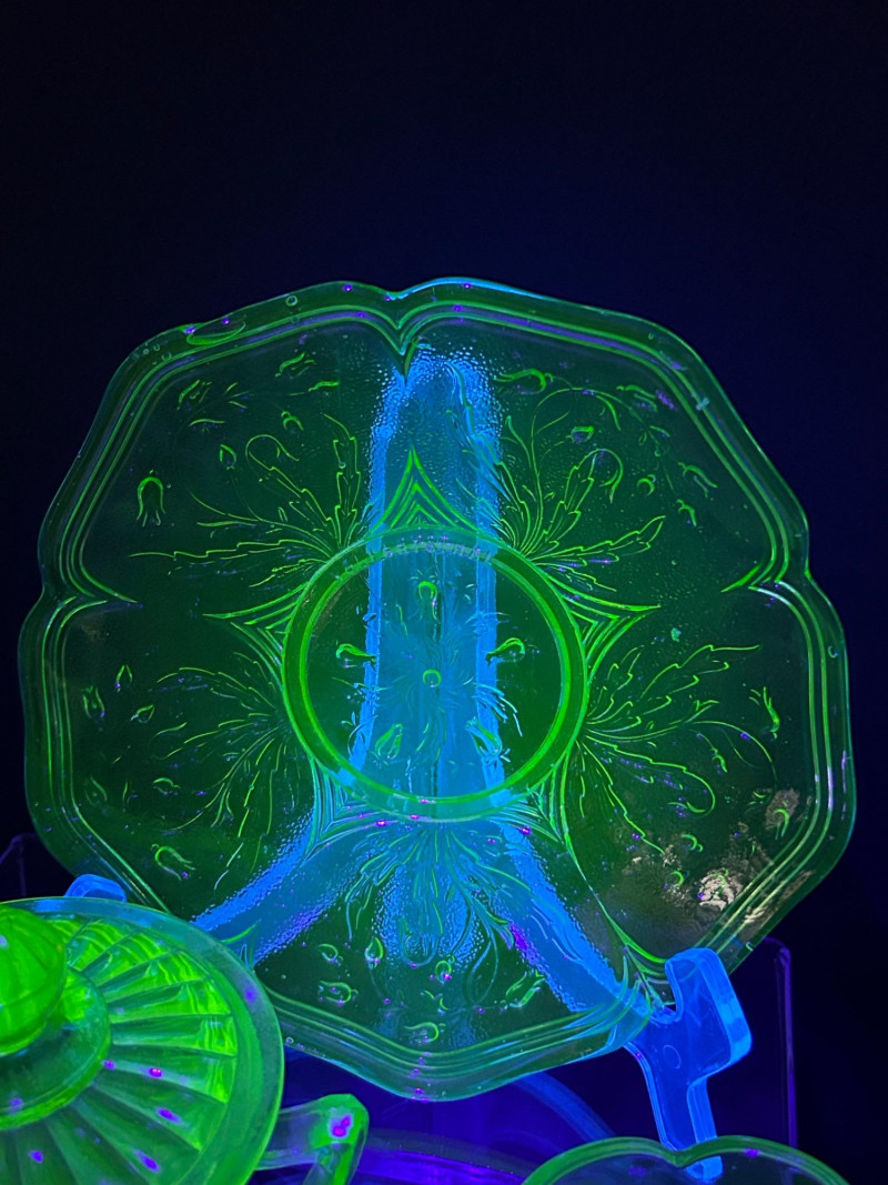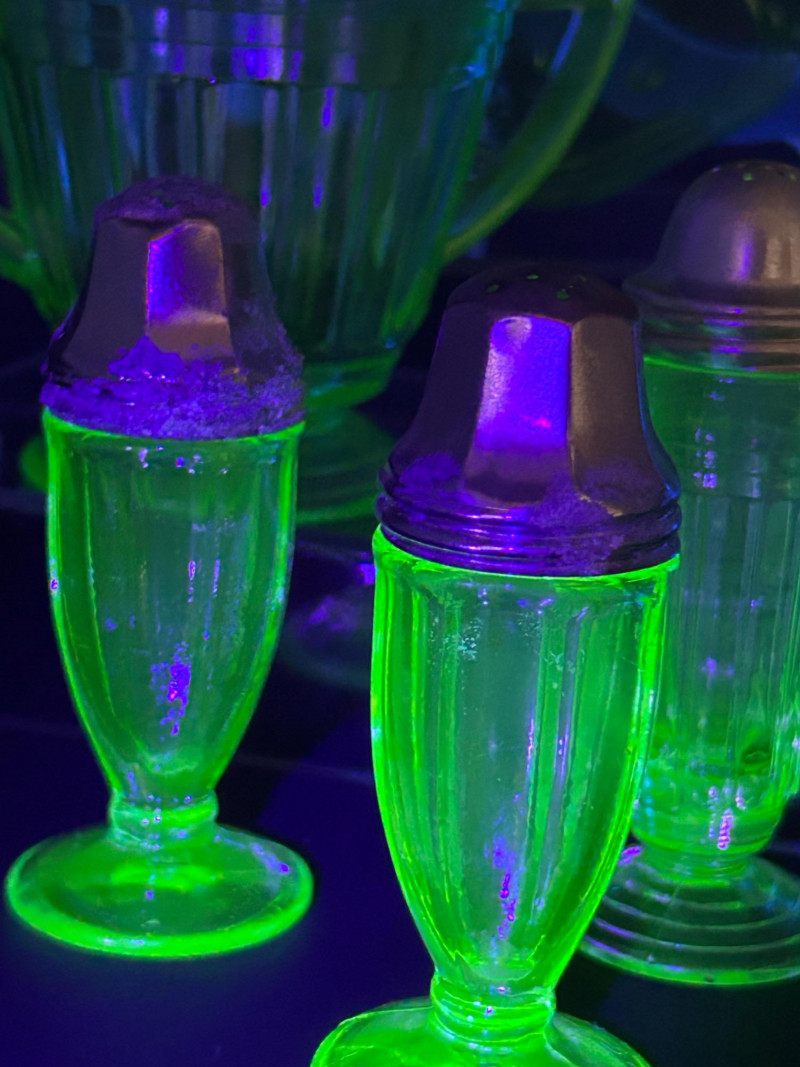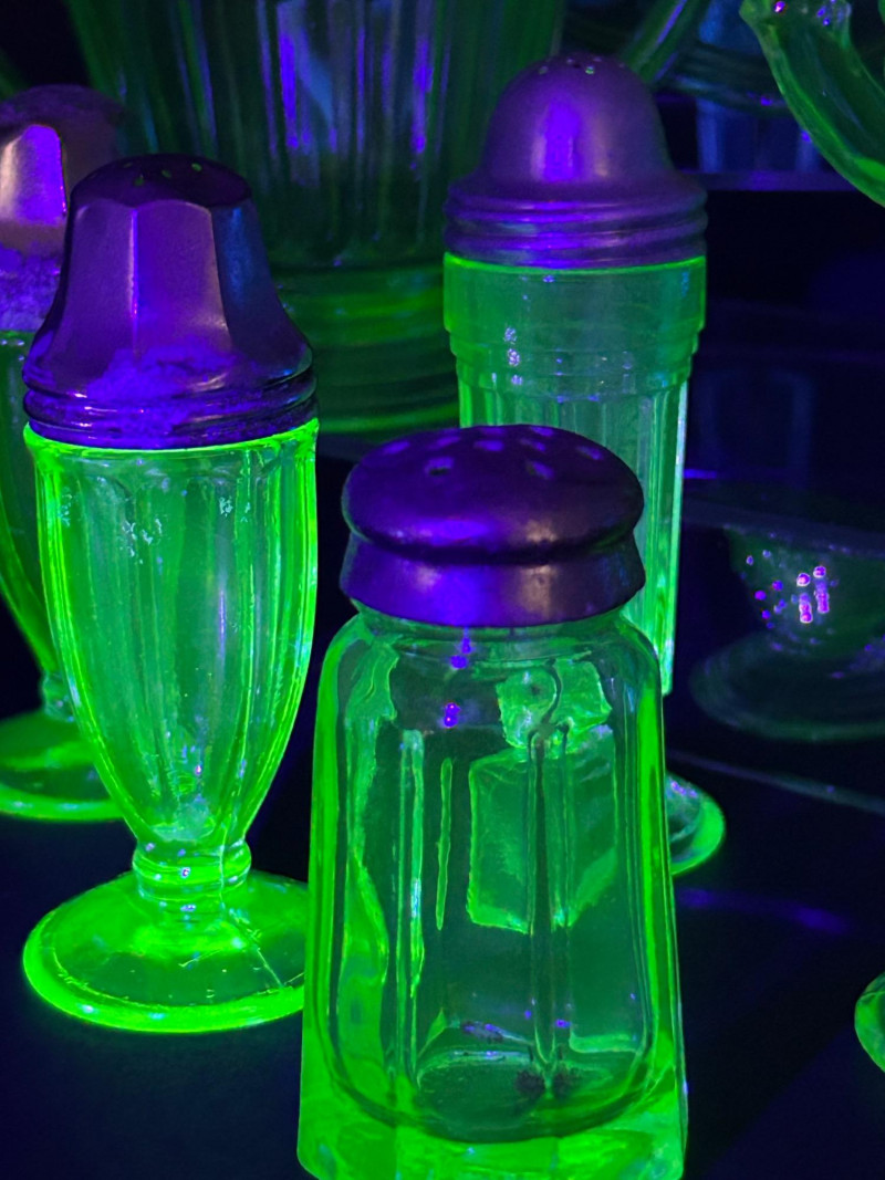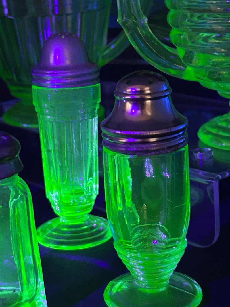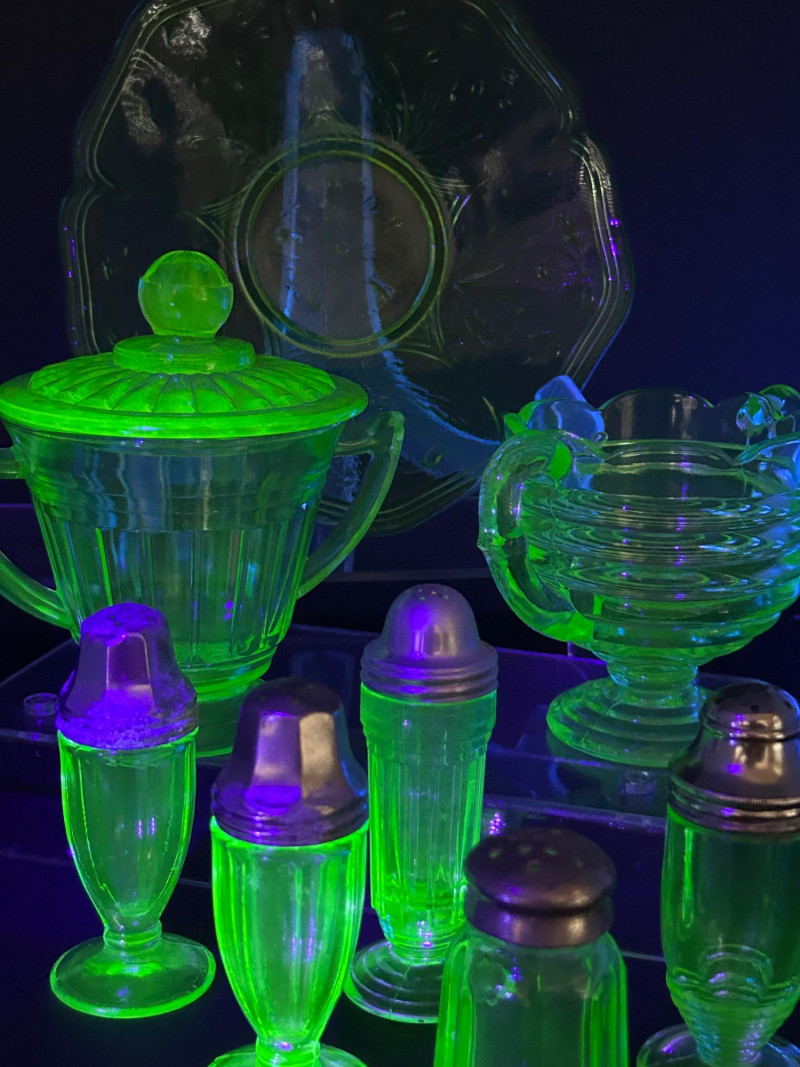 Striking vintage uranium glass collection featuring a beautifully coordinated group of tableware and condiment pieces. This set showcases classic molded designs with ribbed, paneled, and scalloped forms that glow vividly under UV light, highlighting the distinctive neon green color prized by collectors. The collection includes handled sugar containers, a lidded sugar bowl, matching salt and pepper shakers, and a decorative plate. Together, these pieces create an eye-catching display or functional vintage table setting, perfect for uranium glass collectors, Art Deco enthusiasts, or display cabinet décor. Material: Uranium glass (glows under UV/blacklight) Color: Bright translucent green Included pieces: Handled sugar containers – approx. 5" across Lidded sugar bowl – approx. 6" tall Plate – approx. 8" across Salt & pepper shakers – approx. 3"–4" tall Design features: Ribbed bodies, scalloped edges, paneled sides, metal shaker tops Era: Vintage (exact maker and pattern unmarked)Details: