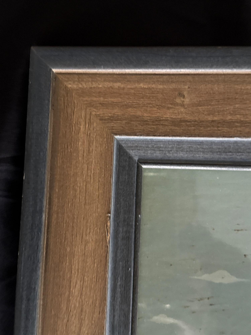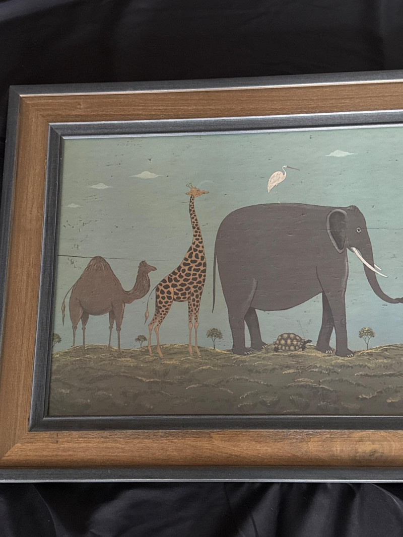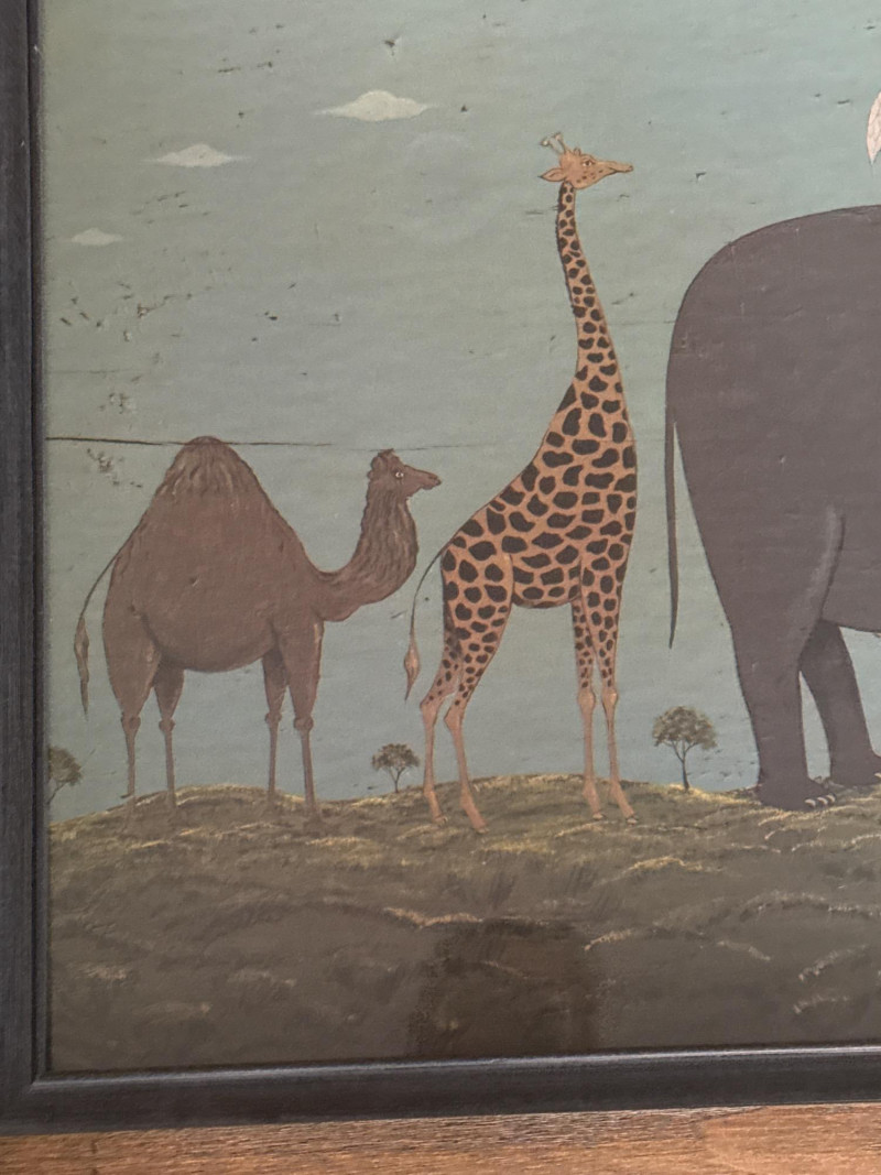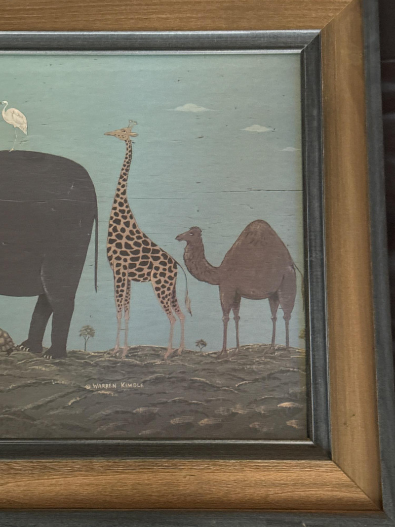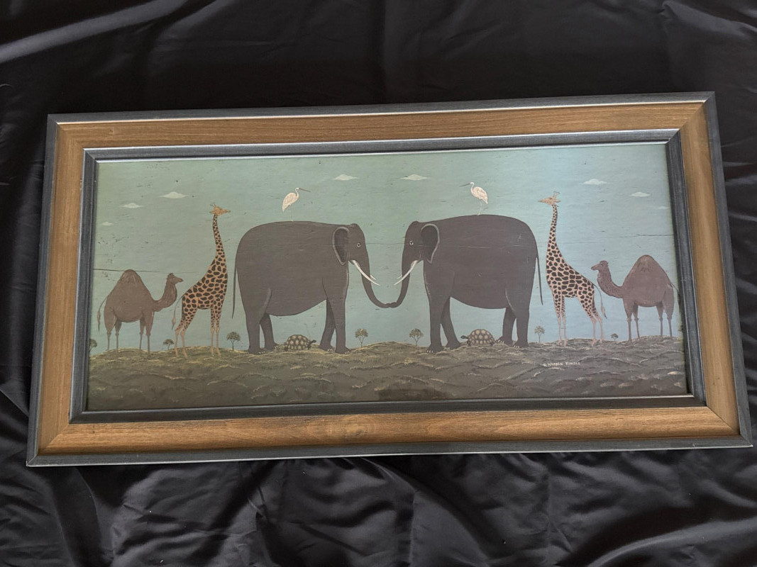 Whimsical folk art print titled “Noah’s Ark” by celebrated American folk artist Warren Kimble. The composition features paired animals—including elephants, giraffes, camels, tortoises, and birds—arranged symmetrically across a stylized landscape, a hallmark of Kimble’s charming and instantly recognizable style. Soft, muted tones and simplified forms give the piece a warm, nostalgic presence ideal for both traditional and eclectic interiors. Professionally framed by Windsor Art, this wide-format print is an eye-catching decorative work well suited for living spaces, hallways, nurseries, or collectors of American folk art. Details: Artist: Warren Kimble Title: Noah’s Ark Medium: Decorative print / printmaking Publisher / Framer: Windsor Art Products Incorporated Origin: Made in USA Frame: Original Windsor Art wood frame with layered molding Hanging: Factory-installed hangers (per back label) Measurements Overall Size: approx. 39.5" W x 20.5" T