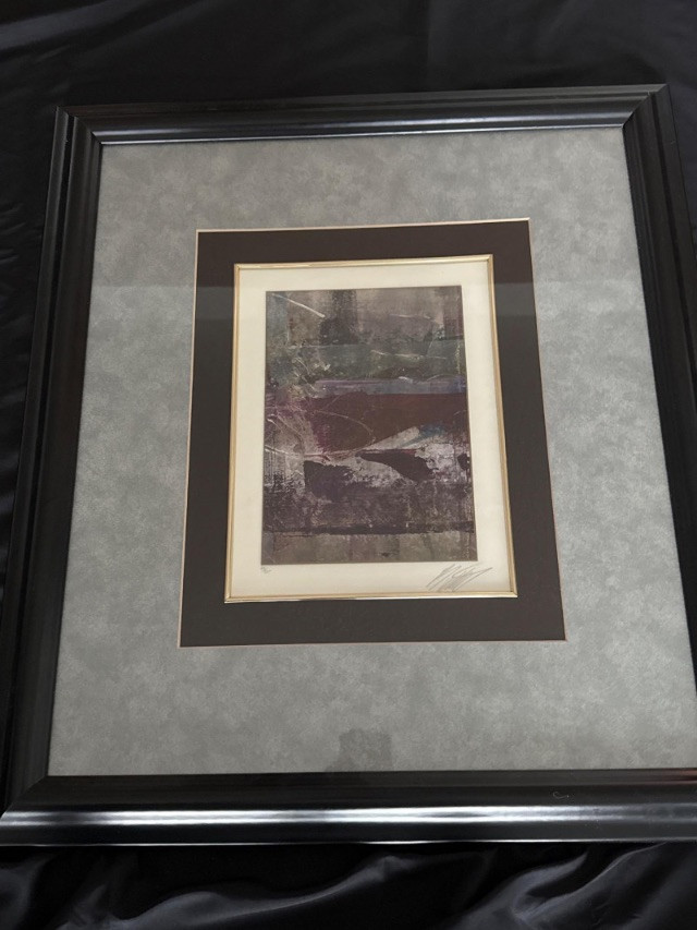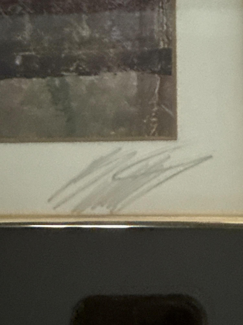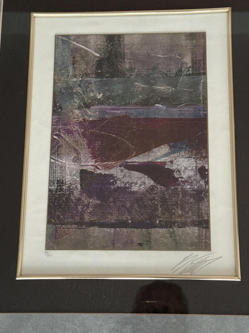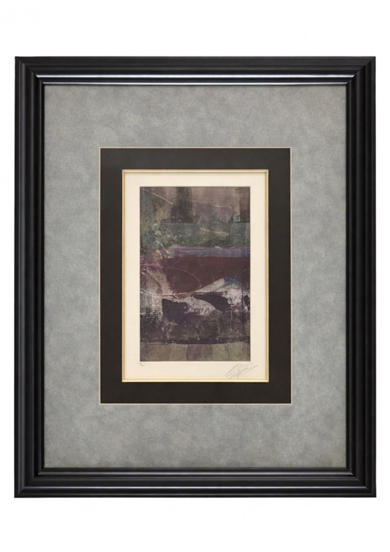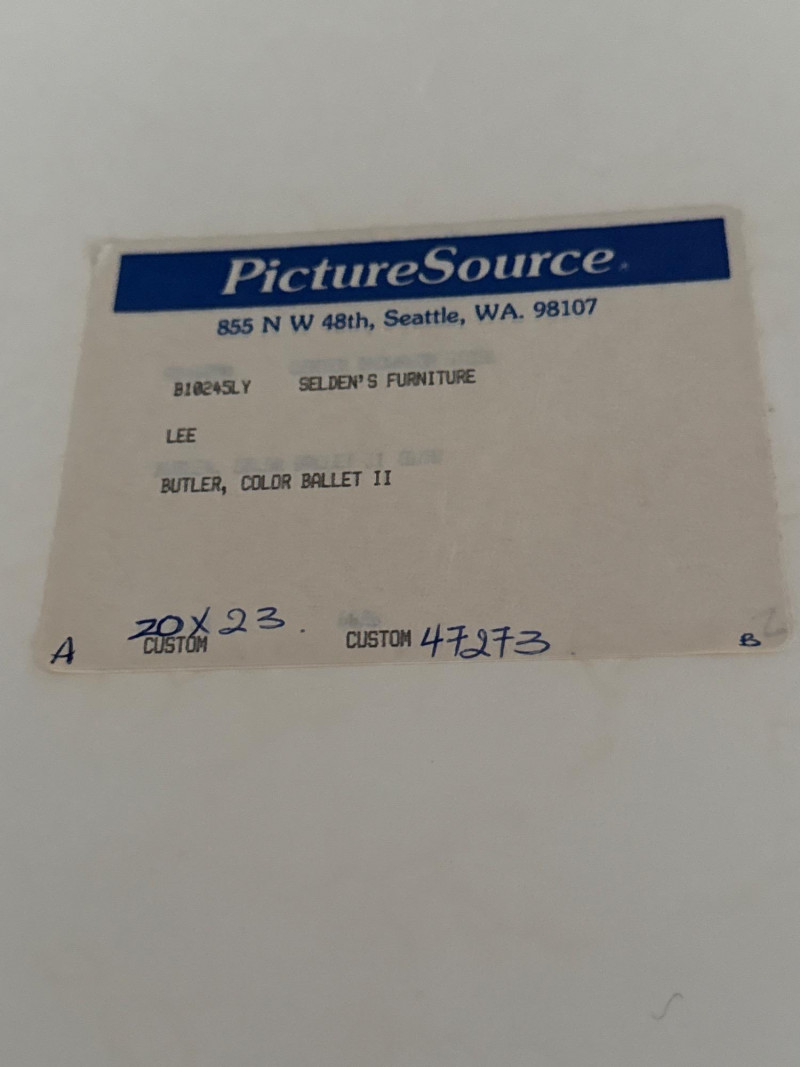 Expressive abstract print titled “Color Ballet II,” showcasing layered textures and fluid movement in muted tones of plum, charcoal, gray, and soft earth hues. The composition features sweeping gestures and textured surfaces that create a sense of depth and motion, giving the piece a modern, contemplative presence. The artwork is professionally custom framed by PictureSource (Seattle, WA) for Selden’s Furniture, featuring an elegant double-mat presentation with a gold-tone inner liner and a substantial black outer frame. A refined decorative artwork well suited for contemporary, transitional, or professional interior settings. The print appears signed at the lower right and numbered at the lower left, indicating a limited edition (exact numbering not fully legible). Title: Color Ballet II Artist: Attributed to Lee Butler (per framing label) Medium: Print Framing: Custom framed by PictureSource, Seattle, WA Matting: Double mat with gold-tone inner trim Frame: Black frame with gold inner liner Edition: Signed and numbered (number unclear) Retail Source: Selden’s Furniture Visible artwork: approx. 20" W × 23" HDetails: