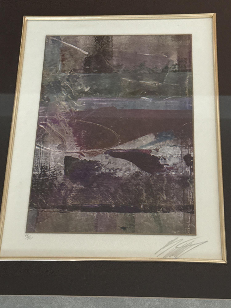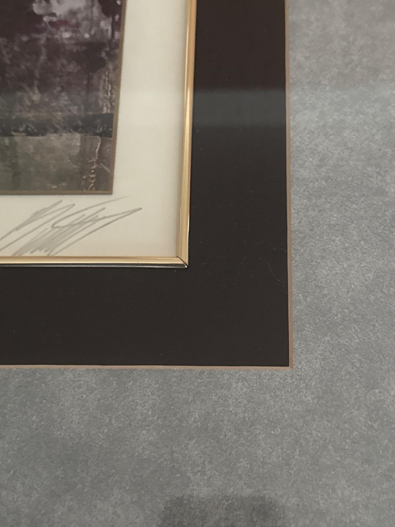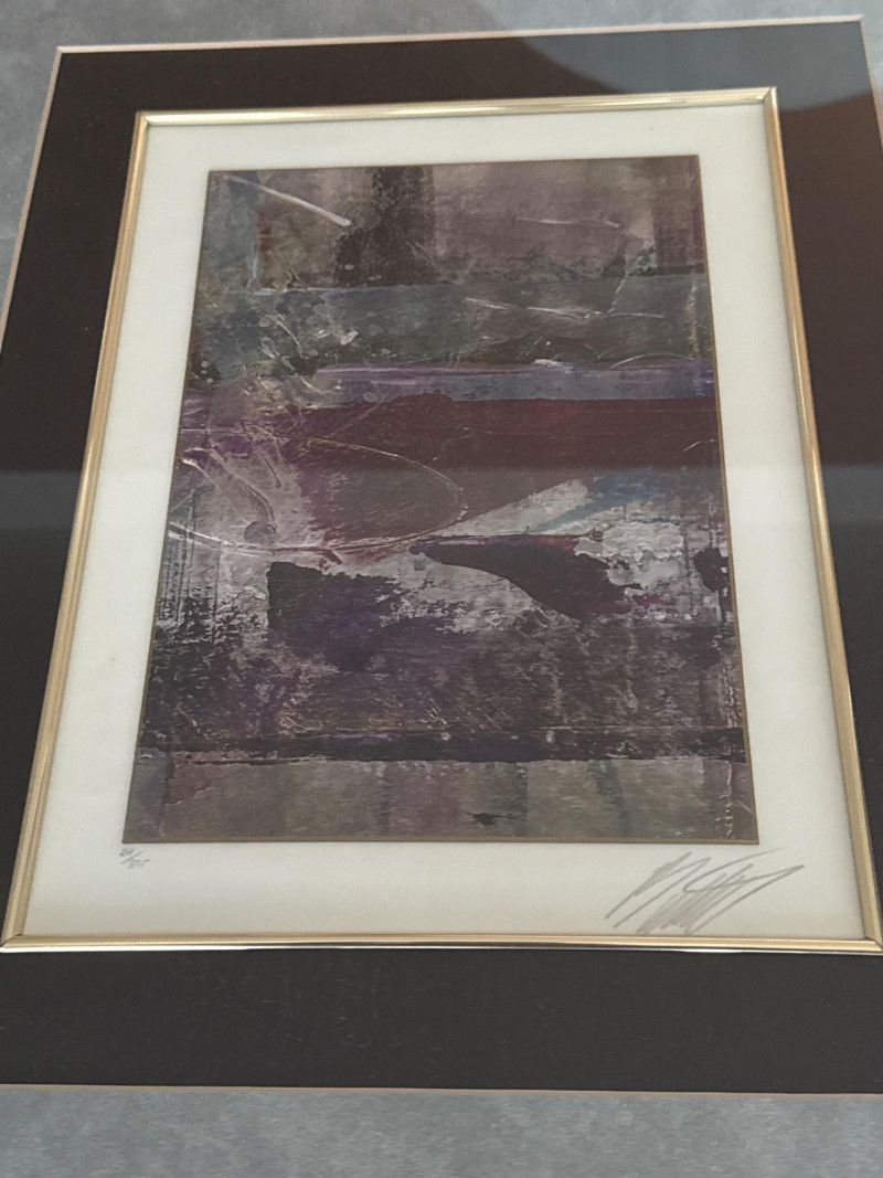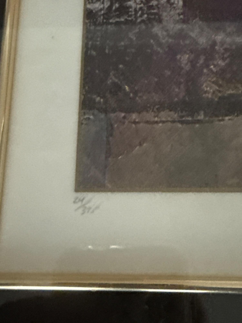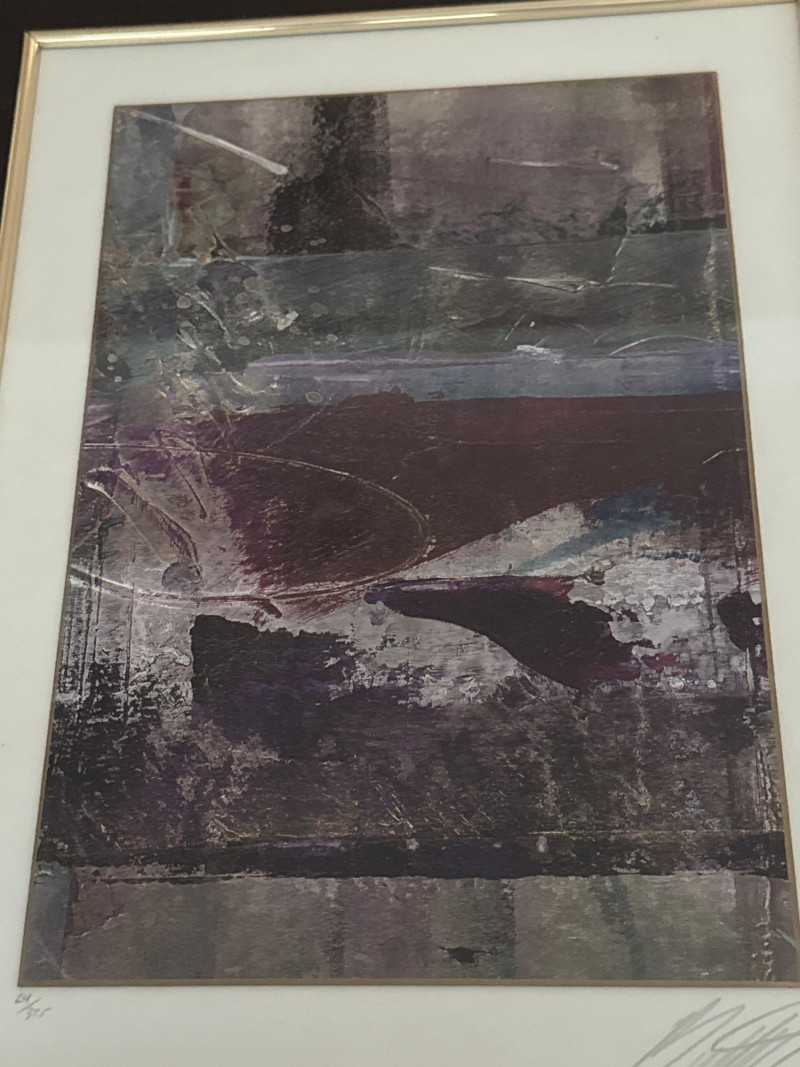 Expressive abstract print titled “Color Ballet II,” showcasing layered textures and fluid movement in muted tones of plum, charcoal, gray, and soft earth hues. The composition features sweeping gestures and textured surfaces that create a sense of depth and motion, giving the piece a modern, contemplative presence. The artwork is professionally custom framed by PictureSource (Seattle, WA) for Selden’s Furniture, featuring an elegant double-mat presentation with a gold-tone inner liner and a substantial black outer frame. A refined decorative artwork well suited for contemporary, transitional, or professional interior settings. The print appears signed at the lower right and numbered at the lower left, indicating a limited edition (exact numbering not fully legible). Title: Color Ballet II Artist: Attributed to Lee Butler (per framing label) Medium: Print Framing: Custom framed by PictureSource, Seattle, WA Matting: Double mat with gold-tone inner trim Frame: Black frame with gold inner liner Edition: Signed and numbered (number unclear) Retail Source: Selden’s Furniture Visible artwork: approx. 20" W × 23" HDetails: