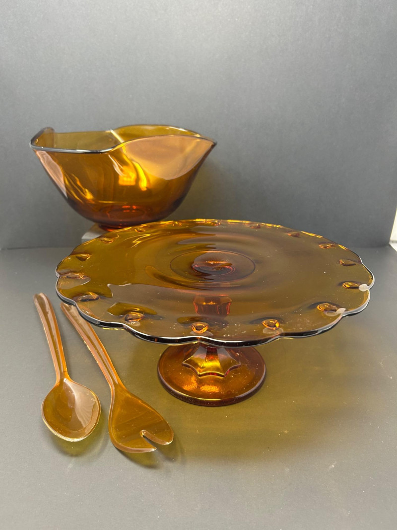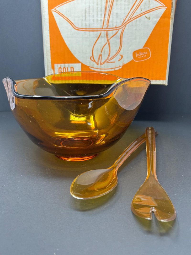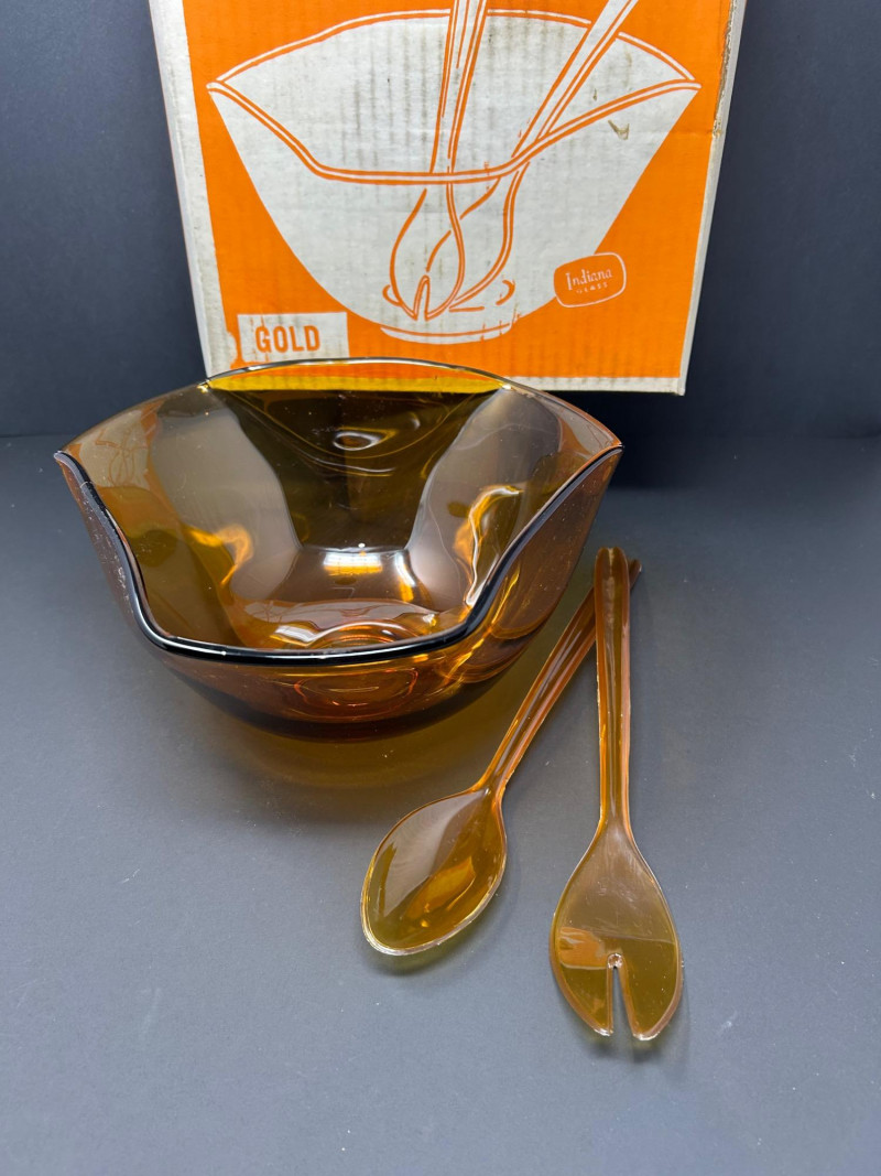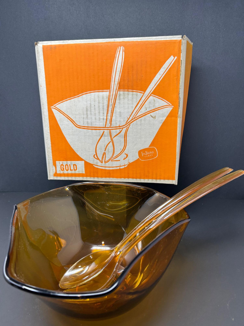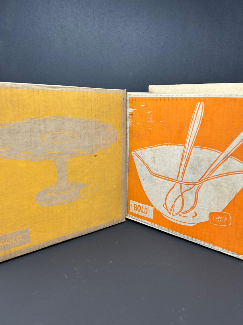 Beautiful vintage Indiana Glass Company serving set in the rich Gold Amber colorway. This matched set includes a sculptural Tri-Top (folded) salad bowl with coordinating amber plastic servers and a scalloped pedestal cake stand with applied teardrop accents. Both pieces come with their original Indiana Glass boxes, which clearly display the Indiana Glass logo—confirming the maker. A striking mid-century modern set that displays beautifully and serves just as well. Maker: Indiana Glass Color: Gold Amber Era: Mid-Century (c. 1950s–1960s) Cake Stand / Pedestal Plate Height: 5” Diameter: 11” Scalloped rim with applied teardrop accents Tri-Top / Folded Salad Bowl Diameter: 9.5” Height: 5” Serving Utensils (2) Amber plastic servers Length: 11” Packaging Original Indiana Glass boxes included (both pieces)Item Details