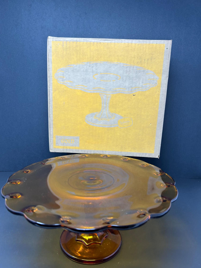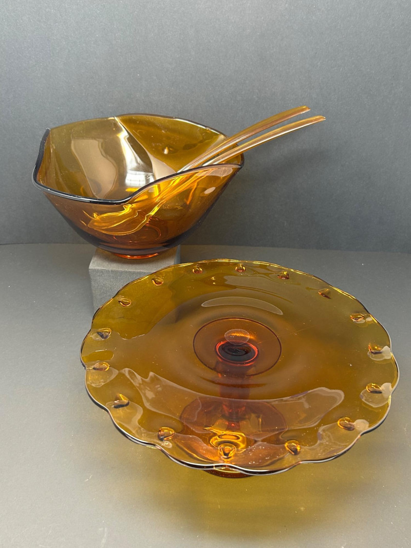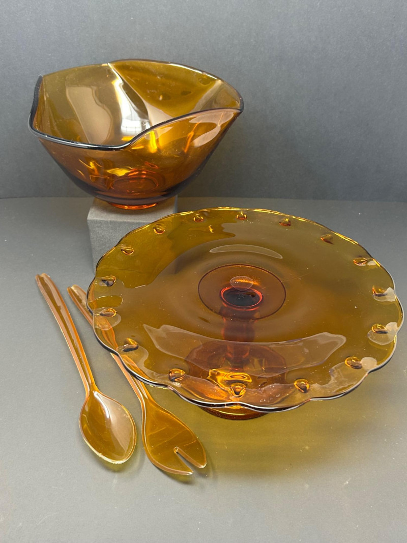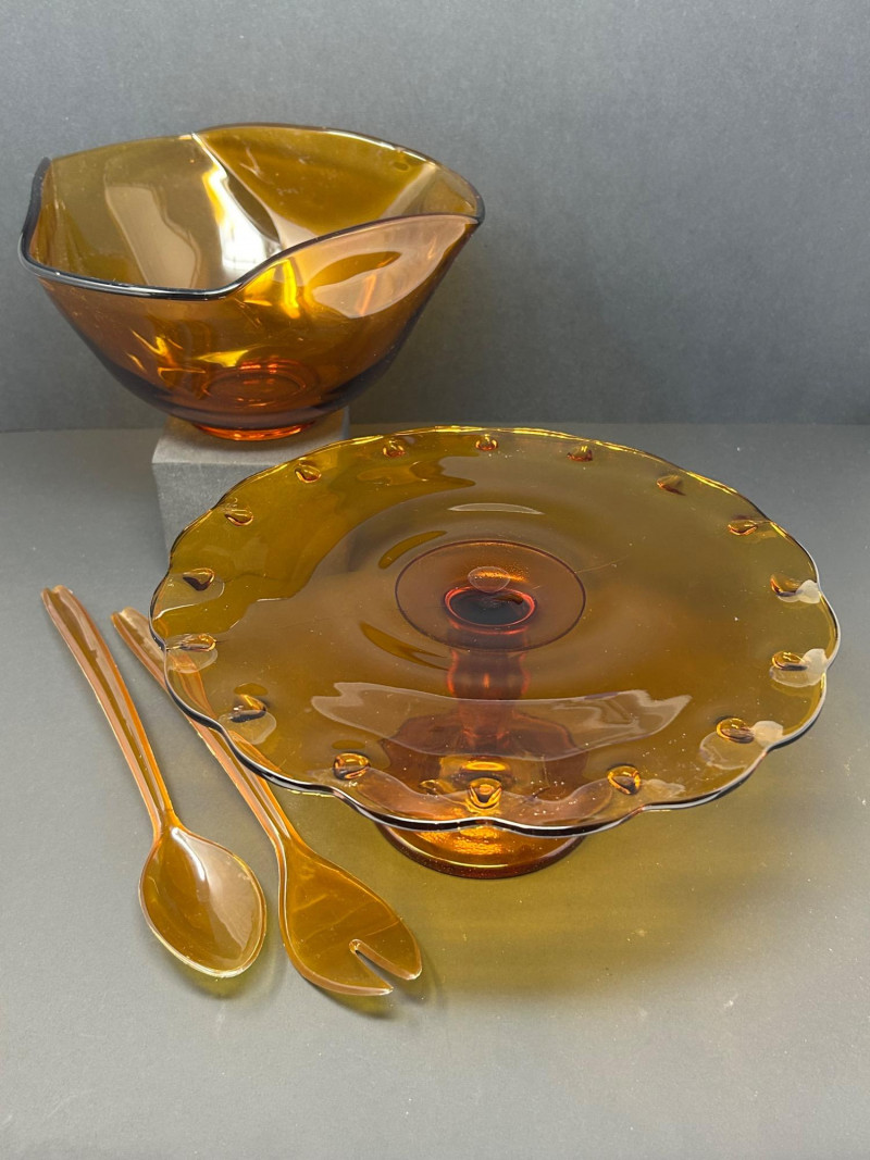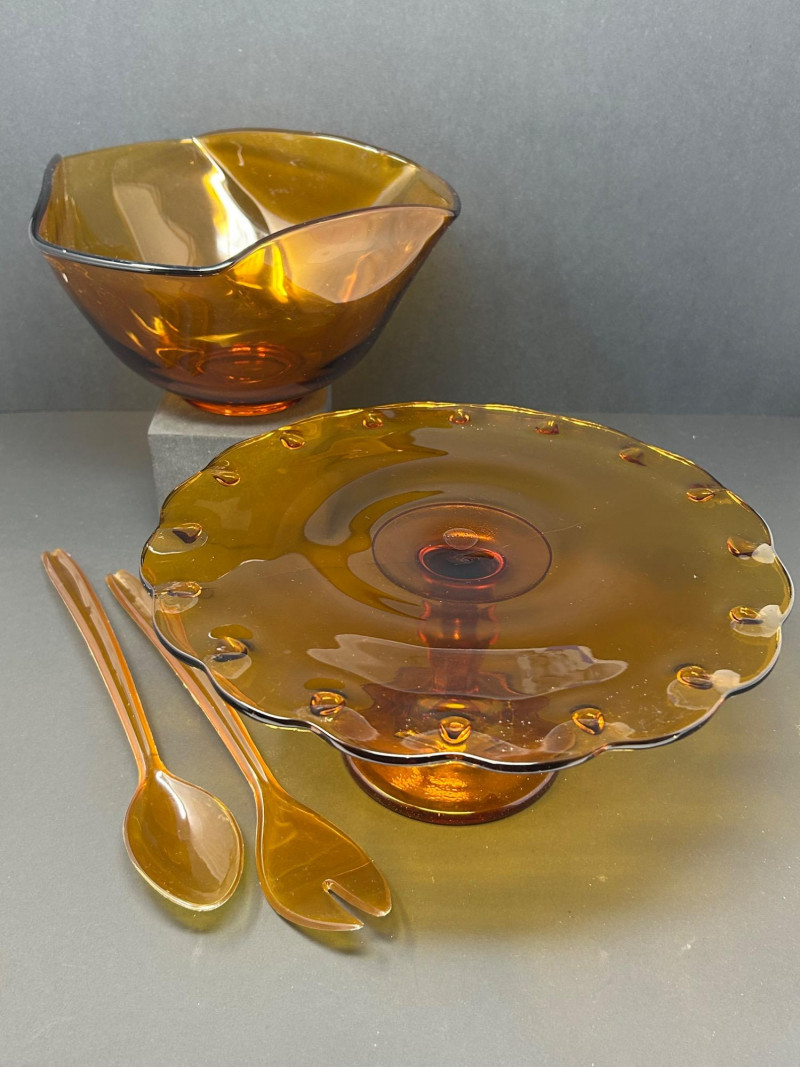 Beautiful vintage Indiana Glass Company serving set in the rich Gold Amber colorway. This matched set includes a sculptural Tri-Top (folded) salad bowl with coordinating amber plastic servers and a scalloped pedestal cake stand with applied teardrop accents. Both pieces come with their original Indiana Glass boxes, which clearly display the Indiana Glass logo—confirming the maker. A striking mid-century modern set that displays beautifully and serves just as well. Maker: Indiana Glass Color: Gold Amber Era: Mid-Century (c. 1950s–1960s) Cake Stand / Pedestal Plate Height: 5” Diameter: 11” Scalloped rim with applied teardrop accents Tri-Top / Folded Salad Bowl Diameter: 9.5” Height: 5” Serving Utensils (2) Amber plastic servers Length: 11” Packaging Original Indiana Glass boxes included (both pieces)Item Details