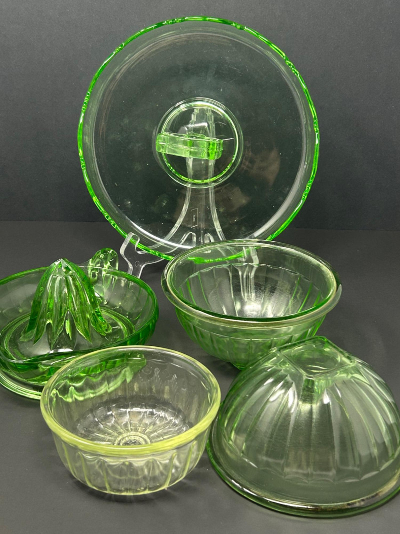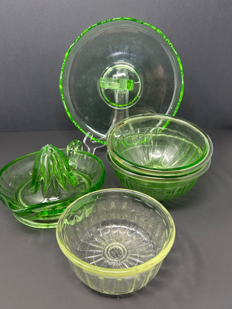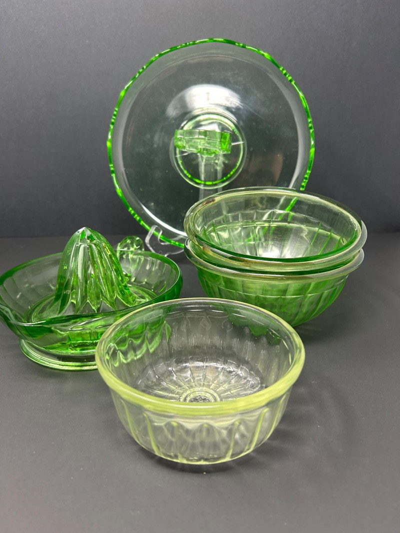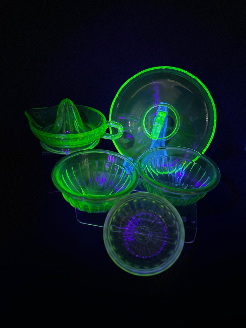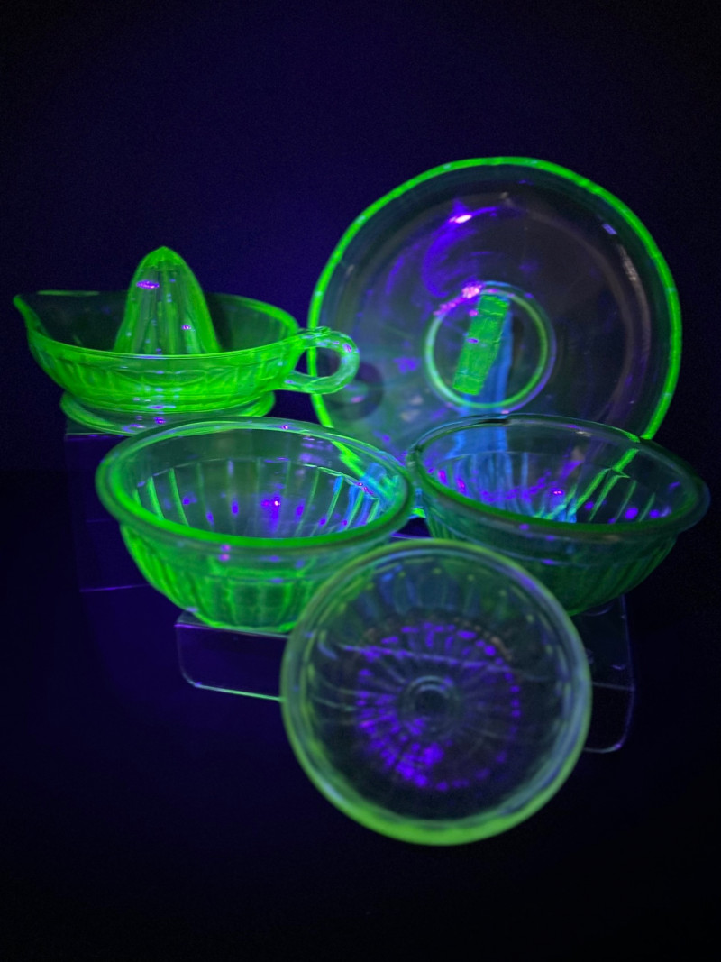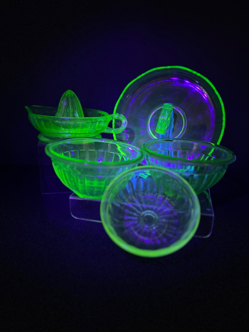 A striking vintage uranium glass lot featuring a handled serving tray, a citrus juicer (reamer), and multiple matching bowls. The pieces display classic ribbed and molded forms and glow brilliantly under UV/black light, showcasing the vivid green fluorescence collectors love. A versatile set ideal for display, serving, or adding standout color to a vintage glass collection. Details: Material: Uranium glass (glows under UV light) Set Includes: Handled serving tray Citrus juicer / reamer Assorted matching bowls Measurements (approx.): Handled Tray: 9" across x 3" tall Juicer / Reamer: 8" across x 4.5" tall Bowls: 4"–5" across Color: Translucent green Era: Vintage (mid-20th century style)