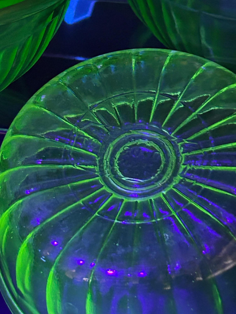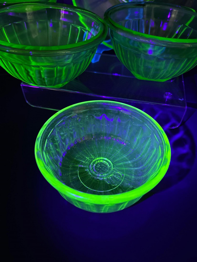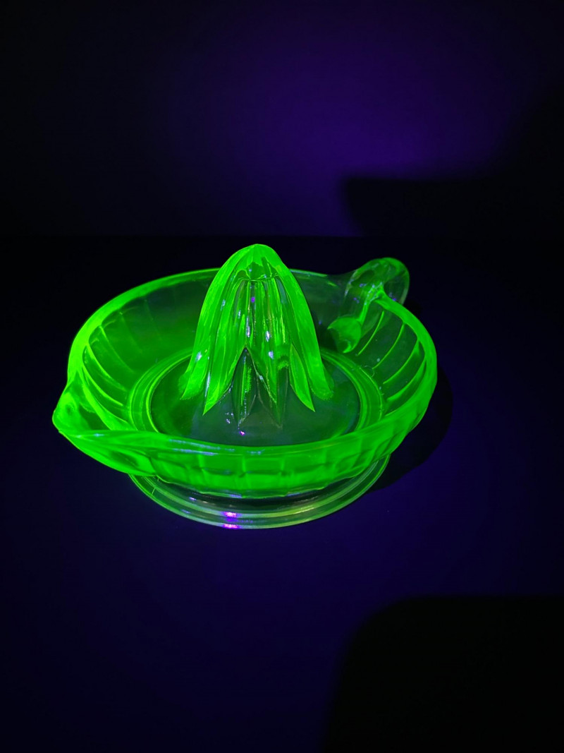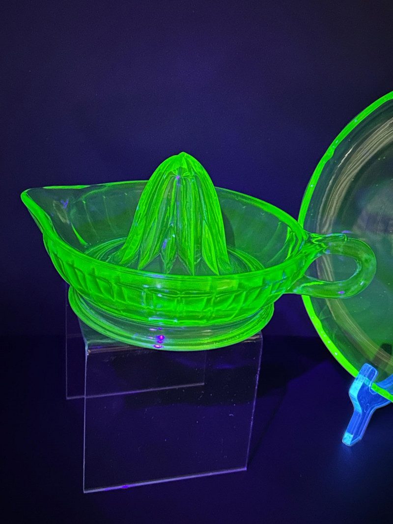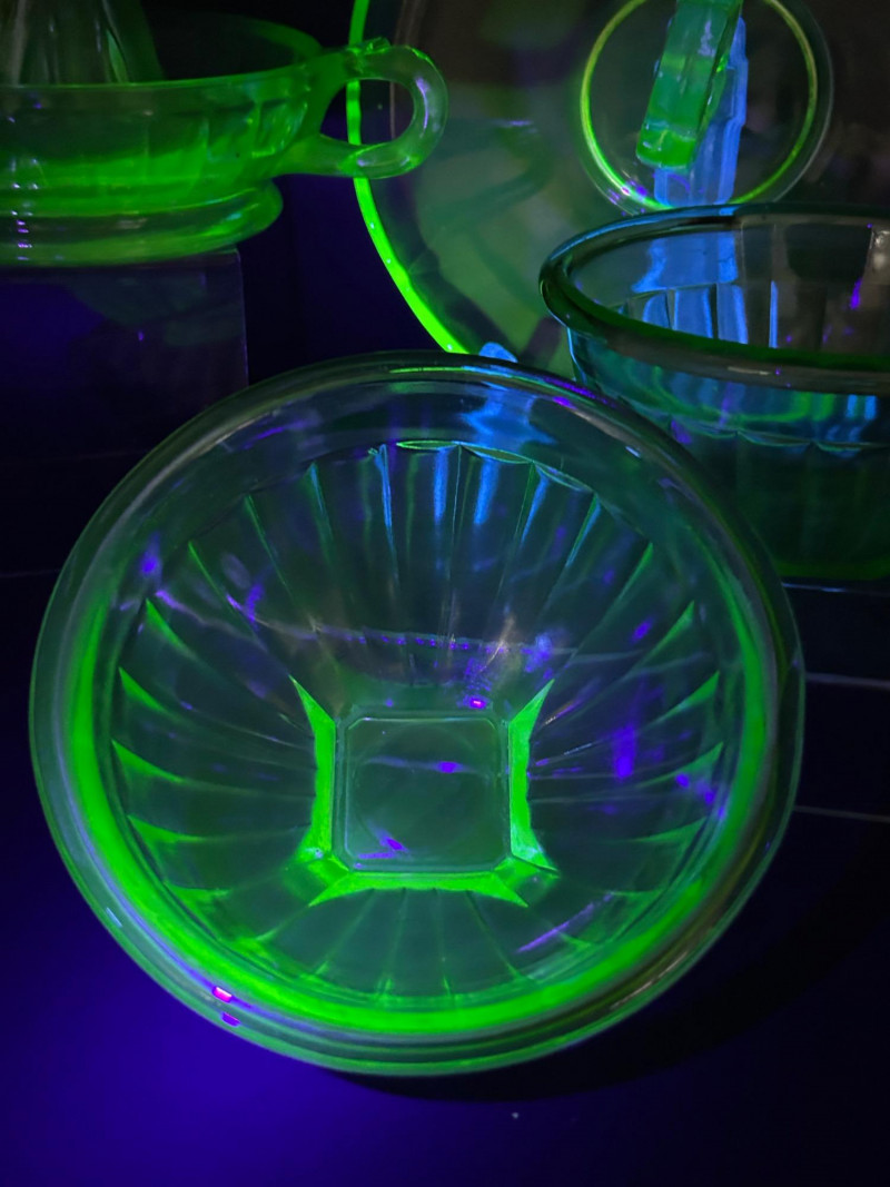A striking vintage uranium glass lot featuring a handled serving tray, a citrus juicer (reamer), and multiple matching bowls. The pieces display classic ribbed and molded forms and glow brilliantly under UV/black light, showcasing the vivid green fluorescence collectors love. A versatile set ideal for display, serving, or adding standout color to a vintage glass collection. Details: Material: Uranium glass (glows under UV light) Set Includes: Handled serving tray Citrus juicer / reamer Assorted matching bowls Measurements (approx.): Handled Tray: 9" across x 3" tall Juicer / Reamer: 8" across x 4.5" tall Bowls: 4"–5" across Color: Translucent green Era: Vintage (mid-20th century style)