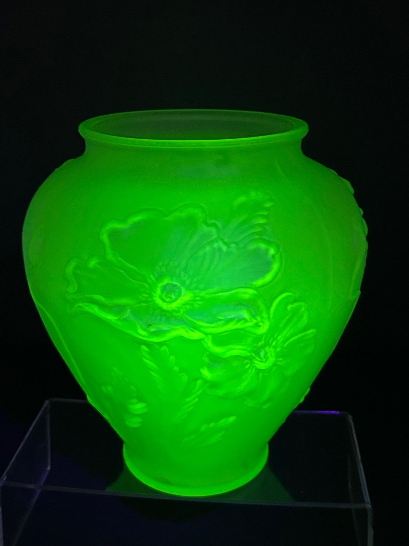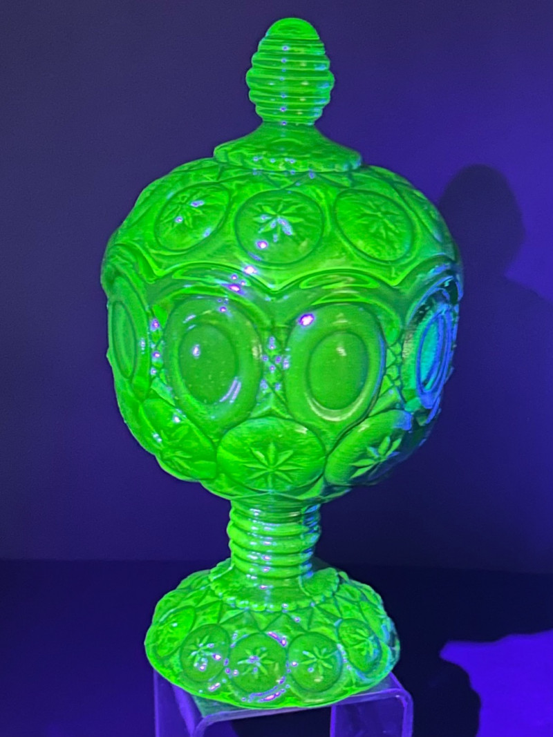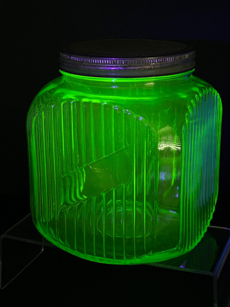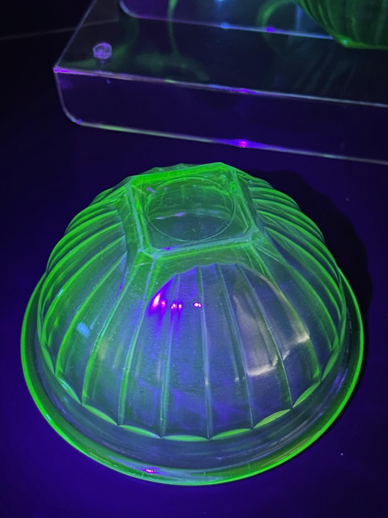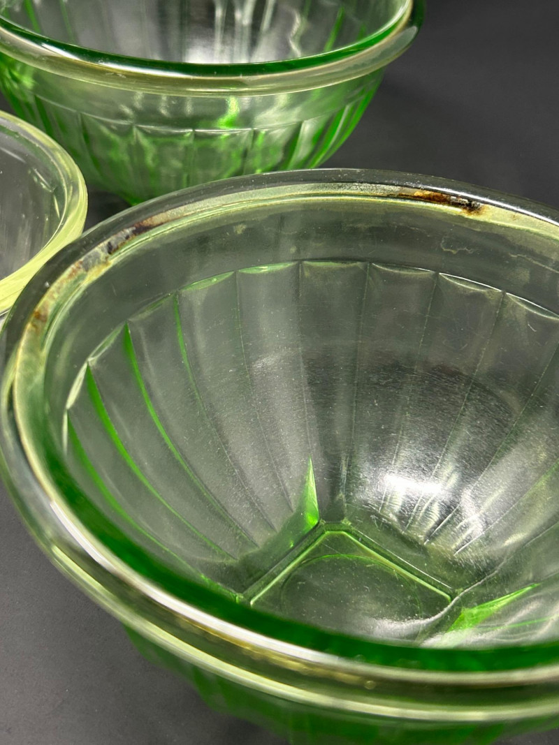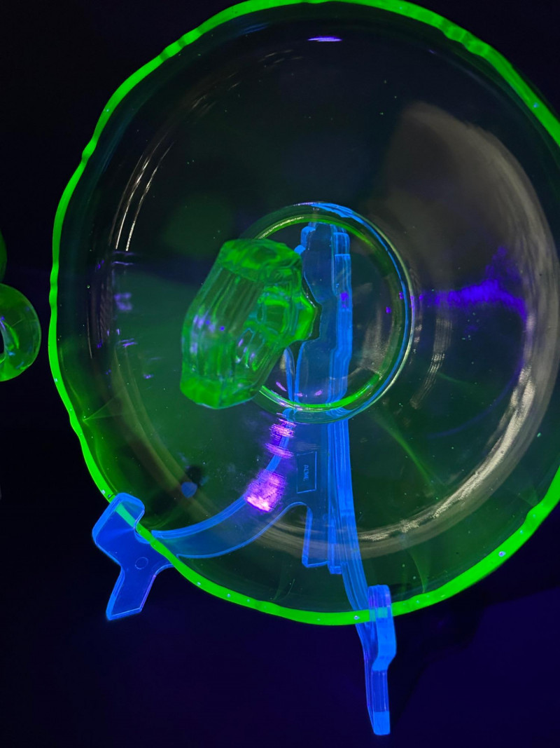 A striking vintage uranium glass lot featuring a handled serving tray, a citrus juicer (reamer), and multiple matching bowls. The pieces display classic ribbed and molded forms and glow brilliantly under UV/black light, showcasing the vivid green fluorescence collectors love. A versatile set ideal for display, serving, or adding standout color to a vintage glass collection. Details: Material: Uranium glass (glows under UV light) Set Includes: Handled serving tray Citrus juicer / reamer Assorted matching bowls Measurements (approx.): Handled Tray: 9" across x 3" tall Juicer / Reamer: 8" across x 4.5" tall Bowls: 4"–5" across Color: Translucent green Era: Vintage (mid-20th century style)