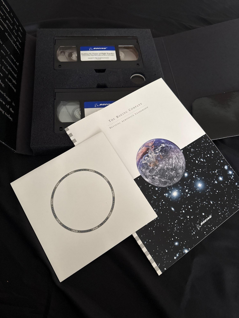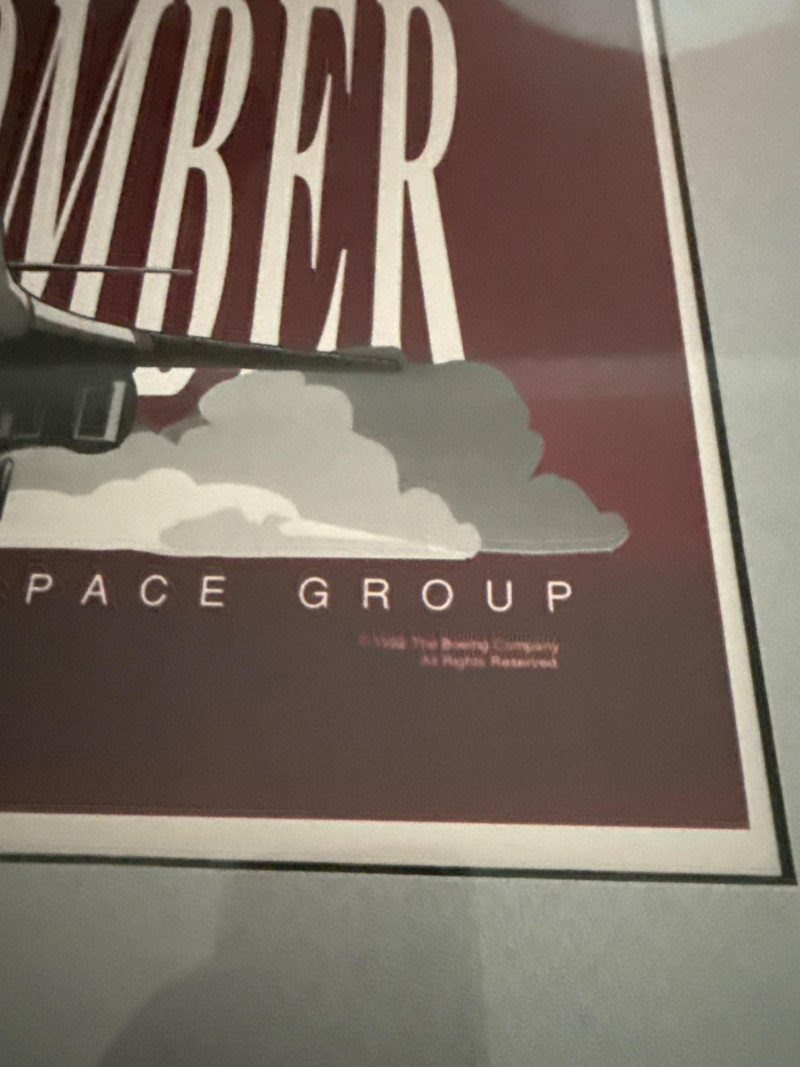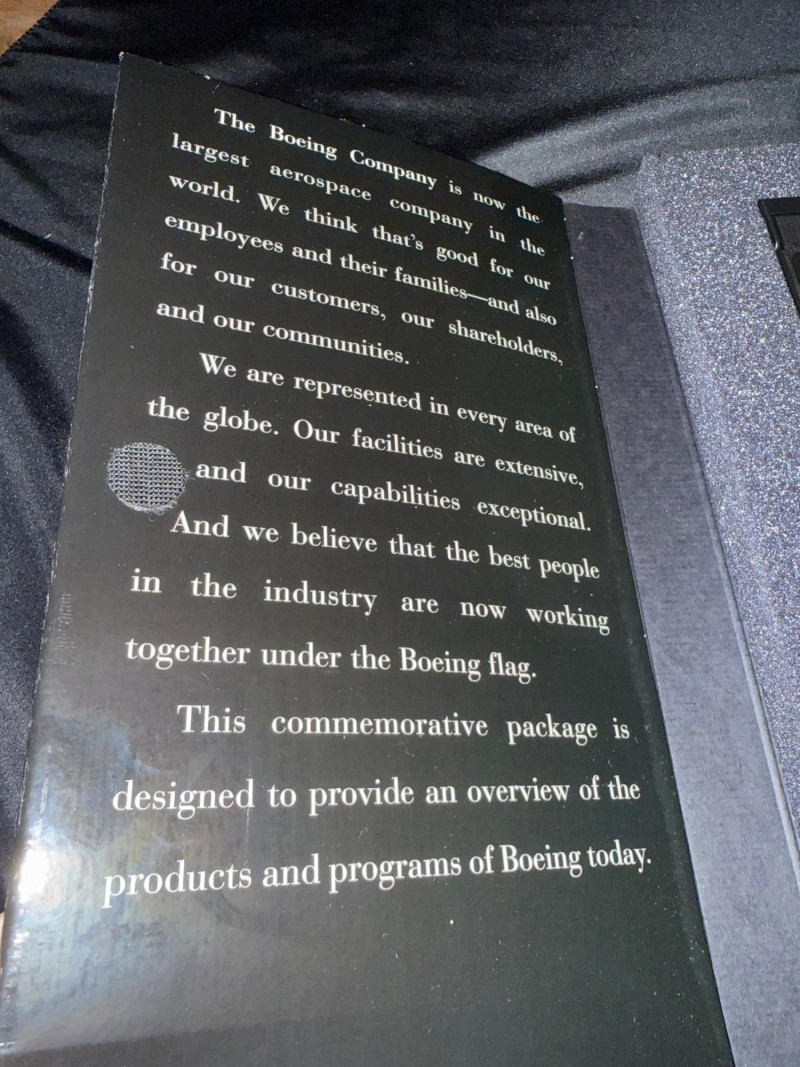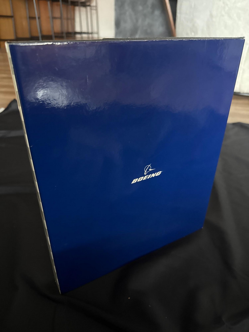 A striking aerospace collectible set from Boeing, featuring a dramatic B-1B Bomber art print paired with a corporate commemorative portfolio titled “Building the Future of Flight Together.” The presentation includes a blue Boeing-branded binder/portfolio with printed literature and media highlighting Boeing’s programs and capabilities. The B-1B print—identified on the original gift-store label as “B-1B Ascending Matte”—displays a bold, graphic front-view of the aircraft with Boeing Defense & Space Group branding, making this an ideal piece for aviation, military history, or corporate memorabilia collectors. Details: Maker: Boeing Aircraft Featured: B-1B Lancer Bomber Print Title (per label): B-1B Ascending Matte Format: Matted art print (loose, not framed) Portfolio: Blue Boeing corporate binder with printed materials and media (as shown) Branding/Text: Boeing Defense & Space Group; Building the Future of Flight Together Original Retail Label: D.C. Gift Store (price tag visible) Era: Late 20th century / corporate commemorative period