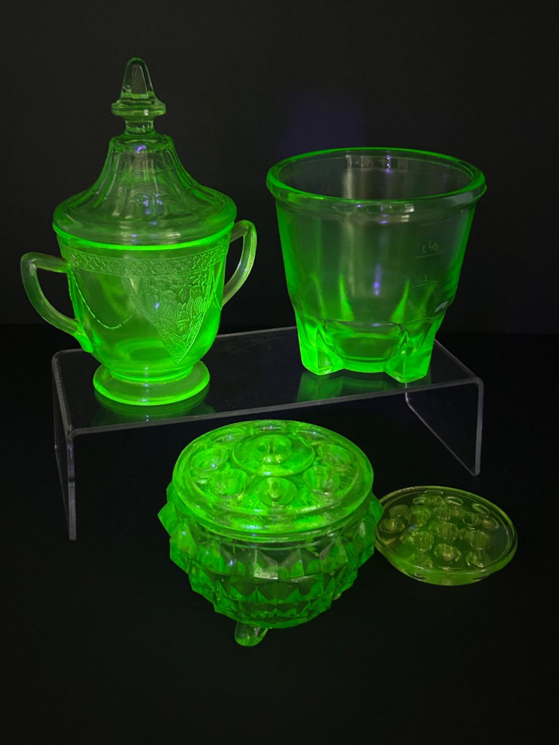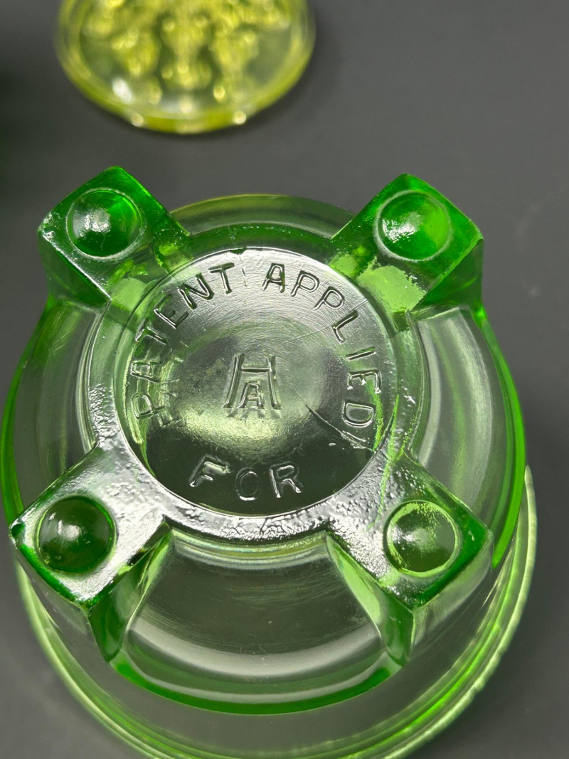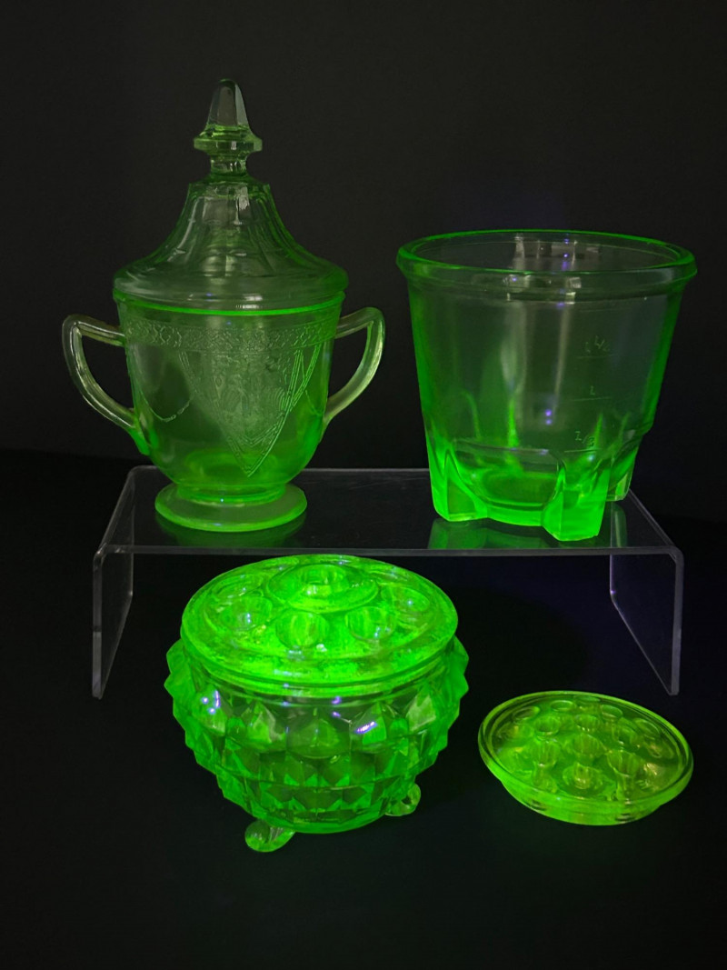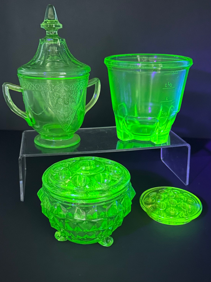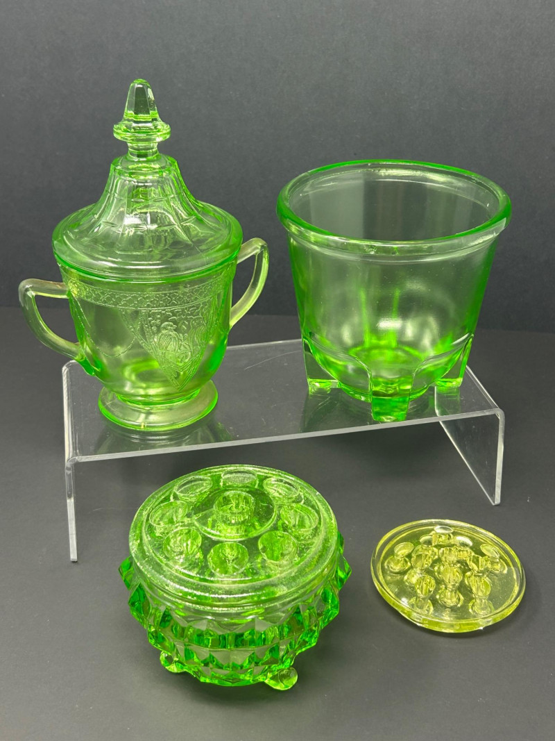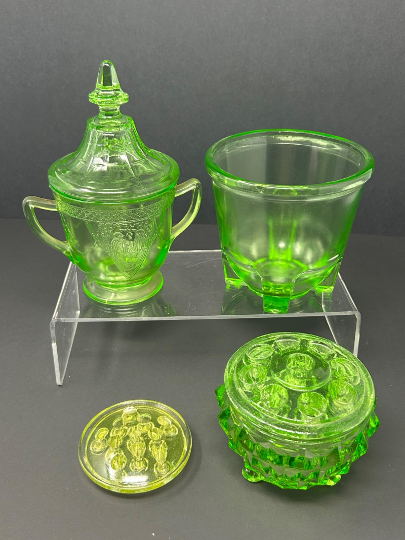 A curated grouping of vintage American uranium glass in vivid translucent green, exhibiting strong UV reactivity. This lot includes a covered sugar bowl with lid in the same pattern as the Federal Glass Georgian line, a Hazel-Atlas Glass Company measuring cup, and a coordinating uranium glass flower frog with base. Together, the pieces represent classic Depression-era pressed-glass design from the late 1920s through the 1930s, combining decorative tableware and functional utility forms. Pattern: Same pattern as Federal Glass Company Georgian (commonly referred to by collectors as Lovebirds) Date: Circa 1930s Dimensions: Approx. 7" H × 4" W Material: Uranium glass Color / Finish: Translucent green pressed glass Design: Bird-and-floral medallion within triangular paneling, twin handles, domed lid with finial Manufacturer: Hazel-Atlas Glass Company Date: Circa 1930s Dimensions: Approx. 5" tall Material: Uranium glass Color / Finish: Translucent green pressed glass Design: Kitchen utility measuring cup form; base embossed “PATENT APPLIED FOR” with HA monogram Date: Early 20th century Dimensions: Approx. 4" across × 4" tall Material: Uranium glass Color / Finish: Translucent green Design: Multi-hole flower frog seated in a matching base, coordinating in color and eraItem Details: