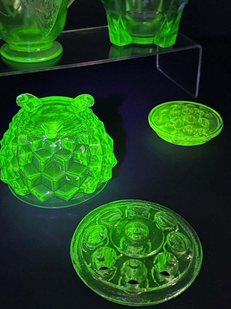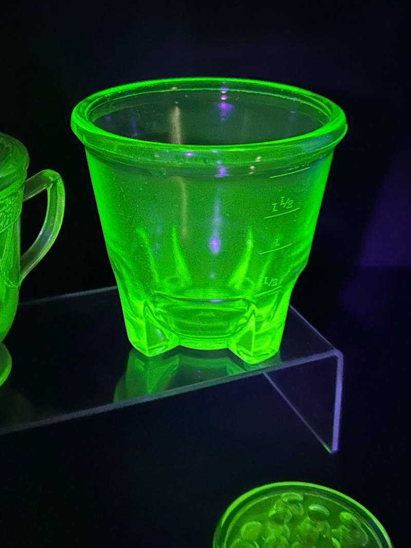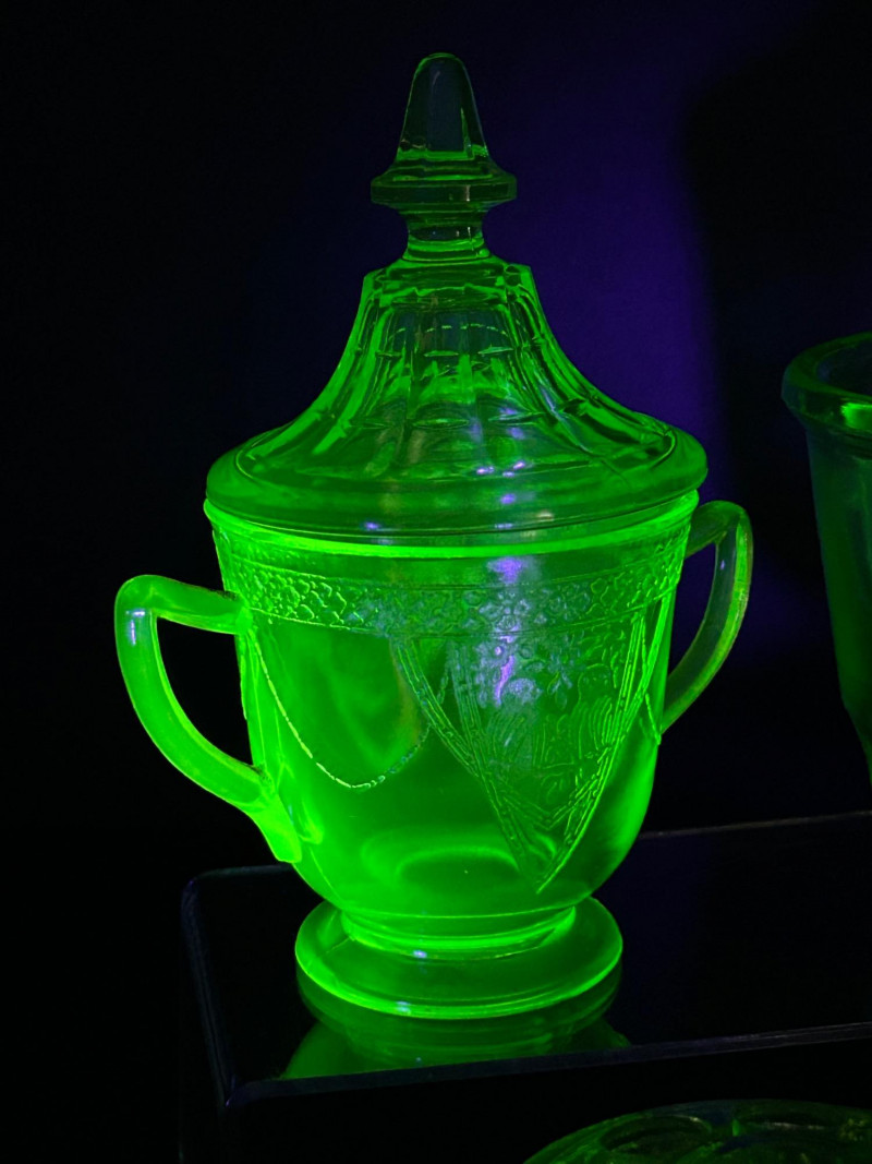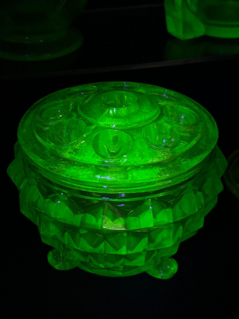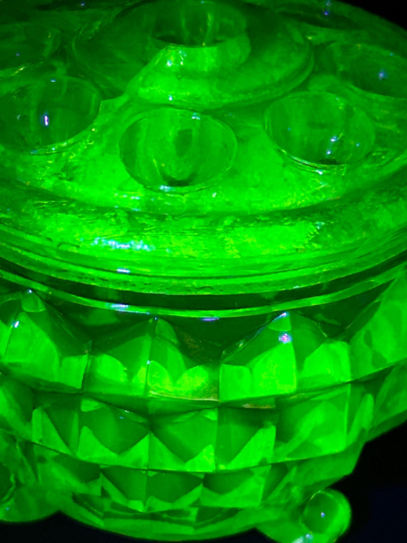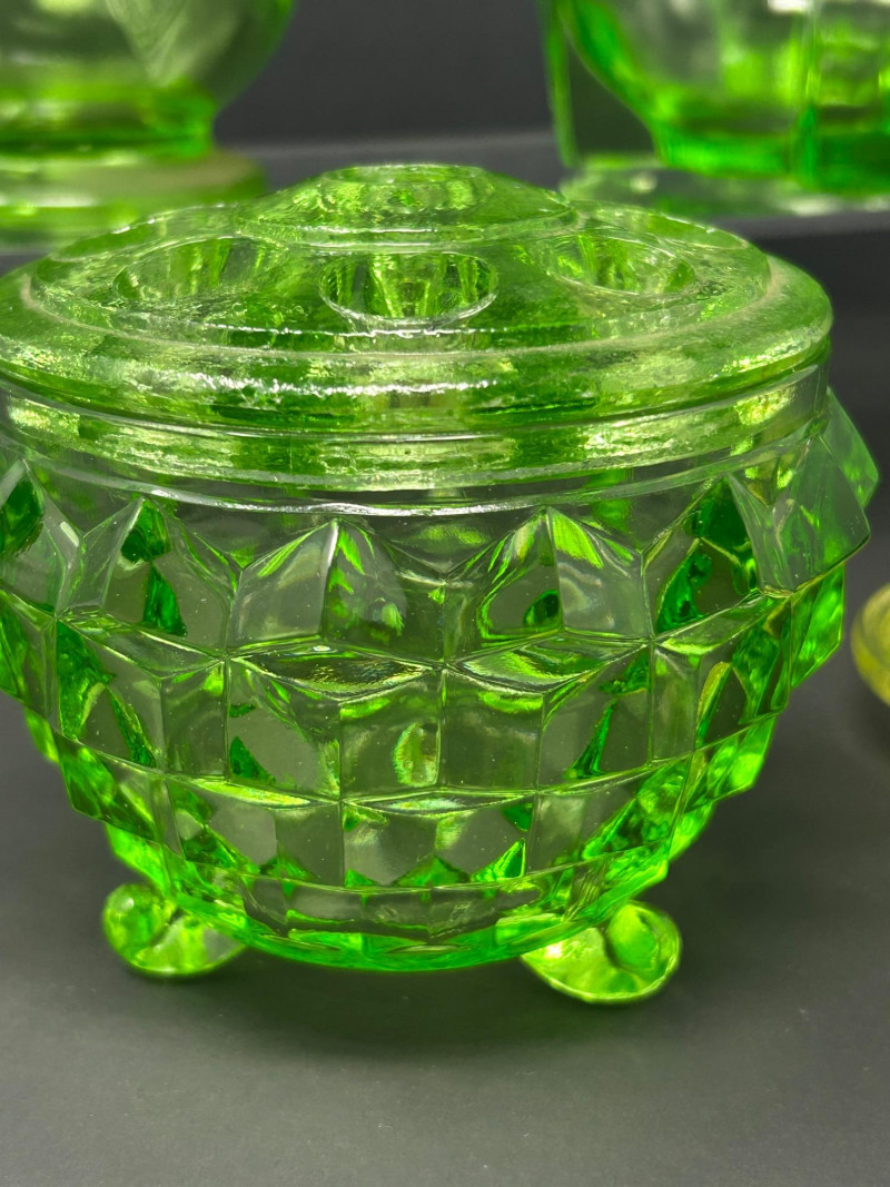 A curated grouping of vintage American uranium glass in vivid translucent green, exhibiting strong UV reactivity. This lot includes a covered sugar bowl with lid in the same pattern as the Federal Glass Georgian line, a Hazel-Atlas Glass Company measuring cup, and a coordinating uranium glass flower frog with base. Together, the pieces represent classic Depression-era pressed-glass design from the late 1920s through the 1930s, combining decorative tableware and functional utility forms. Pattern: Same pattern as Federal Glass Company Georgian (commonly referred to by collectors as Lovebirds) Date: Circa 1930s Dimensions: Approx. 7" H × 4" W Material: Uranium glass Color / Finish: Translucent green pressed glass Design: Bird-and-floral medallion within triangular paneling, twin handles, domed lid with finial Manufacturer: Hazel-Atlas Glass Company Date: Circa 1930s Dimensions: Approx. 5" tall Material: Uranium glass Color / Finish: Translucent green pressed glass Design: Kitchen utility measuring cup form; base embossed “PATENT APPLIED FOR” with HA monogram Date: Early 20th century Dimensions: Approx. 4" across × 4" tall Material: Uranium glass Color / Finish: Translucent green Design: Multi-hole flower frog seated in a matching base, coordinating in color and eraItem Details: