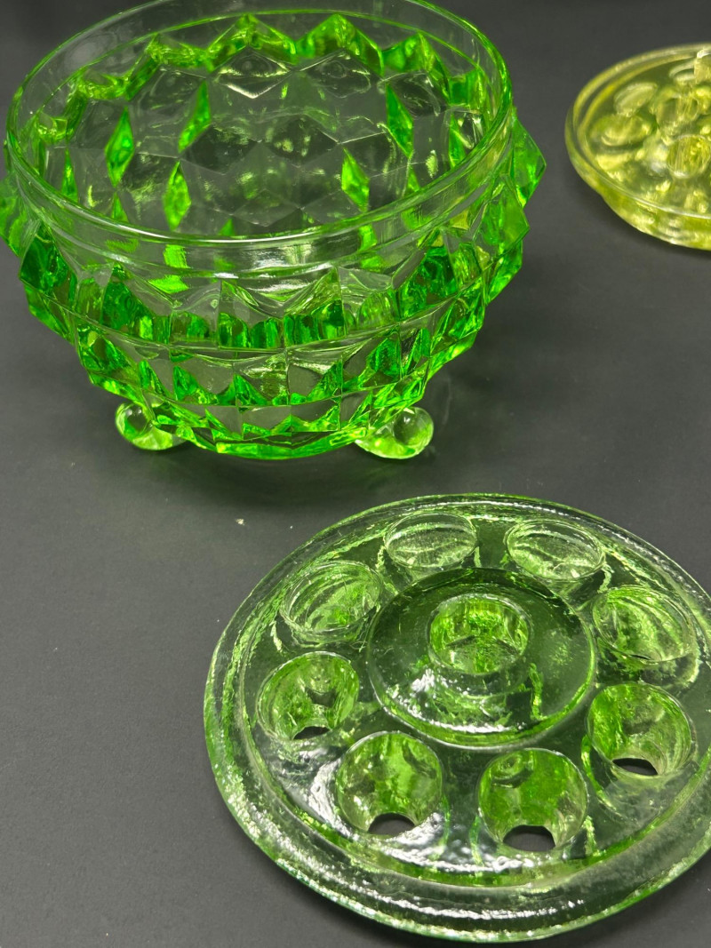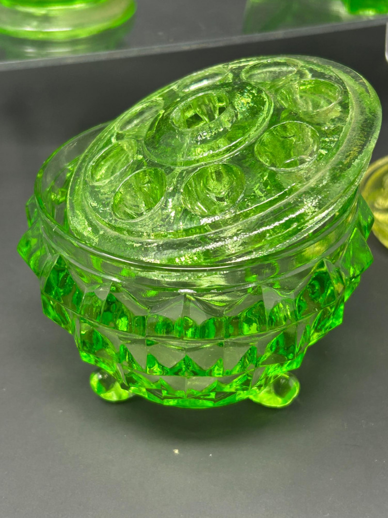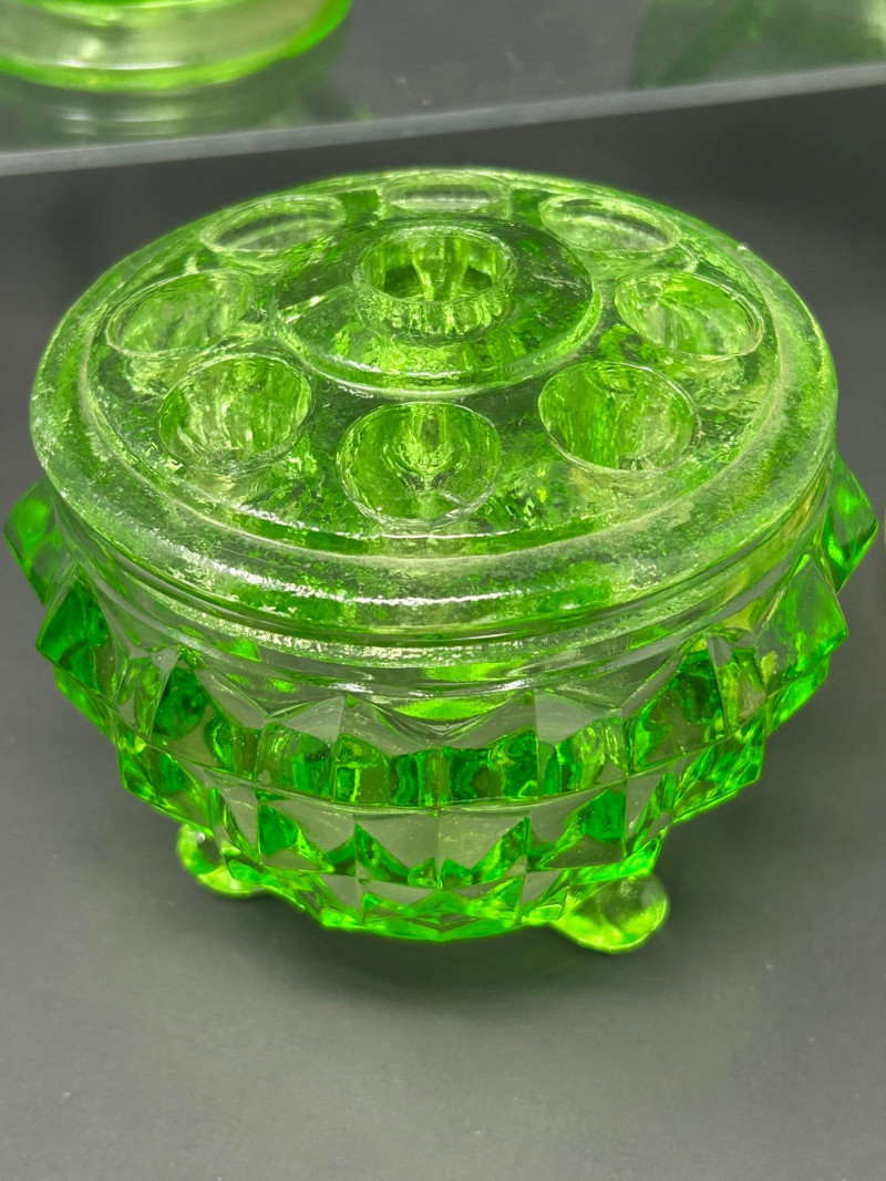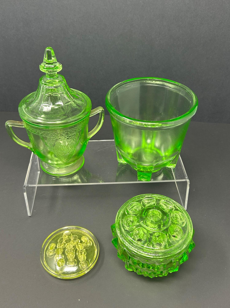 Lot # 38 - Uranium Glass Lot – Sugar Bowl with Lid, Measuring Cup & Flower Frog