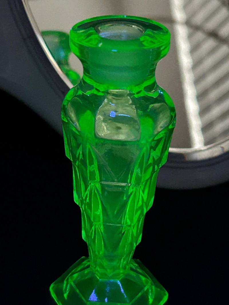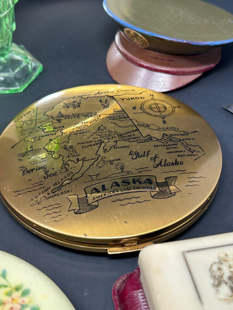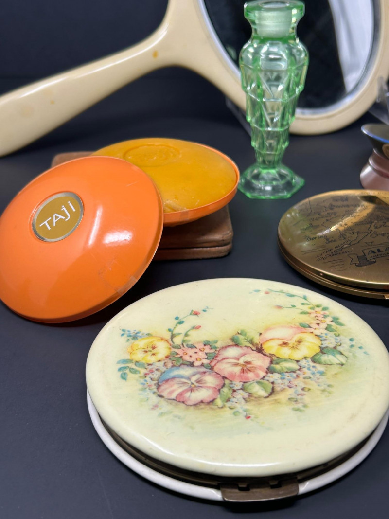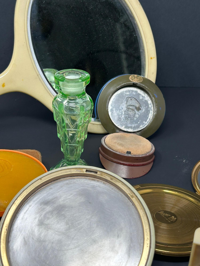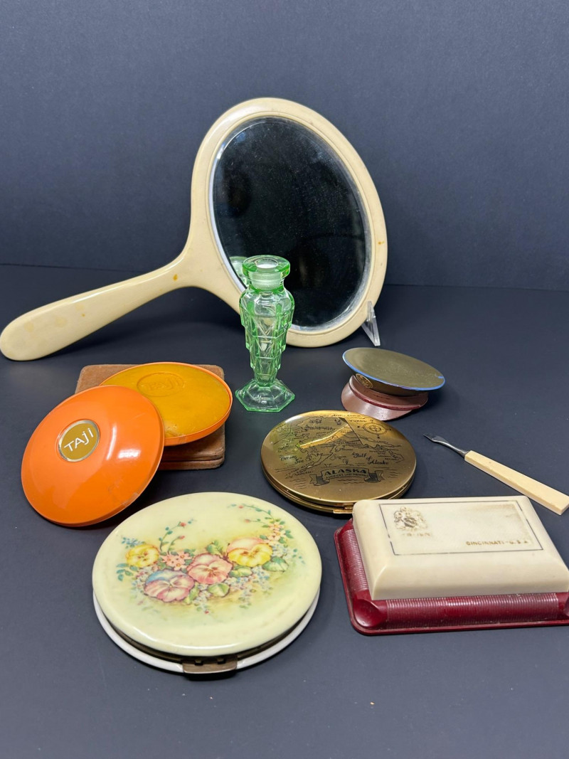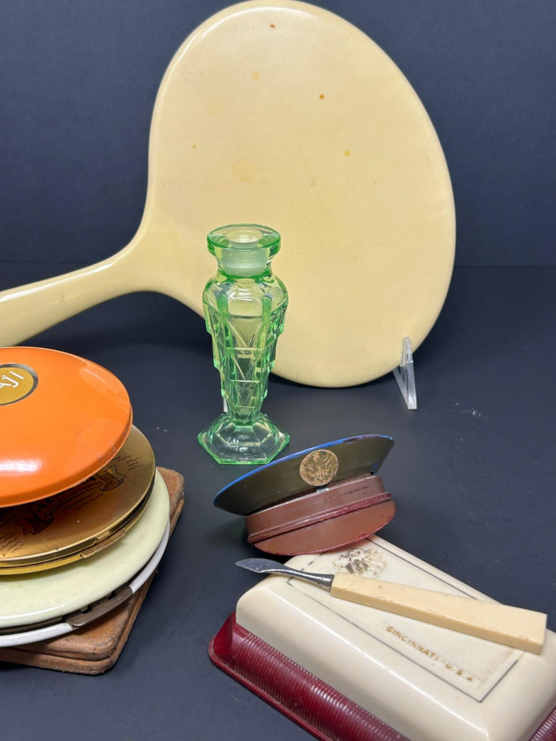 A charming and eclectic vintage vanity assortment featuring a striking uranium glass perfume bottle, a classic handheld mirror, and a variety of cosmetic and powder accessories. This mixed lot showcases early–mid 20th century personal grooming items, blending elegant glasswork, metal compacts, and decorative cases—perfect for collectors of vintage vanity pieces, uranium glass enthusiasts, or display décor. The uranium glass perfume bottle displays a faceted Art Deco–style form and glows beautifully under UV light. Accompanying pieces include multiple powder compacts with decorative lids, an Alaska souvenir compact, vintage cosmetic boxes, and a handheld mirror with a cream-colored frame. Together, they create a nostalgic snapshot of classic vanity culture. Uranium Glass Perfume Bottle Height: approx. 4.5 inches Faceted design, bright green uranium glass Glows under UV light Handheld Vanity Mirror Approx. 11 inches tall x 8 inches wide Cream-toned frame with classic oval mirror Additional Items: Assorted vintage powder compacts (metal & decorative finishes) Souvenir Alaska compact Vintage cosmetic/powder boxes Small vanity tool (included as found)Details: