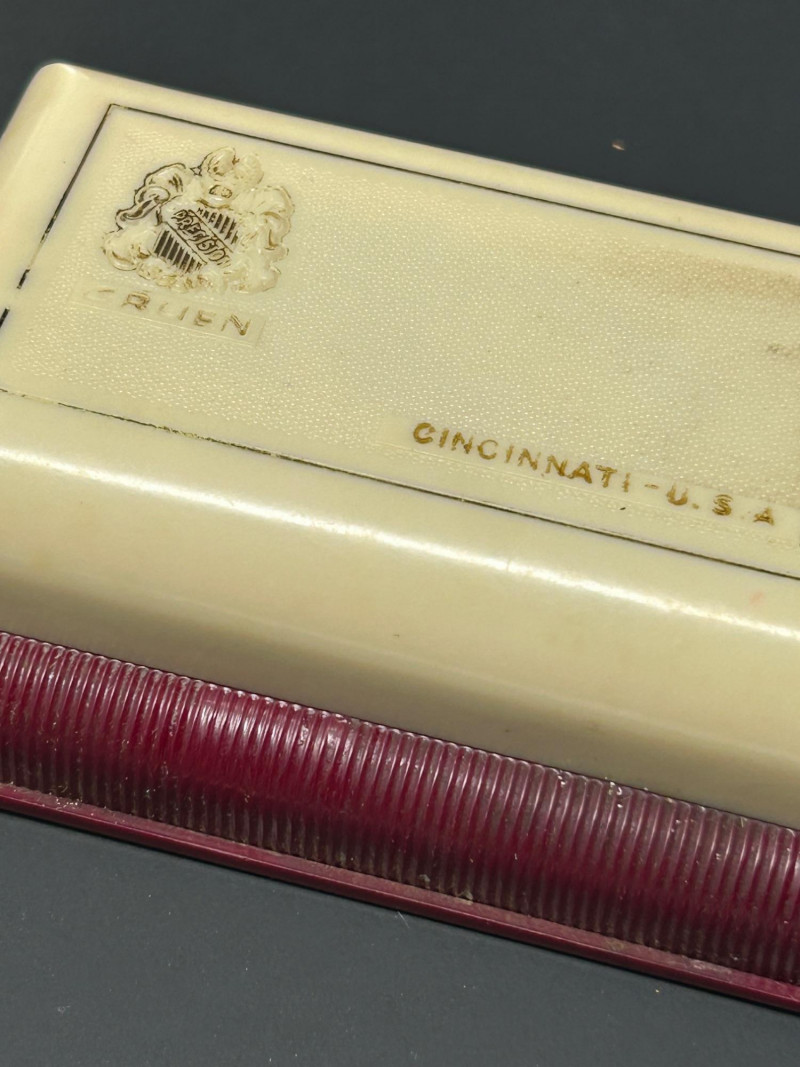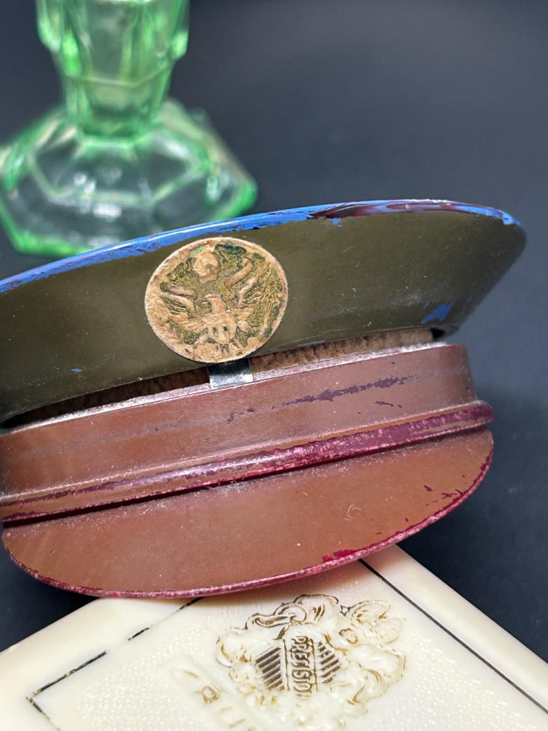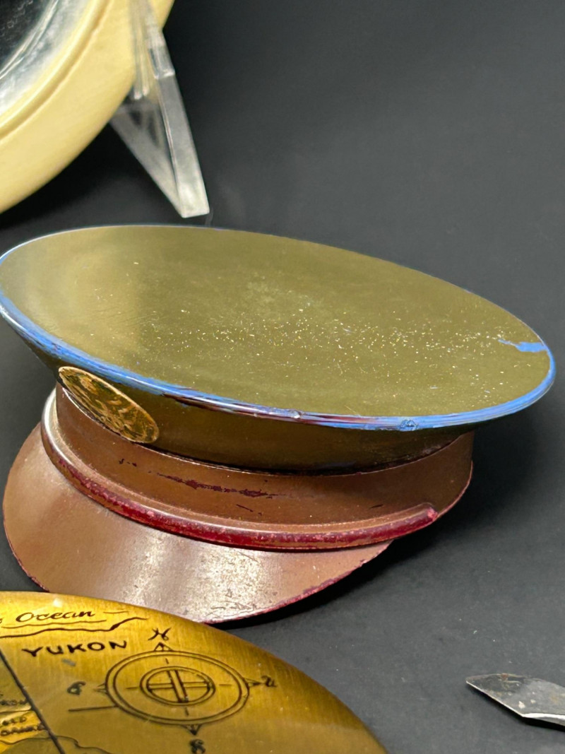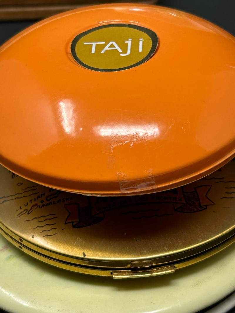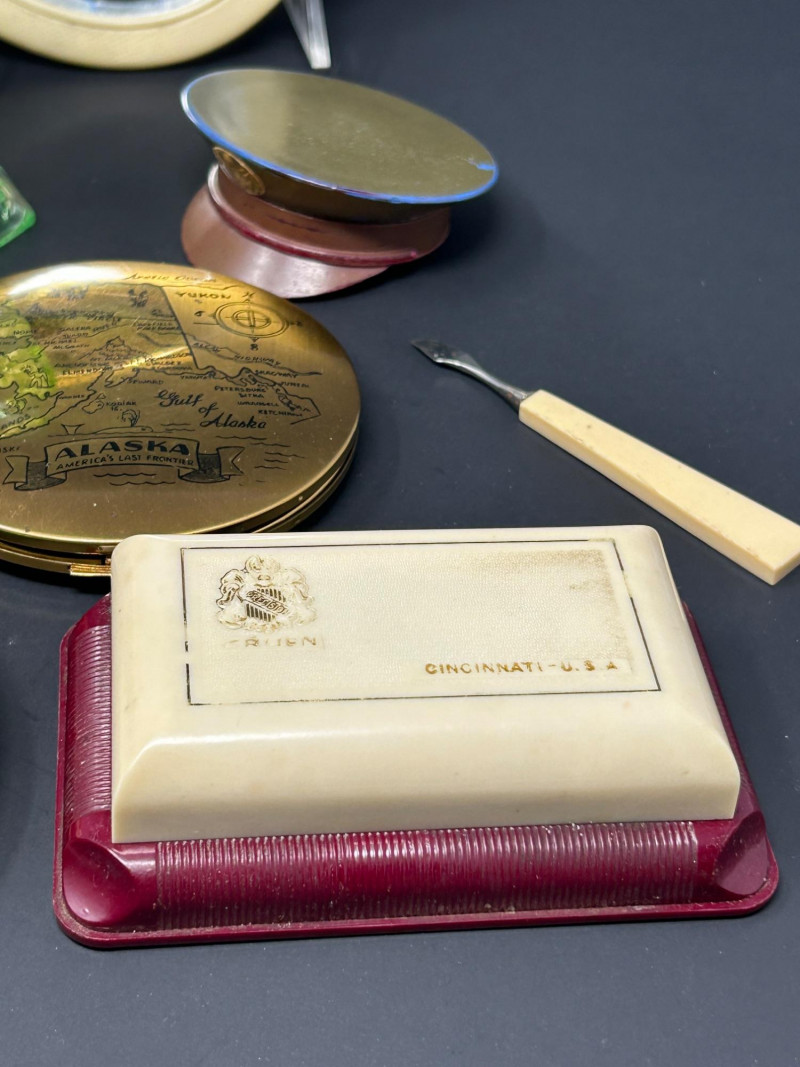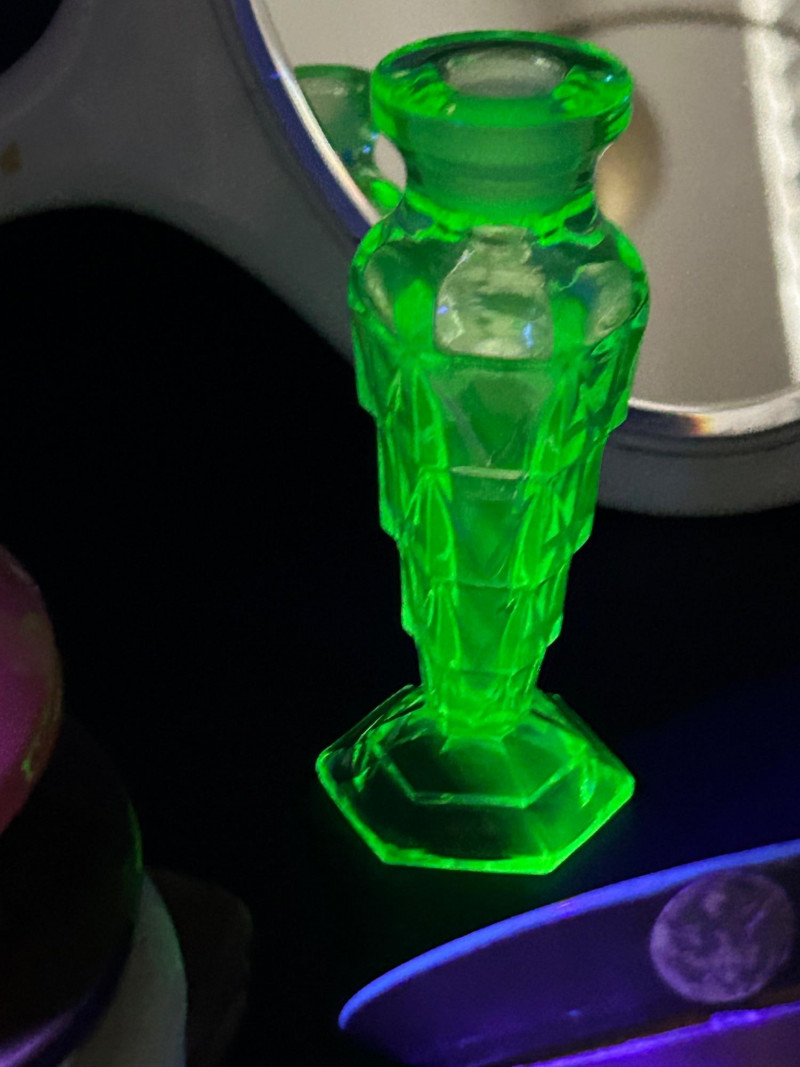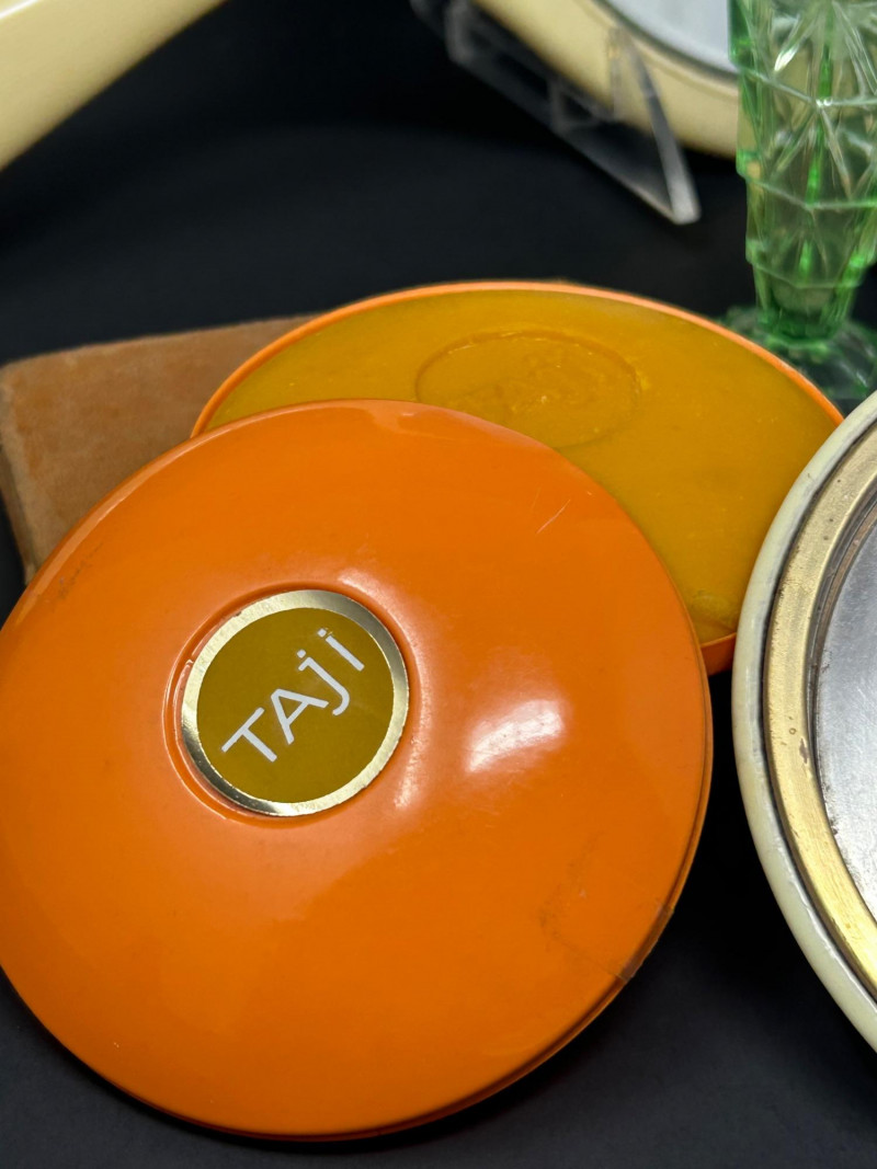 A charming and eclectic vintage vanity assortment featuring a striking uranium glass perfume bottle, a classic handheld mirror, and a variety of cosmetic and powder accessories. This mixed lot showcases early–mid 20th century personal grooming items, blending elegant glasswork, metal compacts, and decorative cases—perfect for collectors of vintage vanity pieces, uranium glass enthusiasts, or display décor. The uranium glass perfume bottle displays a faceted Art Deco–style form and glows beautifully under UV light. Accompanying pieces include multiple powder compacts with decorative lids, an Alaska souvenir compact, vintage cosmetic boxes, and a handheld mirror with a cream-colored frame. Together, they create a nostalgic snapshot of classic vanity culture. Uranium Glass Perfume Bottle Height: approx. 4.5 inches Faceted design, bright green uranium glass Glows under UV light Handheld Vanity Mirror Approx. 11 inches tall x 8 inches wide Cream-toned frame with classic oval mirror Additional Items: Assorted vintage powder compacts (metal & decorative finishes) Souvenir Alaska compact Vintage cosmetic/powder boxes Small vanity tool (included as found)Details: