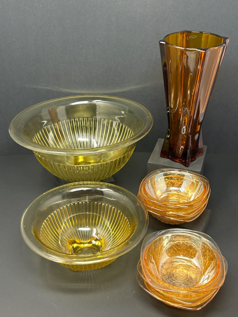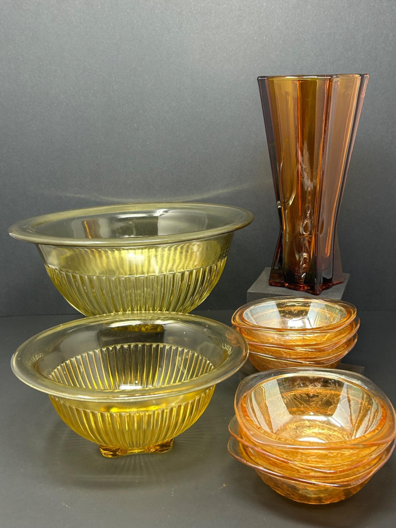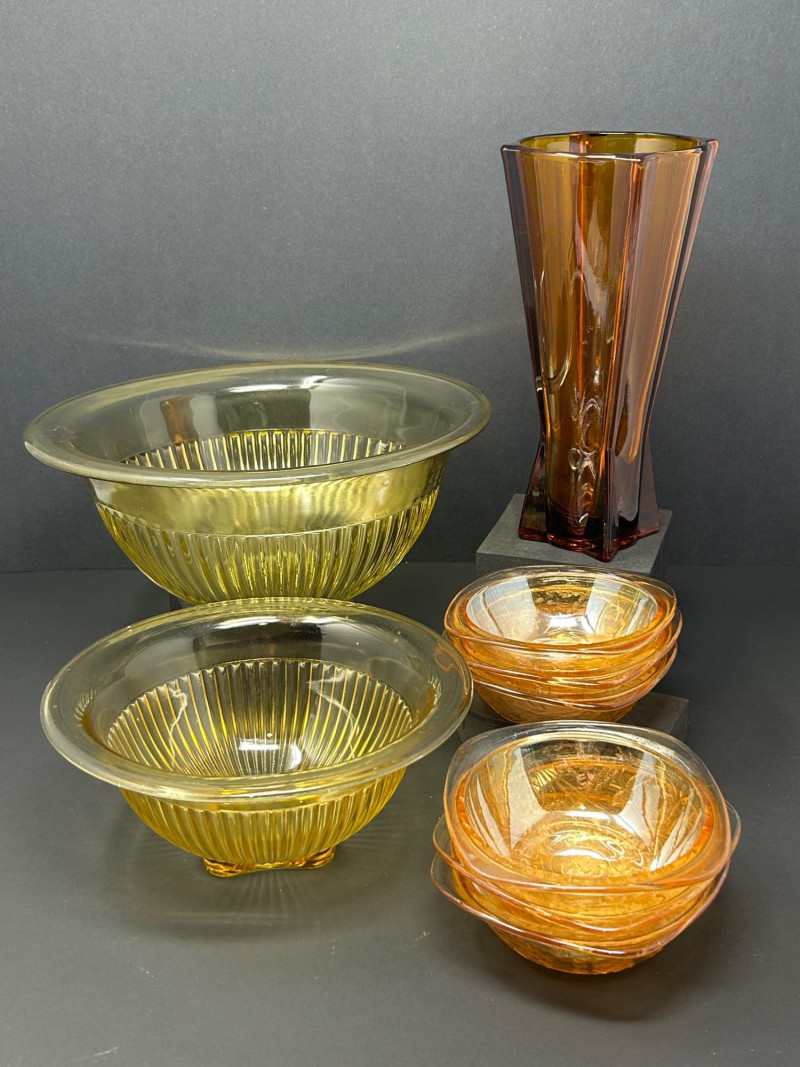 Lot # 43 - Golden Amber Glass Lot – Bowls & Faceted Art Glass Vase