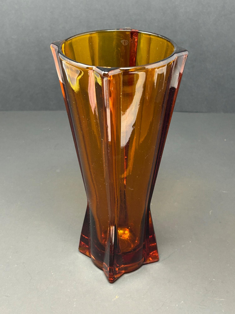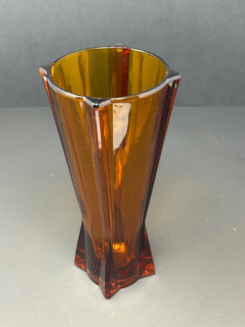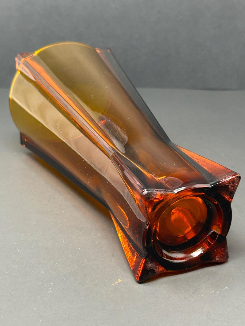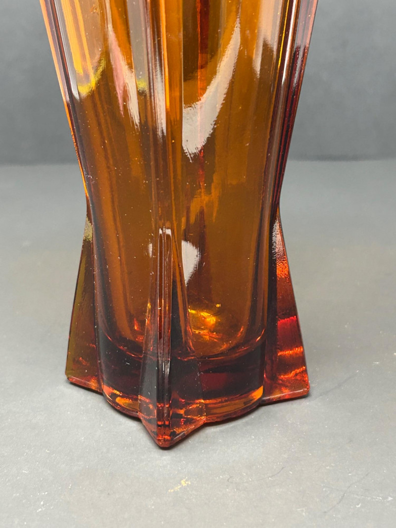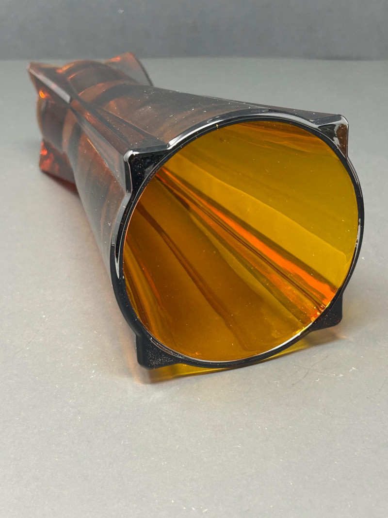 Color / Finish: Deep amber glass with vertical faceting and sculptural base