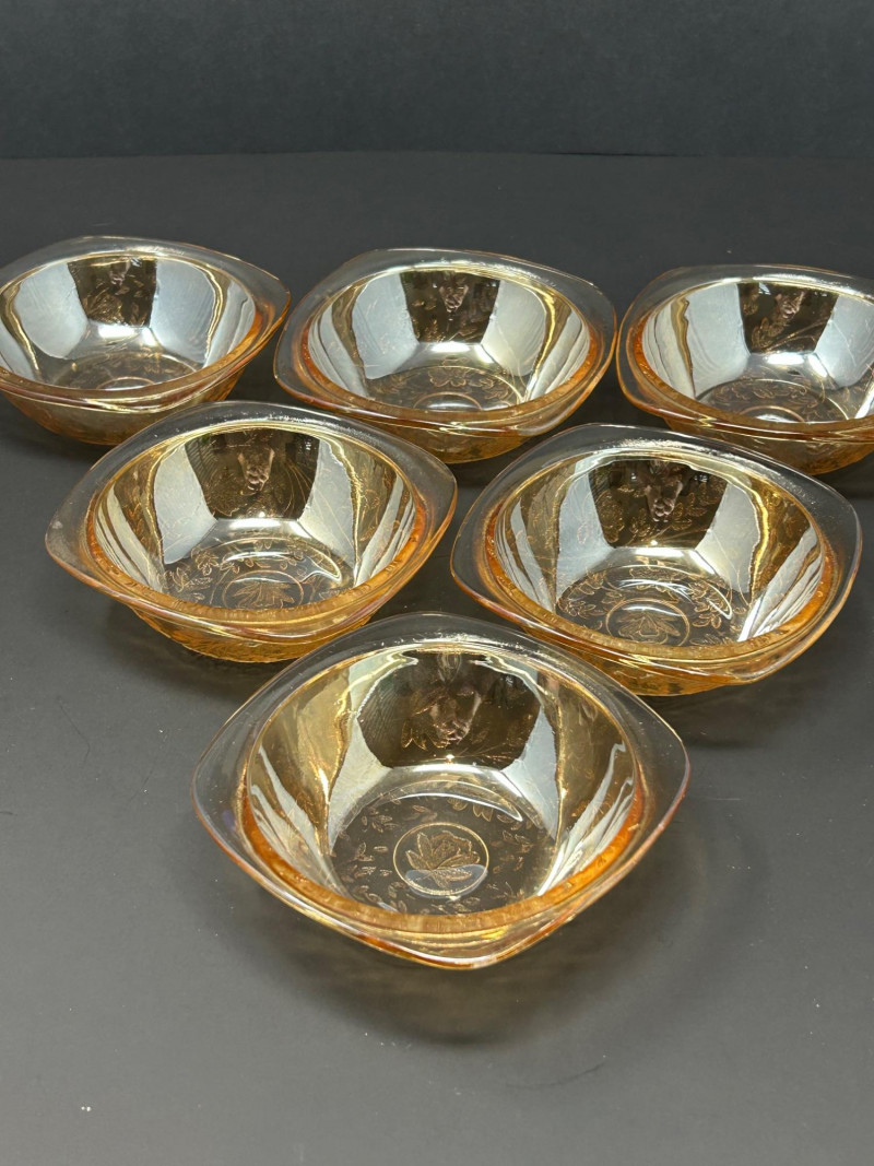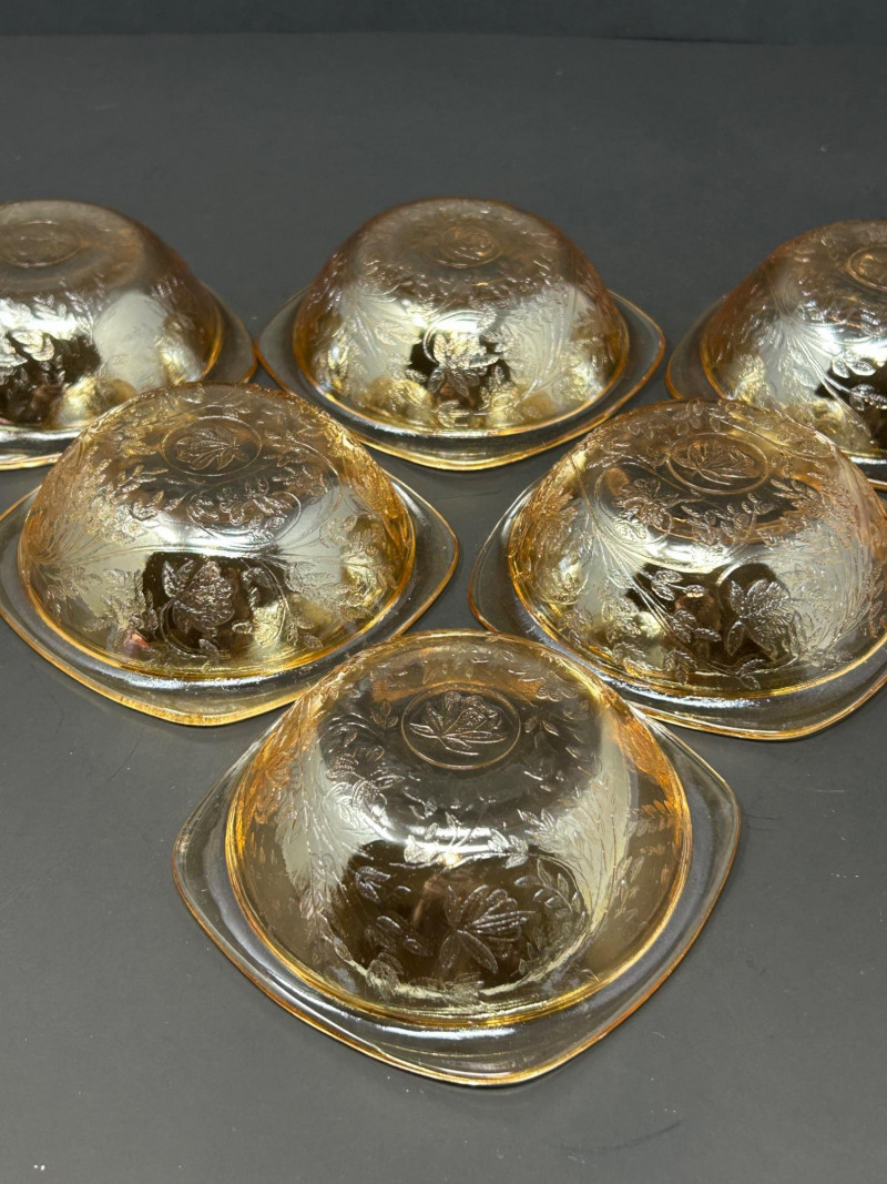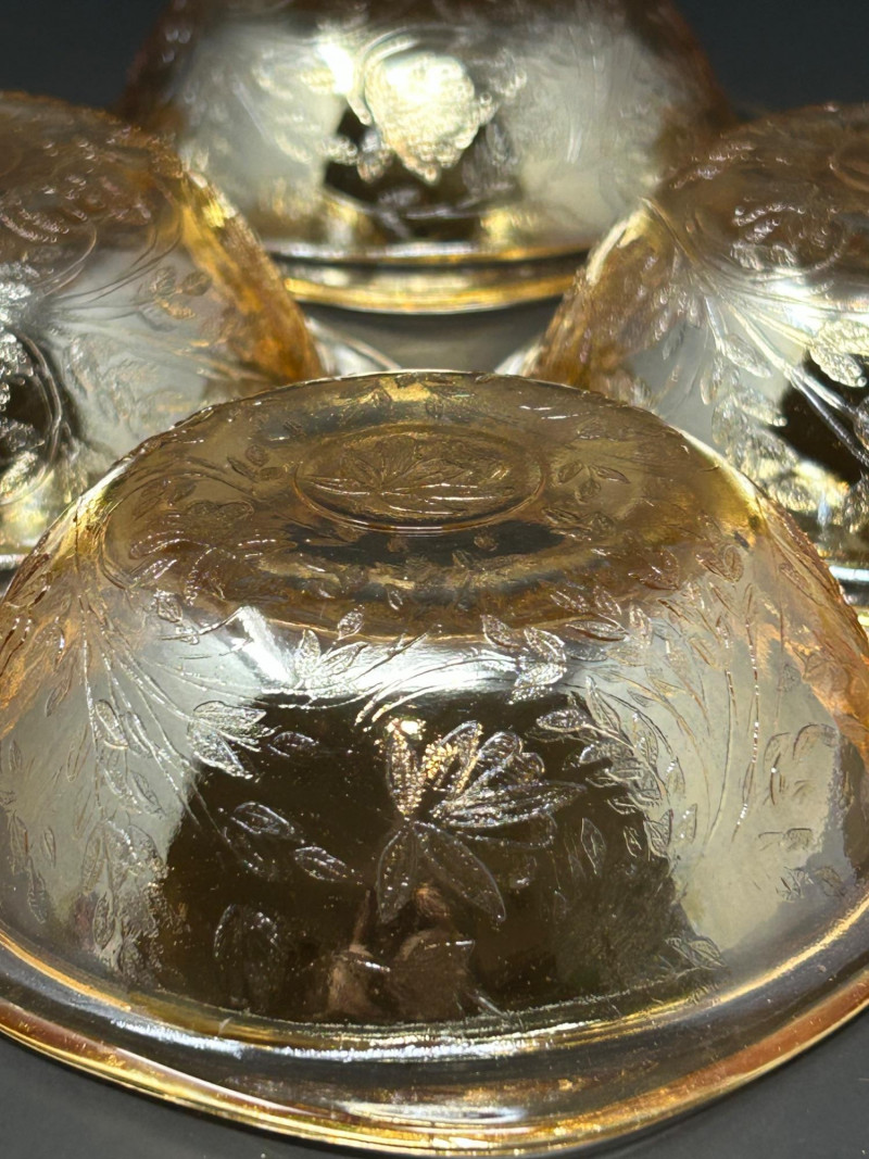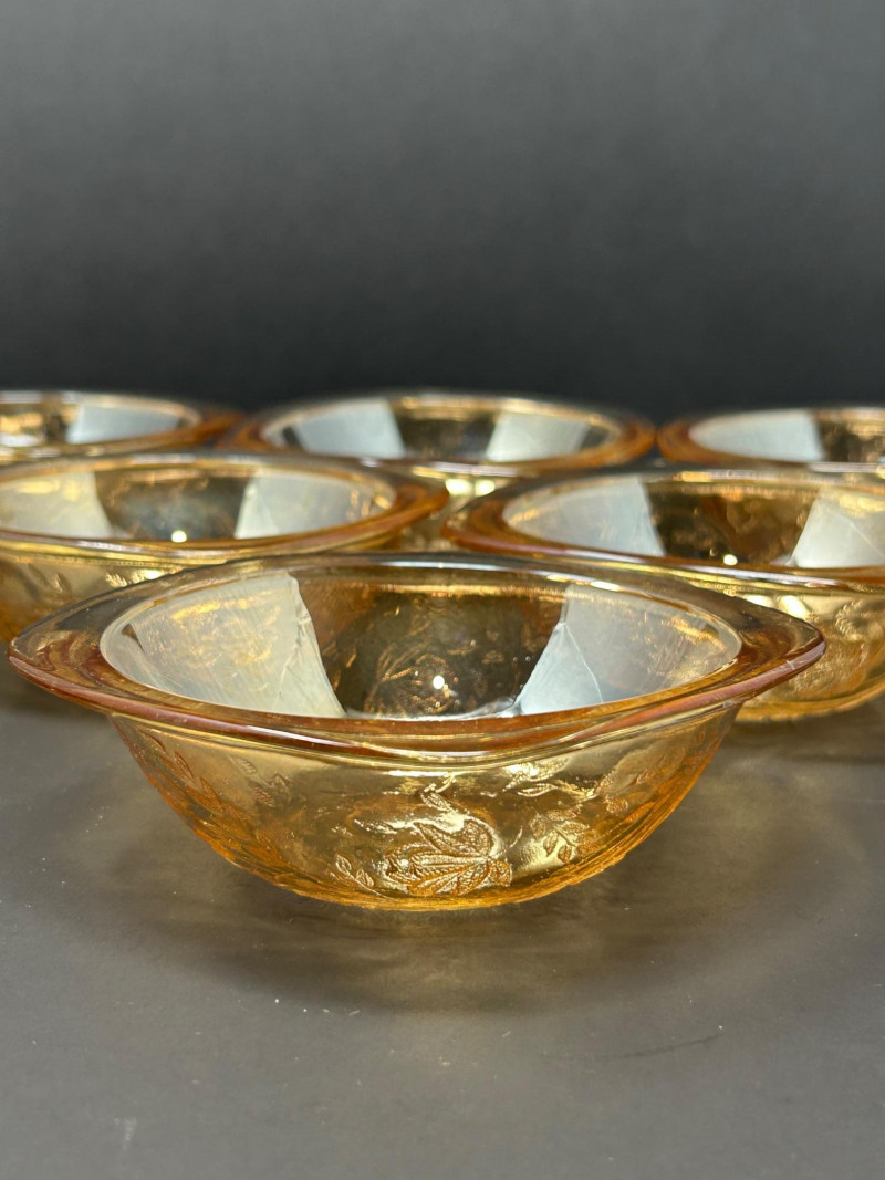Notes: Possibly produced by a major American glass manufacturer of the period, such as Jeanette Glass or Anchor HockingAmber Floral-Etched Dessert Bowls