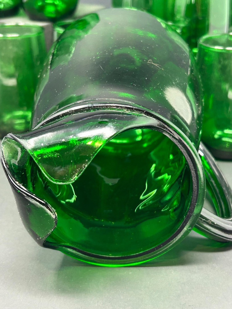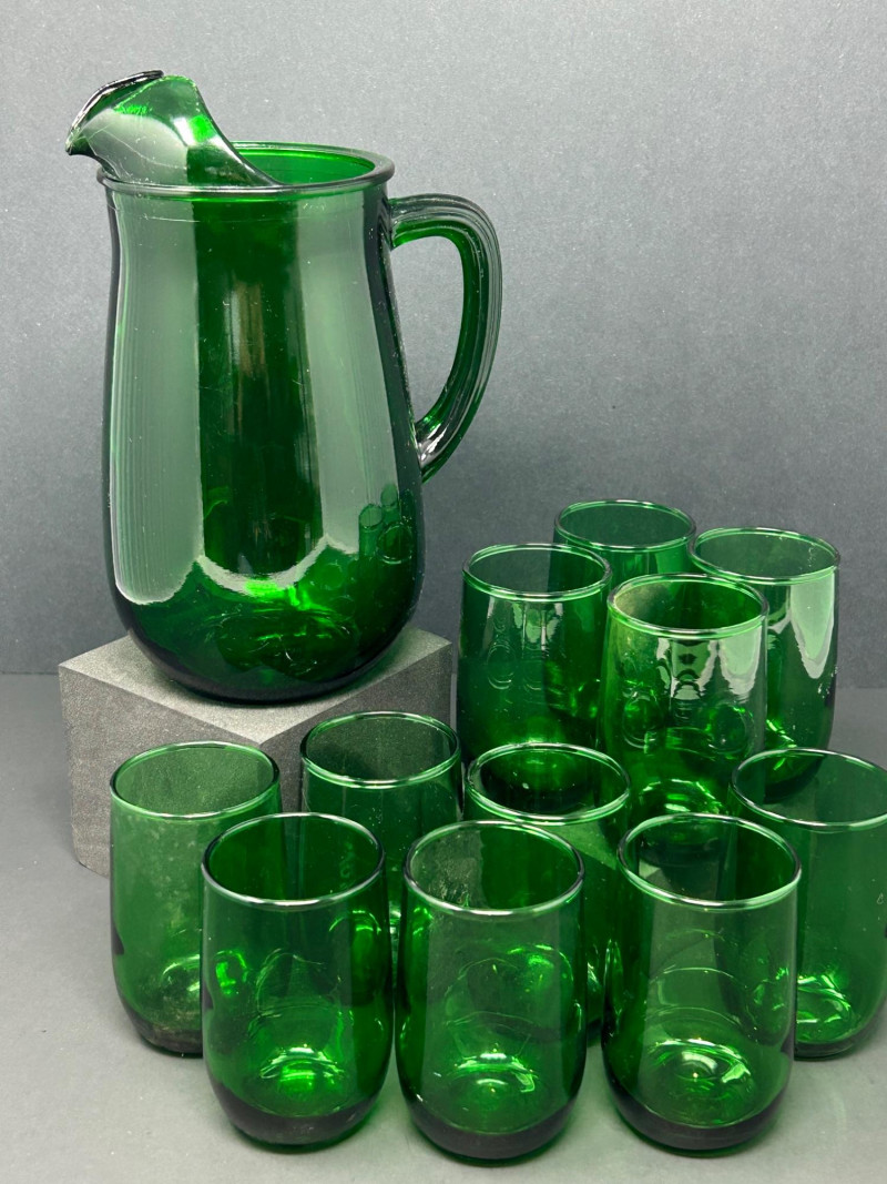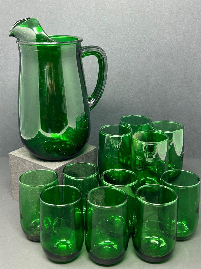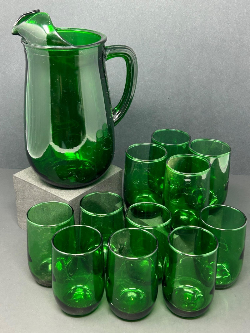 Classic mid-century green glass beverage set, likely produced by Anchor Hocking, featuring a forest green ice-lip pitcher paired with eleven matching juice tumblers. The color, form, and proportions closely match documented Anchor Hocking Forest Green glassware from the 1950s–1960s. The pitcher features a distinctive ice-lip spout designed to retain ice while pouring, along with a sturdy applied handle and thick base. The cylindrical tumblers have clean lines and weighted bases, consistent with known Anchor Hocking juice glasses in this color. Maker: Likely Anchor Hocking Color: Forest Green Era: Mid-Century (circa 1950s–1960s) Material: Pressed glass Includes: (1) Ice-lip handled pitcher (11) Matching juice tumblers Pitcher: approx. 8" tall × 6" across (including handle) Tumblers: approx. 3.5" tallDetails: